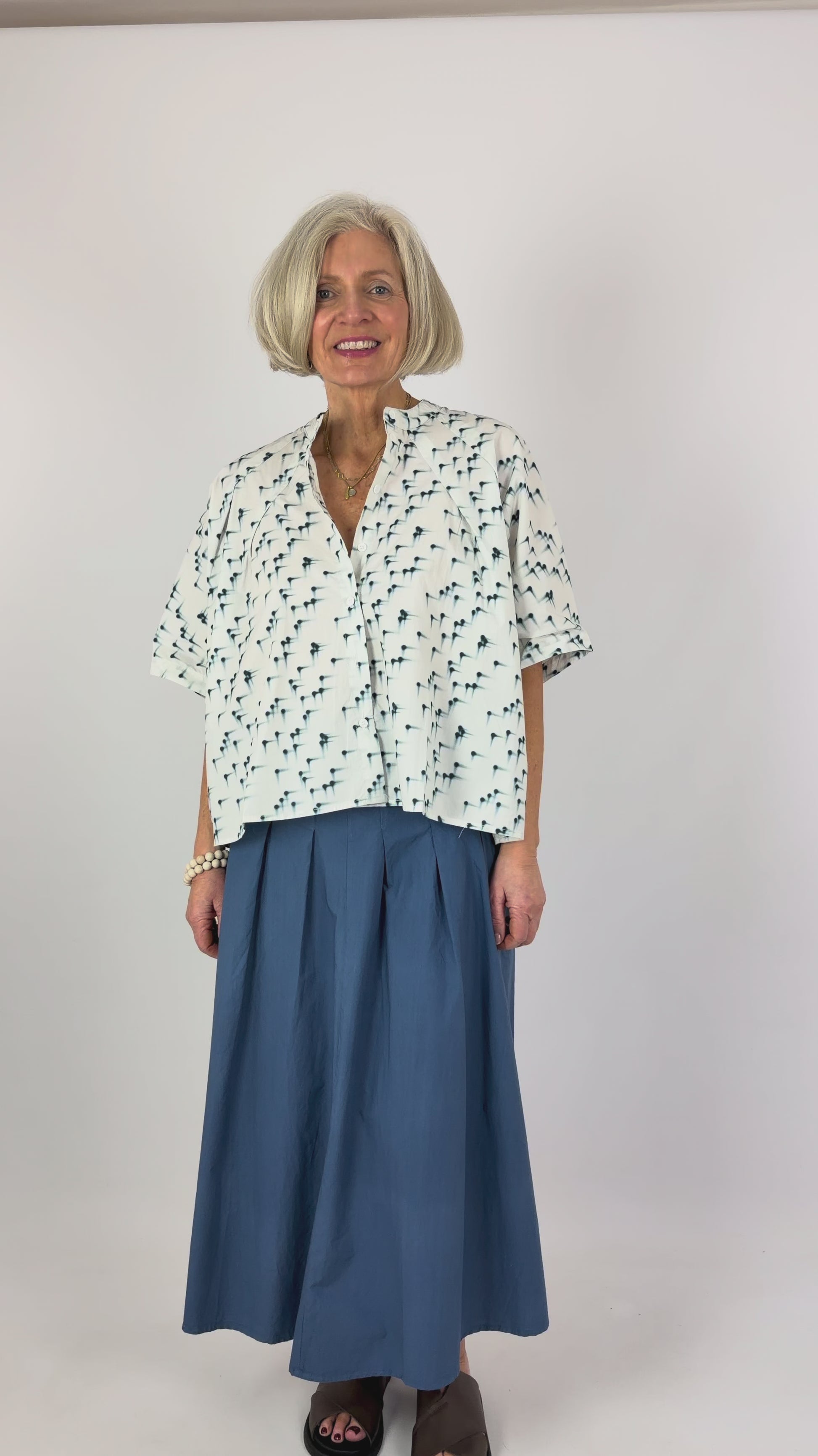 Crafted from printed cotton poplin, this oversized shirt delivers effortless sophistication with a striking stylized polka dot pattern in marine and white. The distinctive Mao collar features precisely stitched pleats for architectural detail, while short sleeves offer versatile layering potential. A relaxed silhouette makes it equally suited to casual styling or elevated everyday wear.