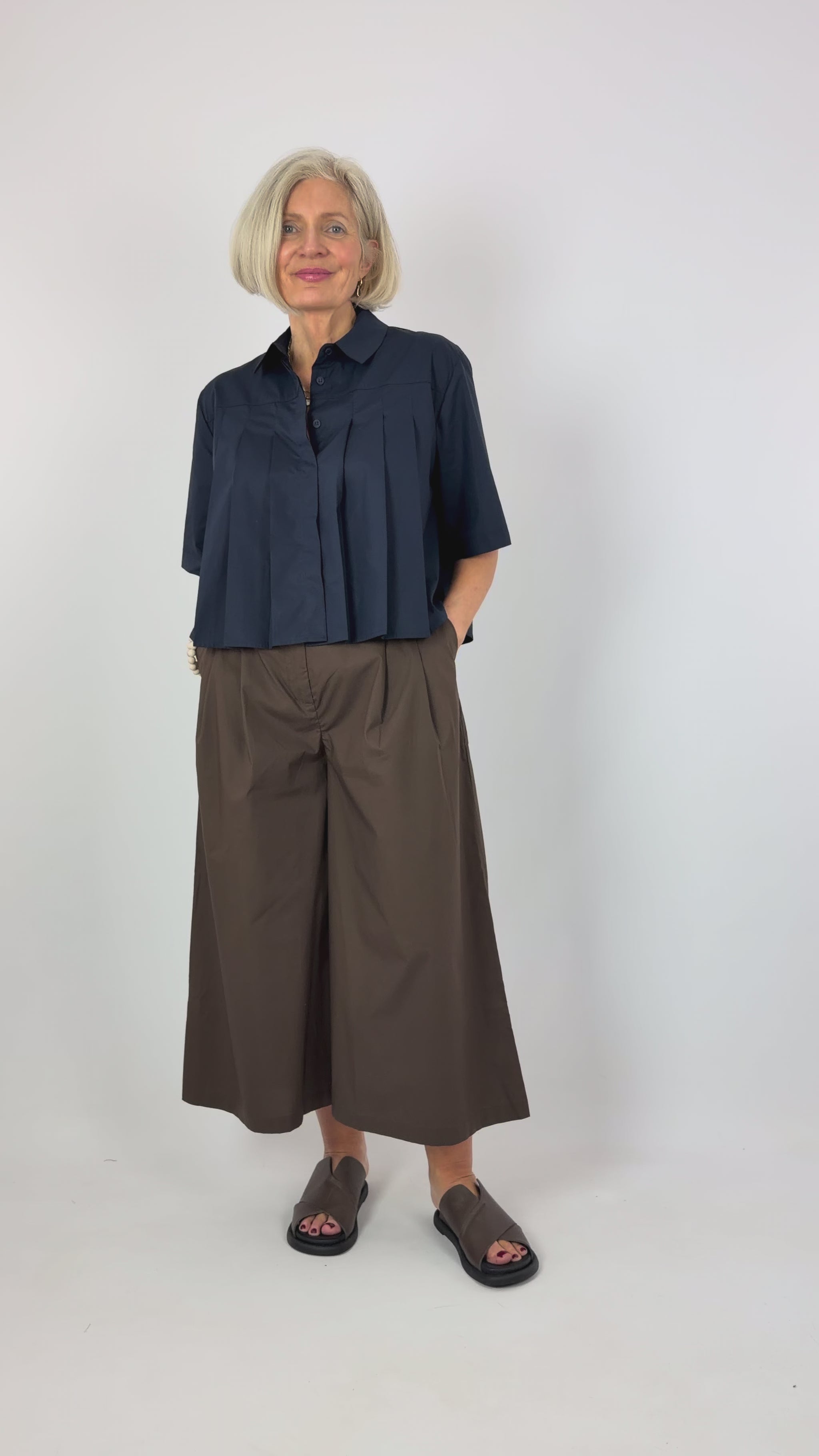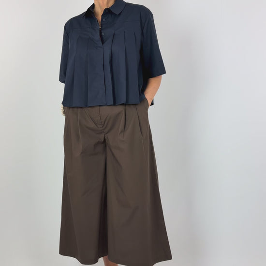 Crafted from crisp cotton poplin, this pleated shirt combines timeless tailoring with contemporary ease. Vertical stitched pleats beneath the front yoke create subtle dimension and movement, while the slightly flared silhouette offers a refined, flattering fit. Short sleeves make it ideal for layering or wearing solo across seasons. A versatile wardrobe essential that transitions effortlessly from office to weekend.