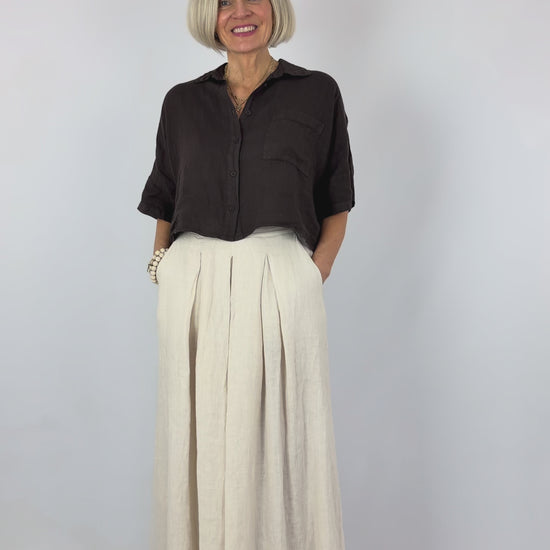 Crafted from pure linen, this boxy blouse delivers effortless sophistication with its relaxed silhouette and structured collar. The front button closure and single breast pocket provide practical styling, while short sleeves offer breathable comfort for warmer seasons. A timeless navy hue ensures versatility across your wardrobe, making this piece an essential layering piece or standalone statement.