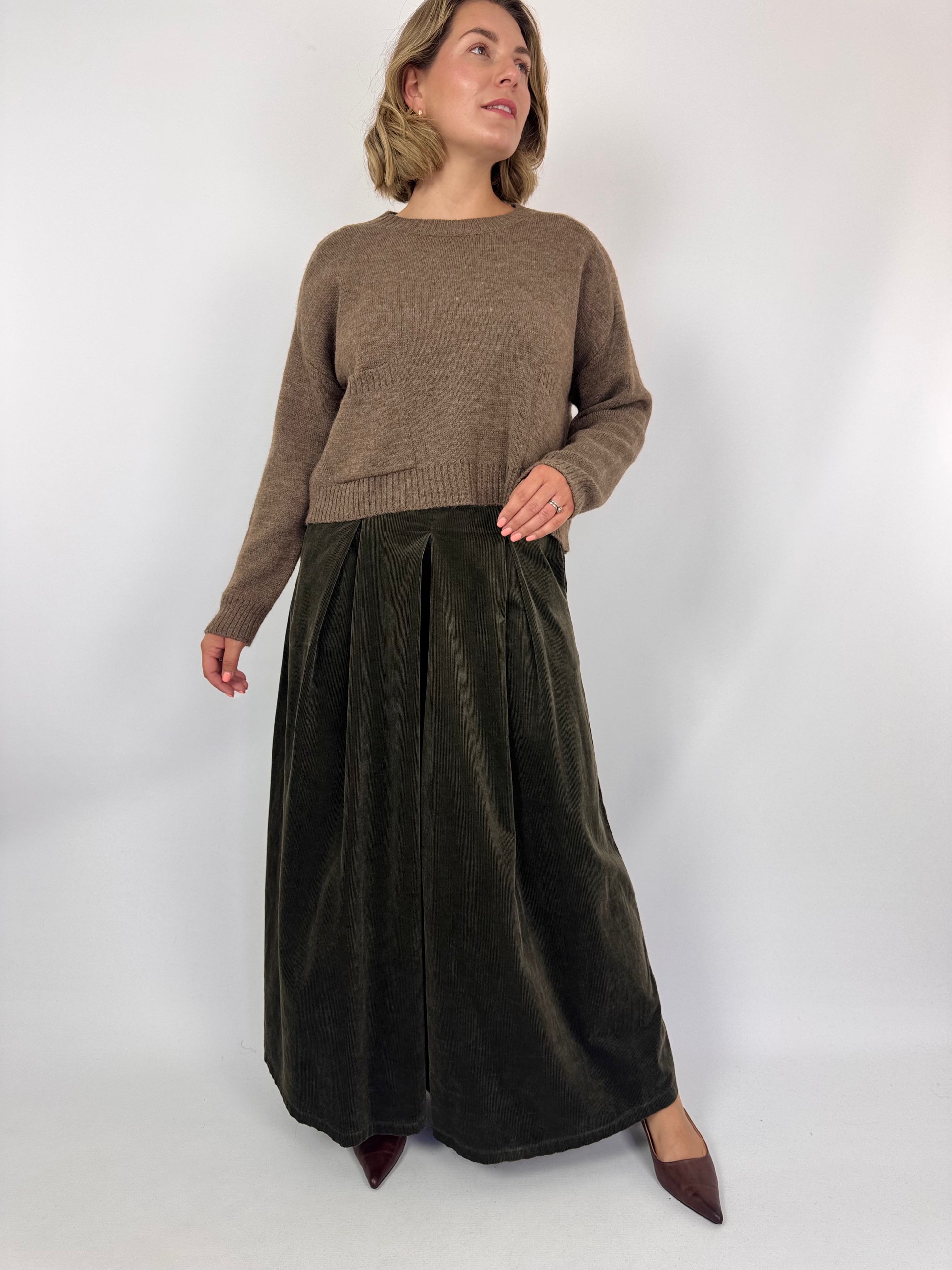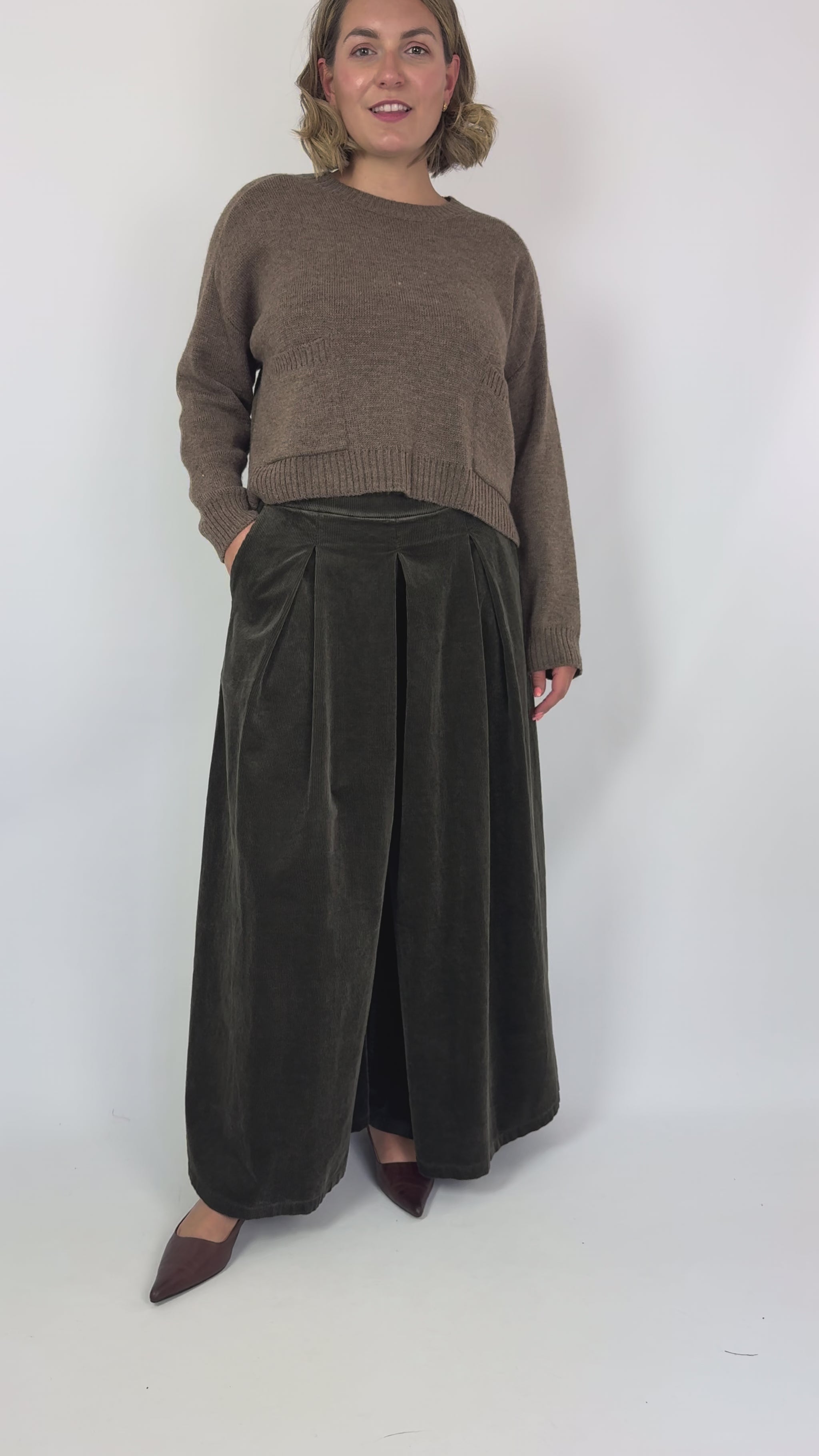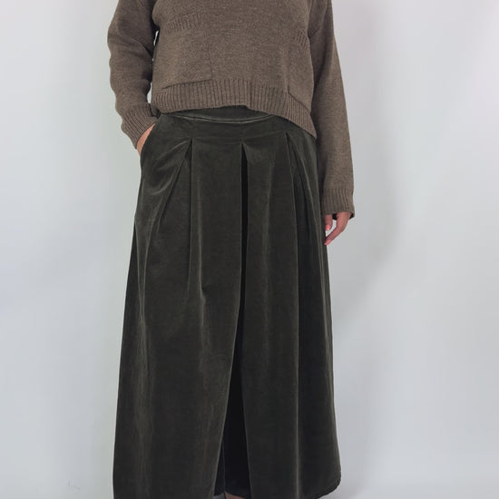 These Humility Turbo Trousers in dark green feature a flared leg silhouette with a refined front pleat, crafted from soft baby corduroy for a luxurious feel. The elasticated waistband at the back ensures a comfortable, flexible fit, while discreet side seam pockets add practical functionality. Ideal for a sophisticated yet relaxed look, these trousers combine expert tailoring with premium materials for lasting style and wear.