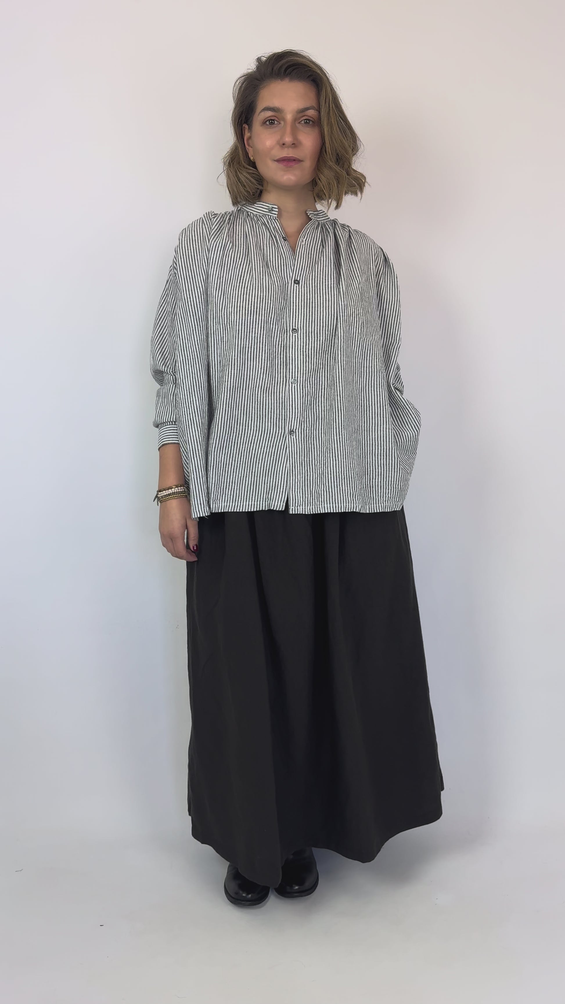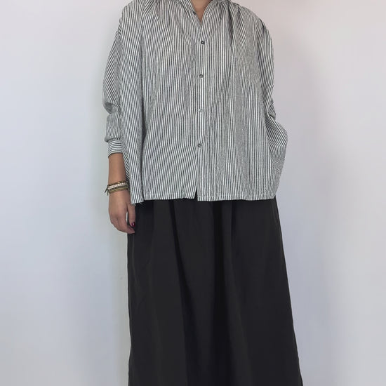 Crafted from soft linen, the Ichi Antiquities 304 Shirt White Stripe offers a relaxed, loose fit ideal for effortless comfort. Featuring a grey and white stripe pattern and a distinctive grandad-style neckline, this shirt combines timeless style with modern ease. The button-front design and gathered shoulder seams add subtle detailing, enhancing both form and function. Perfect for those who appreciate refined casual wear with expert tailoring.