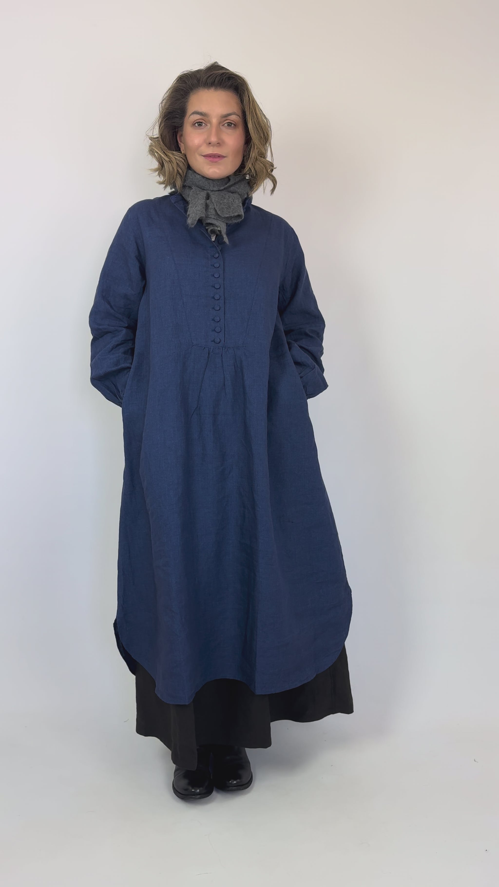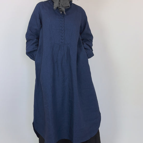 The Ichi Antiquities 314 Dress in Indigo features a sophisticated long-line silhouette with an elegant round neckline. Crafted using rich indigo dye, this dress exudes timeless appeal and depth of color. The front is secured with covered button fastening, offering a refined finish while ensuring ease of wear. Its combination of classic design details and artisanal dyeing techniques makes it a versatile choice for those seeking understated elegance with expert craftsmanship. Worn in imaged with the Ichi Antiquities 303 Skirt underneath.