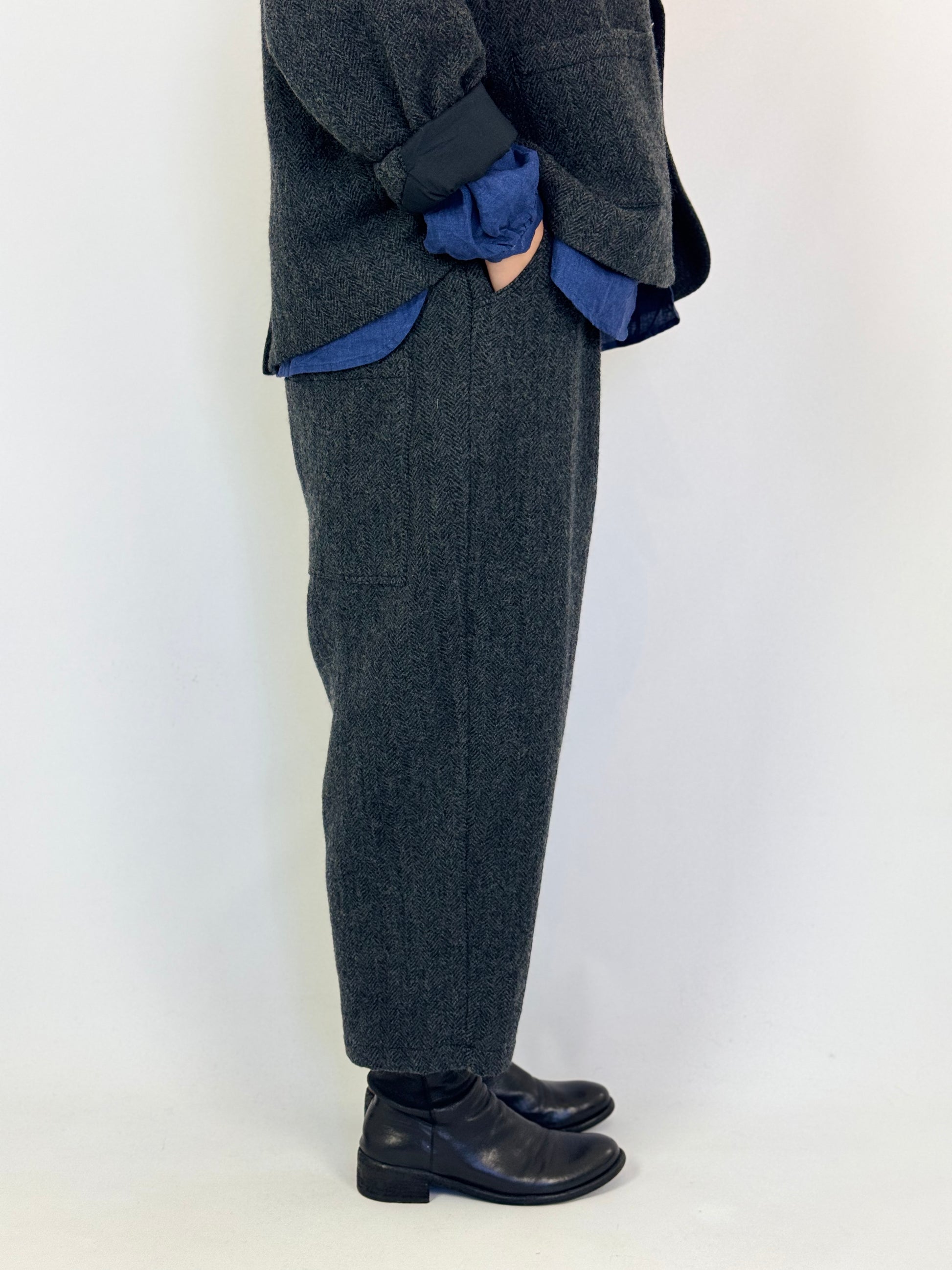 Crafted in classic herringbone wool, the Ichi Antiquities 320 Trousers offer a refined loose fit combined with an elasticated waistline for exceptional comfort. Practical side pockets add functionality, while the timeless design pairs seamlessly with the matching jacket, creating a sophisticated and coordinated look ideal for both professional and smart-casual settings.