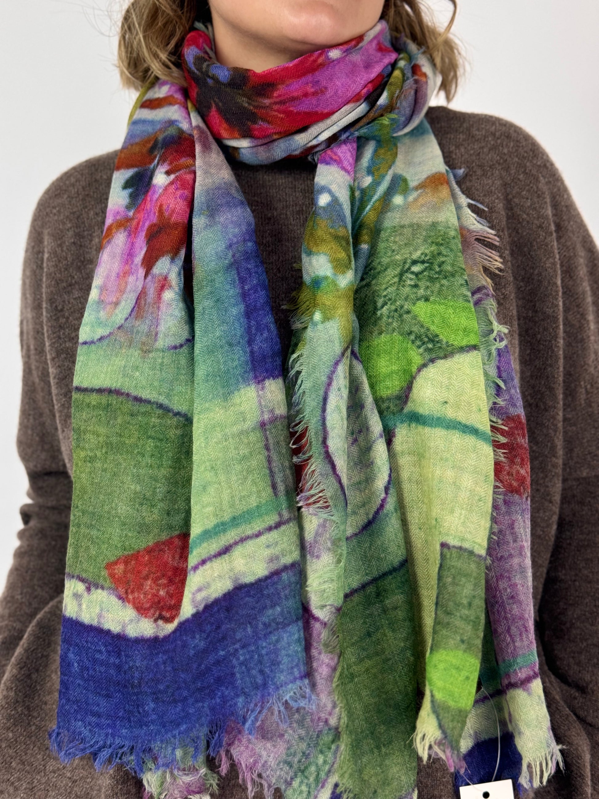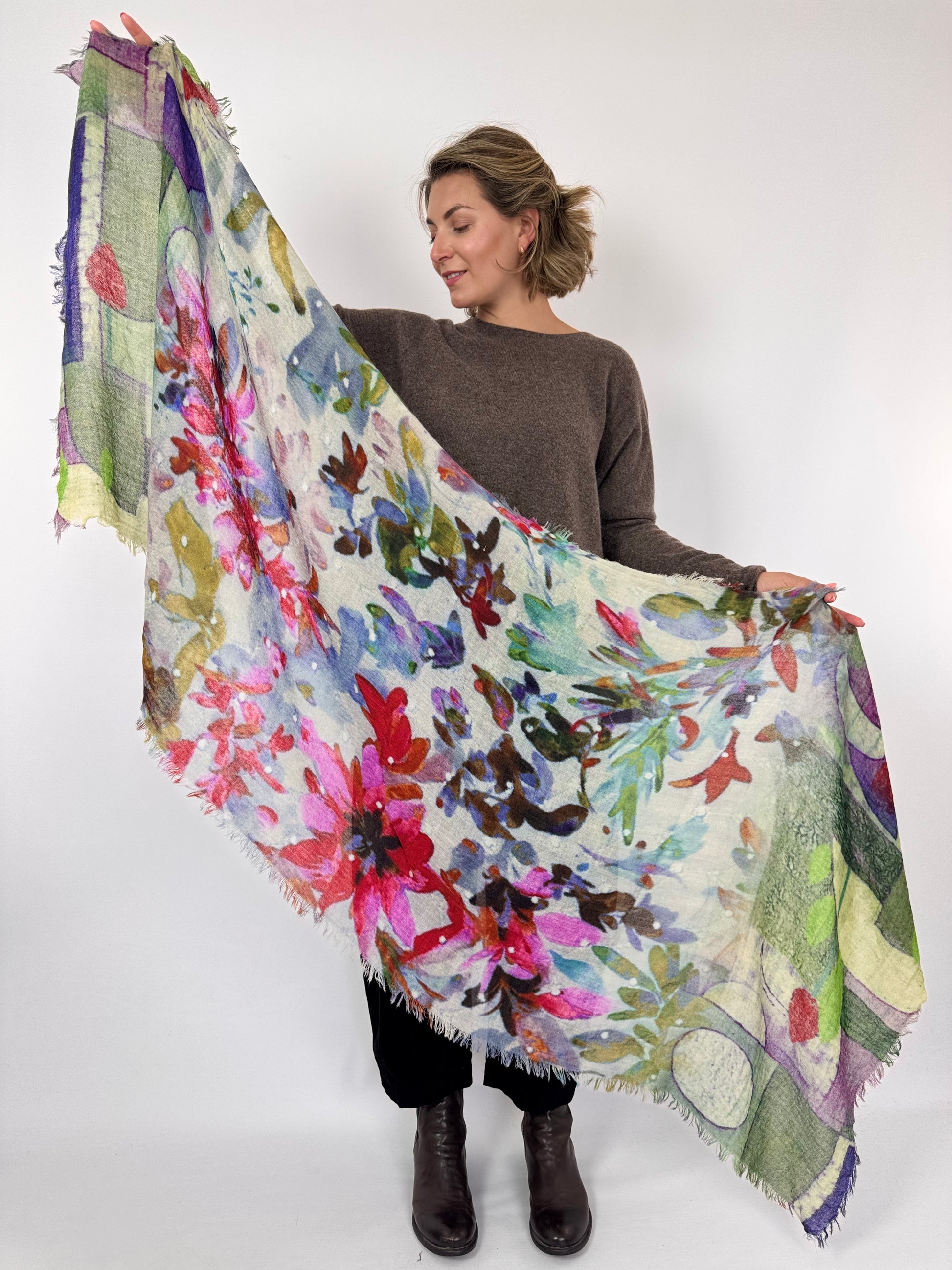 The Jo Edwards Endless Love Scarf features a vibrant festival of floral and geometric shapes, expertly woven in high-quality wool. This luxurious accessory combines intricate design with soft warmth, making it an elegant statement piece that enhances any outfit while providing comfort in cooler weather.