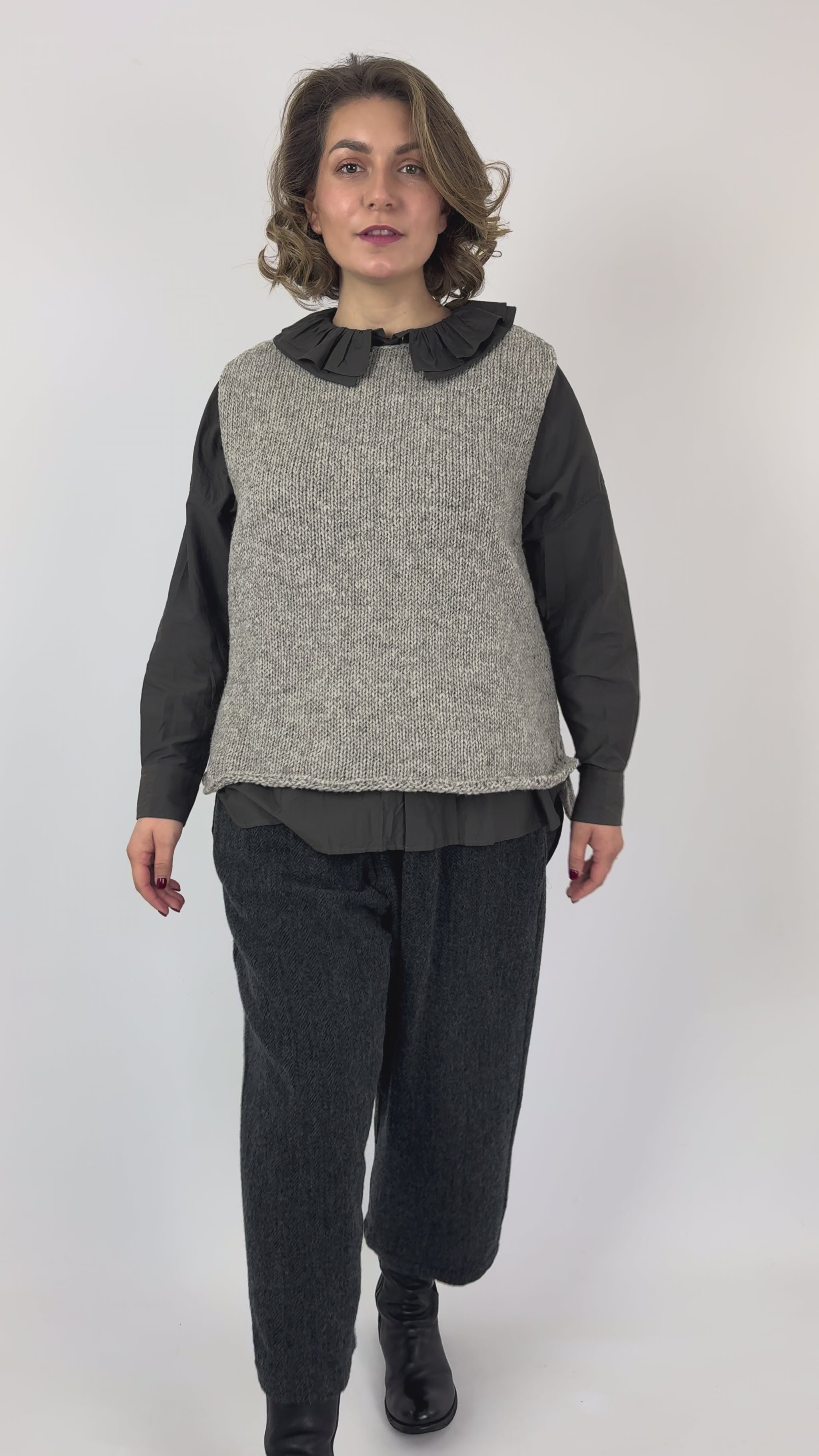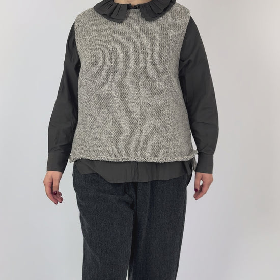 This Kagure 101 Sleeveless Jumper in Grey features a chunky knit design with a round neckline for comfortable wear. Its chunky texture provides a refined look. Ideal for layering, it offers both warmth and breathability in a sophisticated silhouette.
