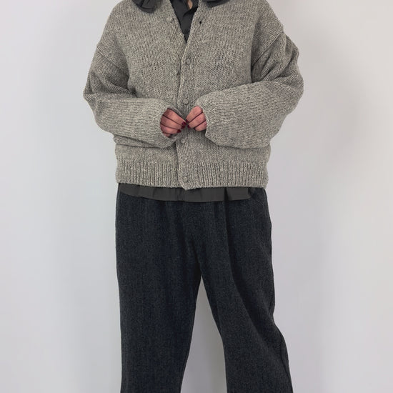 This Kagure 102 Cardigan in grey features a chunky knit design that offers both warmth and texture. It is detailed with a button-front closure for easy layering and a ribbed hemline to maintain shape and add subtle structure. The round neckline provides a classic silhouette, making it a versatile addition to your expert wardrobe.