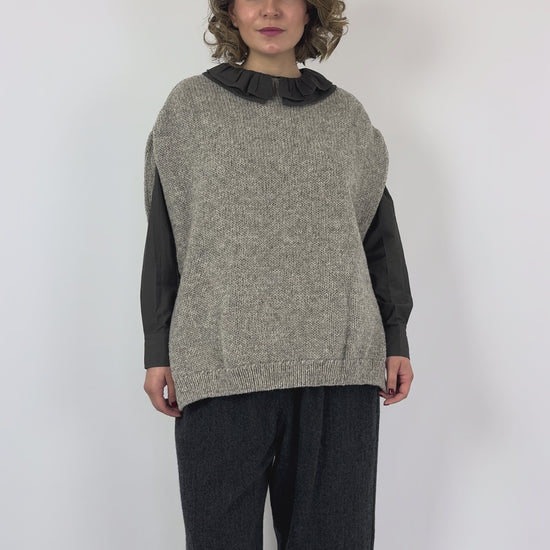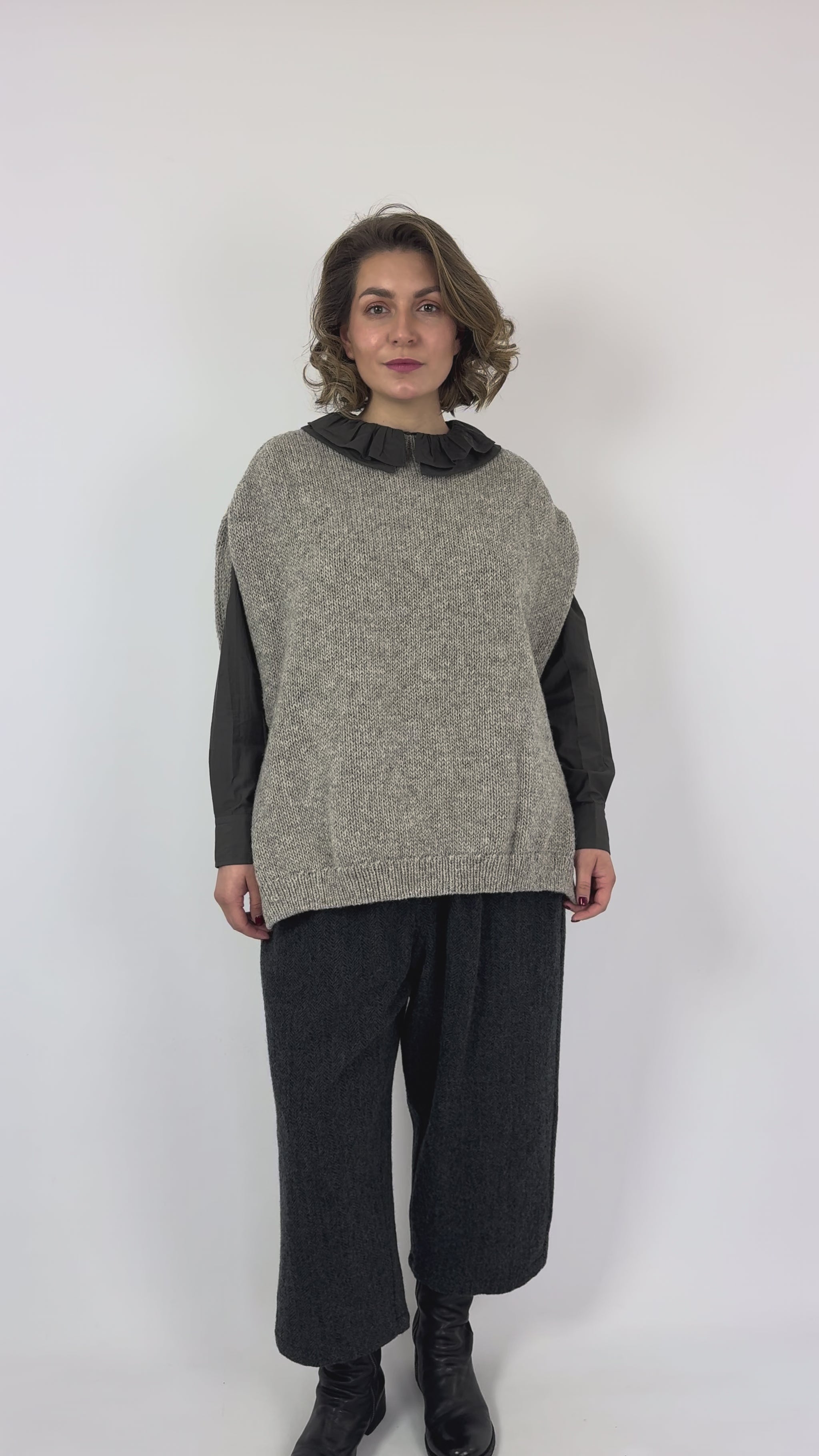 This Kagure 104 Wide Sleeveless Jumper in Grey features a chunky knit design with a round neckline for comfortable wear. Its chunky knit texture provides a refined look, while the open sides are thoughtfully secured with a single tie, combining style with ease of adjustment. Ideal for layering, it offers both warmth and breathability in a sophisticated silhouette.