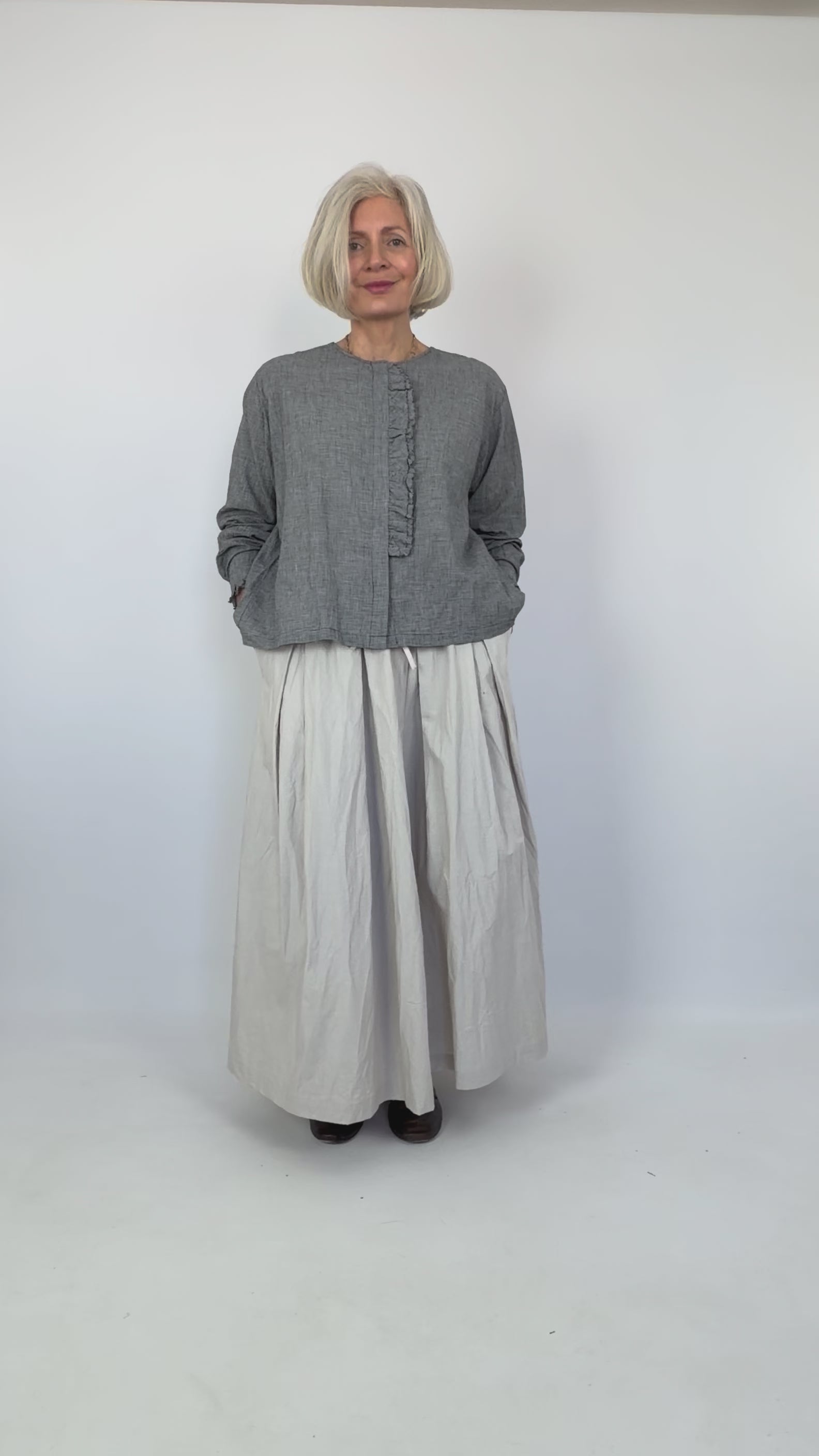 Crafted from 100% cotton, this elegant grey skirt features a soft cream cotton lining for comfort and durability. Thoughtfully designed with strategic pleating that creates beautiful volume and movement, it's finished with a practical elasticated waistline and adjustable drawstring for an easy, flattering fit. Perfect for effortless everyday style.