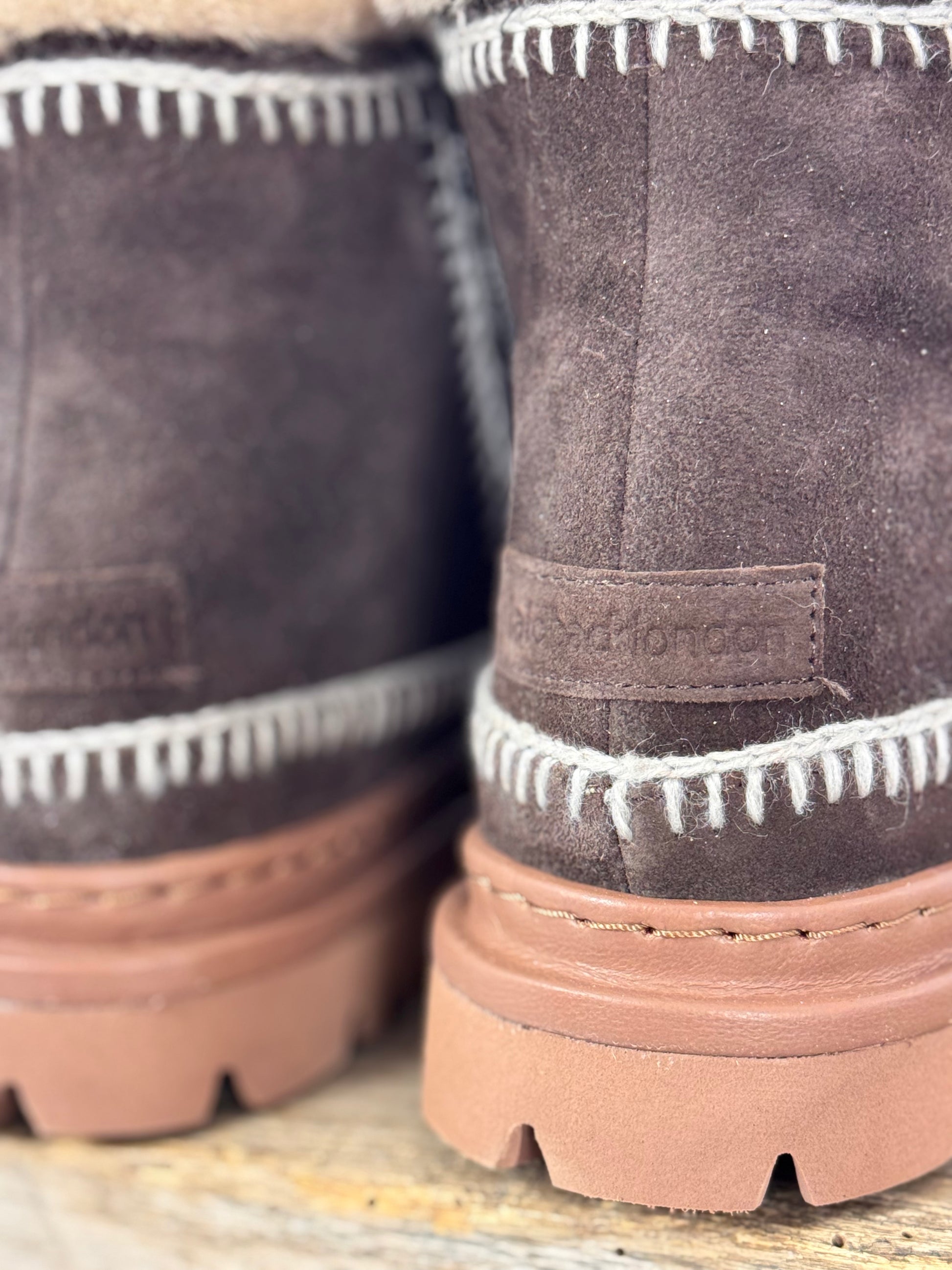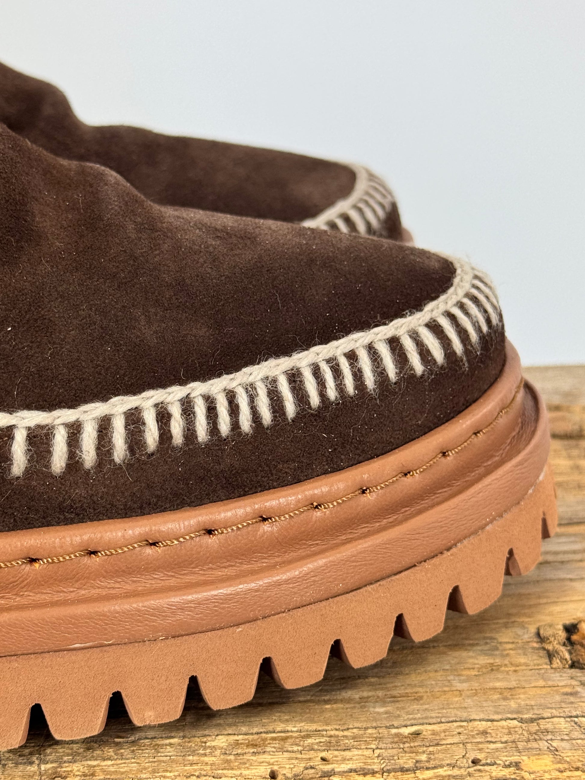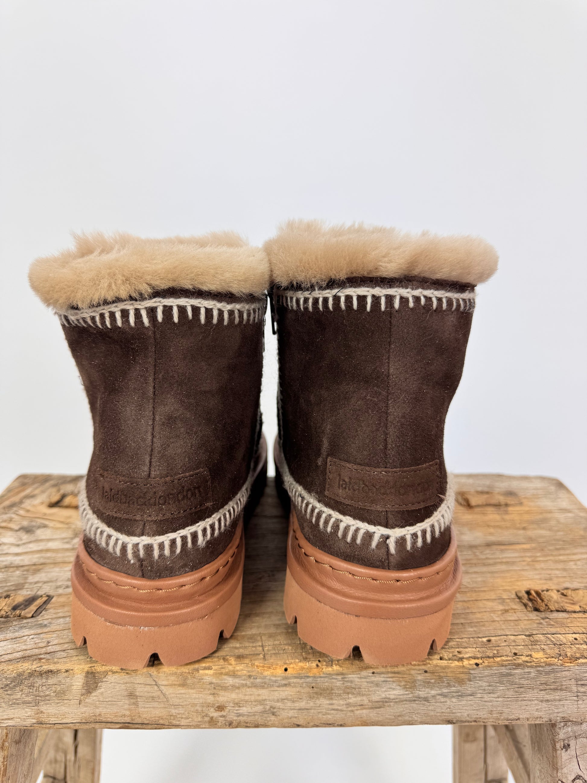 The Laidback London Setsu Boots in Chocolate Suede feature a premium suede upper with hand-crocheted trims, offering a unique artisan texture and warmth. Fully lined with soft shearling and equipped with a shearling insole, these boots ensure exceptional comfort. The lightweight rubber outsole provides flexibility and reliable grip, ideal for colder weather. With a modern chunky sole, 3.5cm heel, and 15cm back height (size 38), these boots combine style and practicality for everyday wear. Handmade by skilled artisans, they deliver both durability and refined craftsmanship.