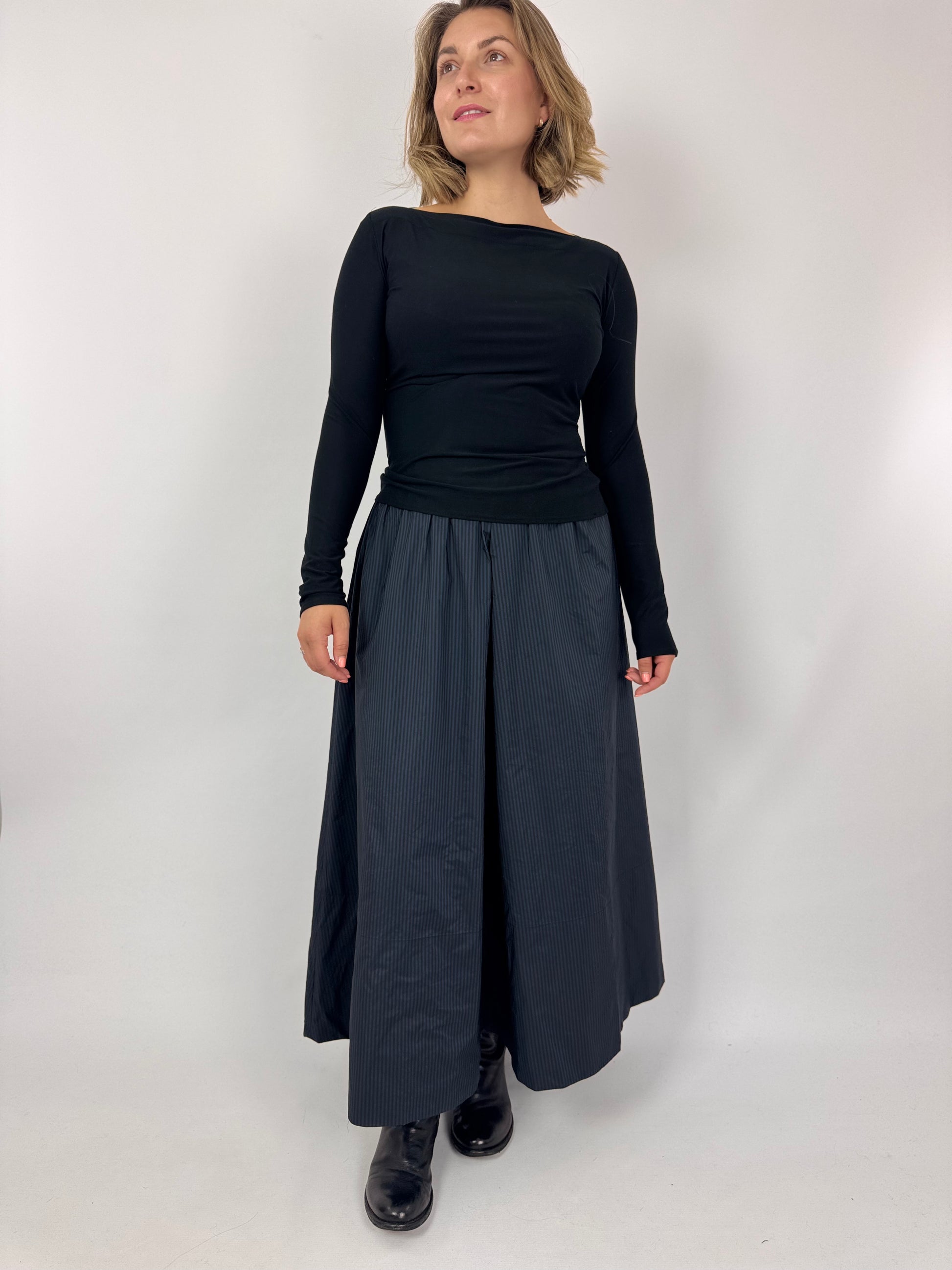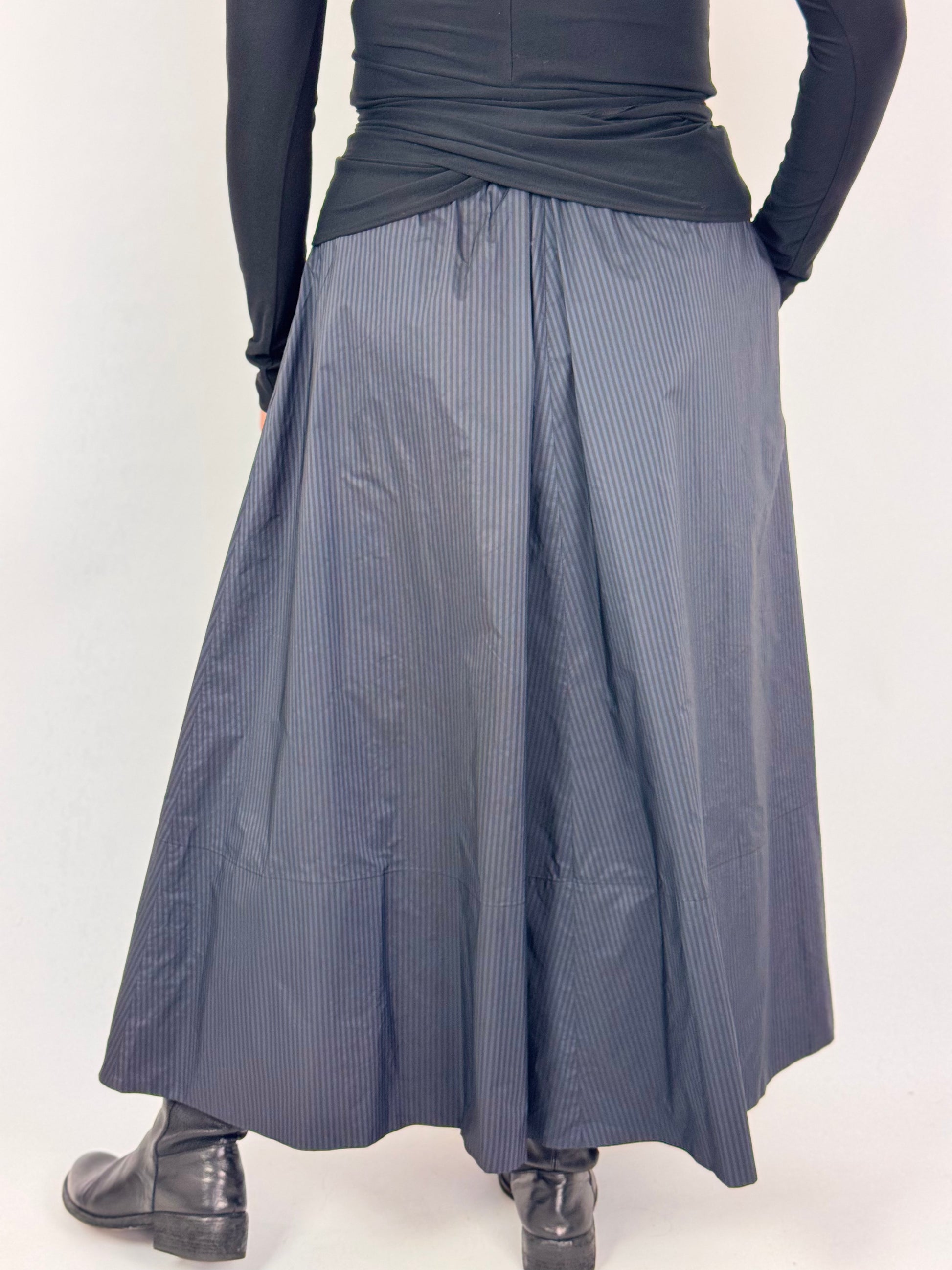The Les Filles d'Ailleurs 627 Skirt in navy and black stripes combines elegance with comfort. Its long A-line silhouette flatters every figure, while the elasticated waistline ensures a perfect, flexible fit. Practical details like belt loops and side pockets add versatility and convenience. Ideal for a variety of occasions, this skirt effortlessly balances style and functionality, making it a refined addition to any wardrobe.