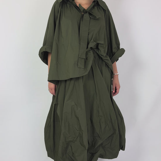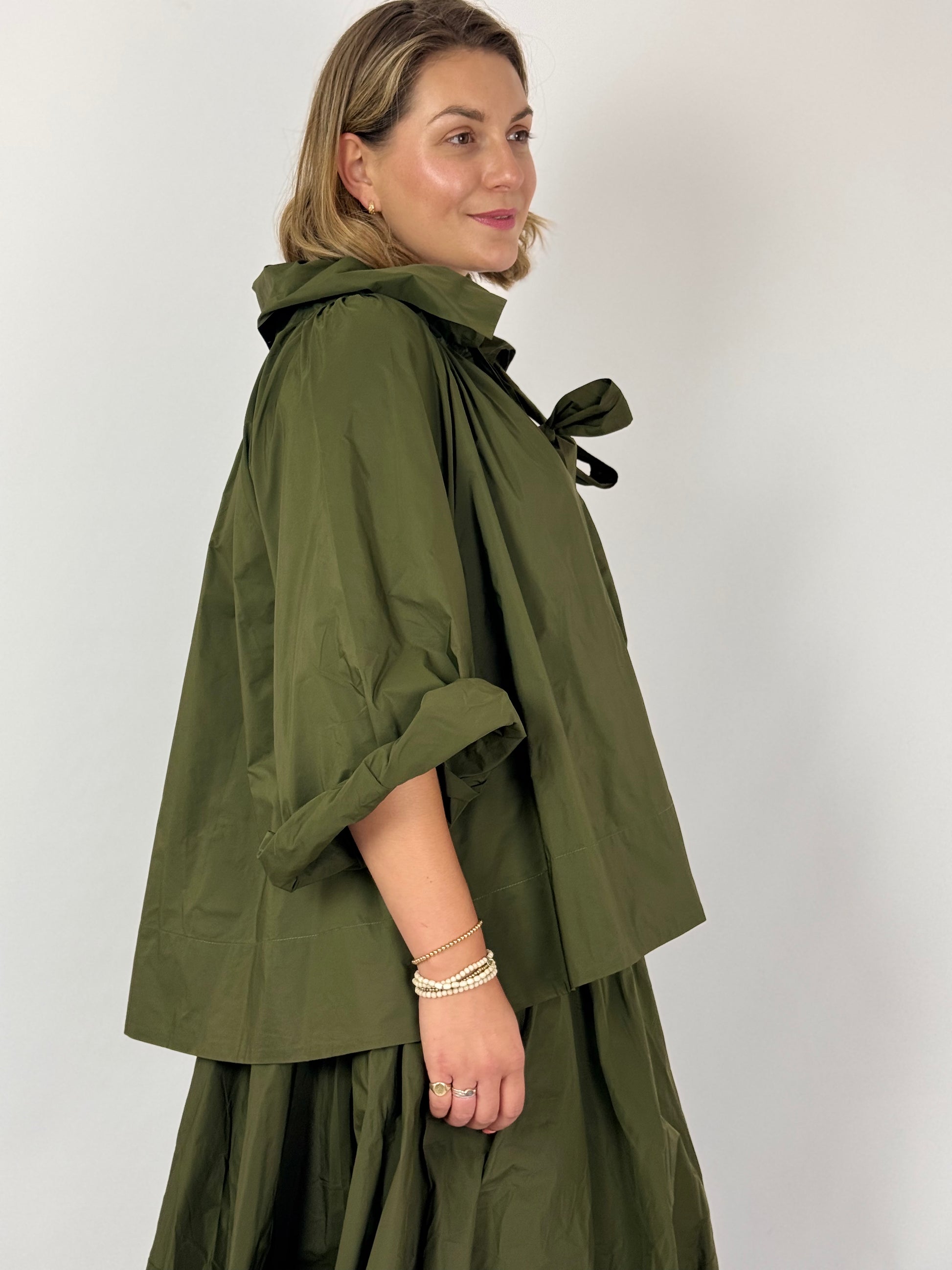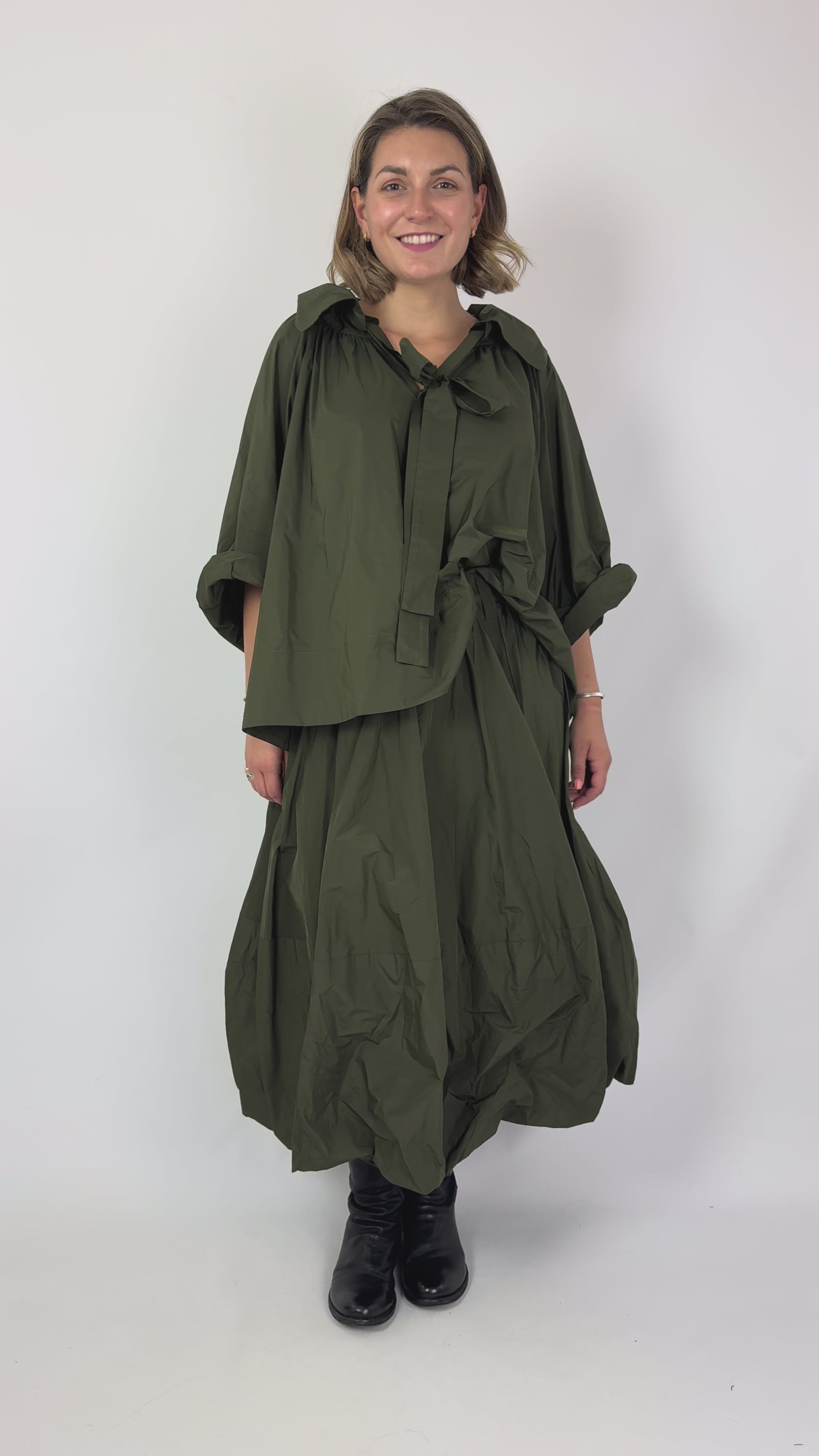 Elevate your occasion wardrobe with the Les Filles d'Ailleurs 840 Top in Khaki. This party-ready top features a relaxed A-line silhouette and a distinctive large collar, complemented by a versatile long neck tie that can be styled in multiple ways for a personalised look. The roll-up sleeves add a tailored touch while enhancing comfort and ease. Pair this sophisticated top with the 566 skirt to create a flawless ensemble perfect for special events.