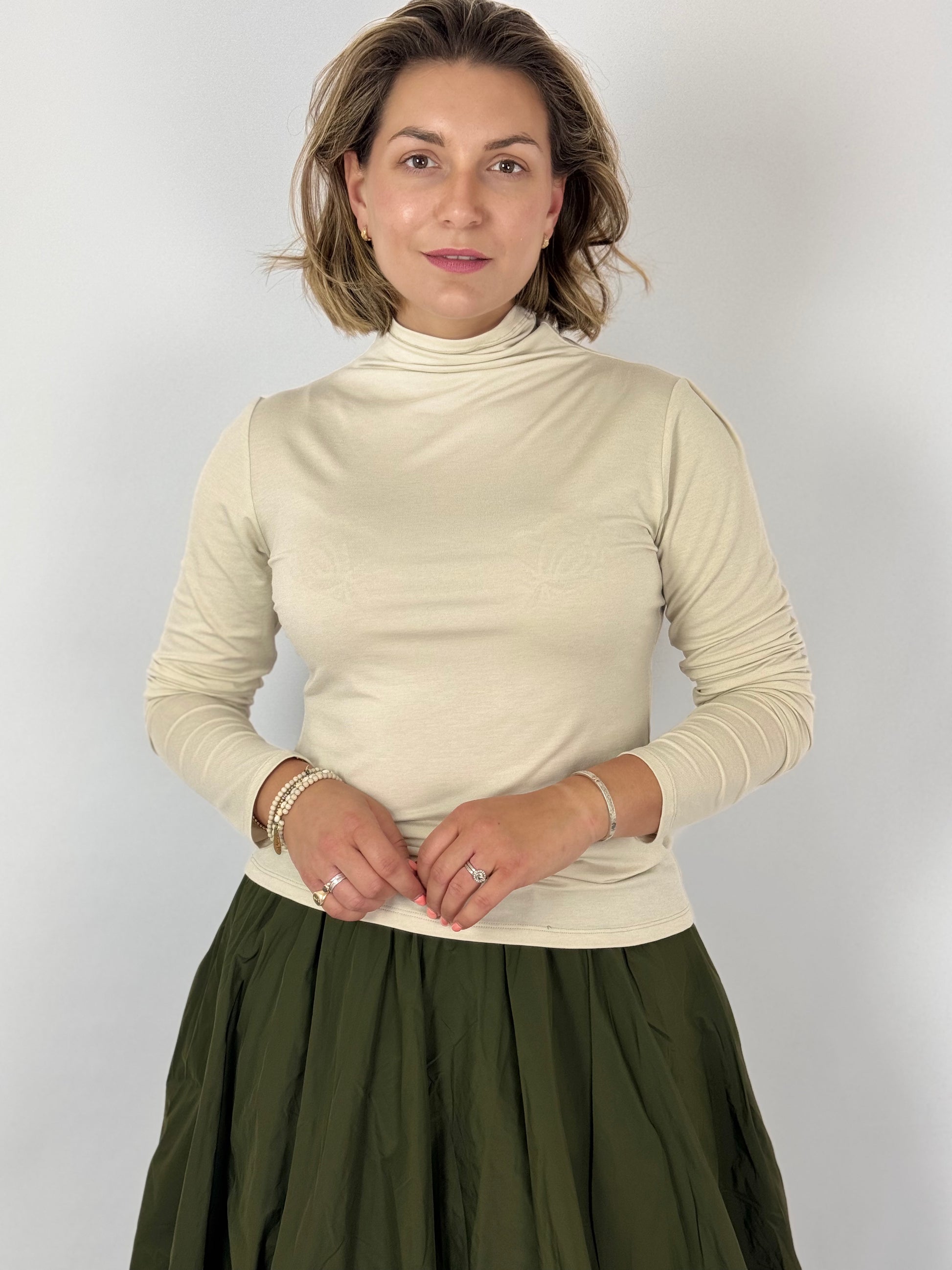 Experience ultimate comfort with the Les Filles d'Ailleurs 841 Top in Ecru. Crafted as a super soft underlayer, this top features a high neckline for added coverage and a sleek, fitted body that contours seamlessly to your silhouette. The long sleeves provide extra warmth and versatility, making it an ideal foundational piece for layering in cooler weather or wearing alone for a polished, minimalist look.