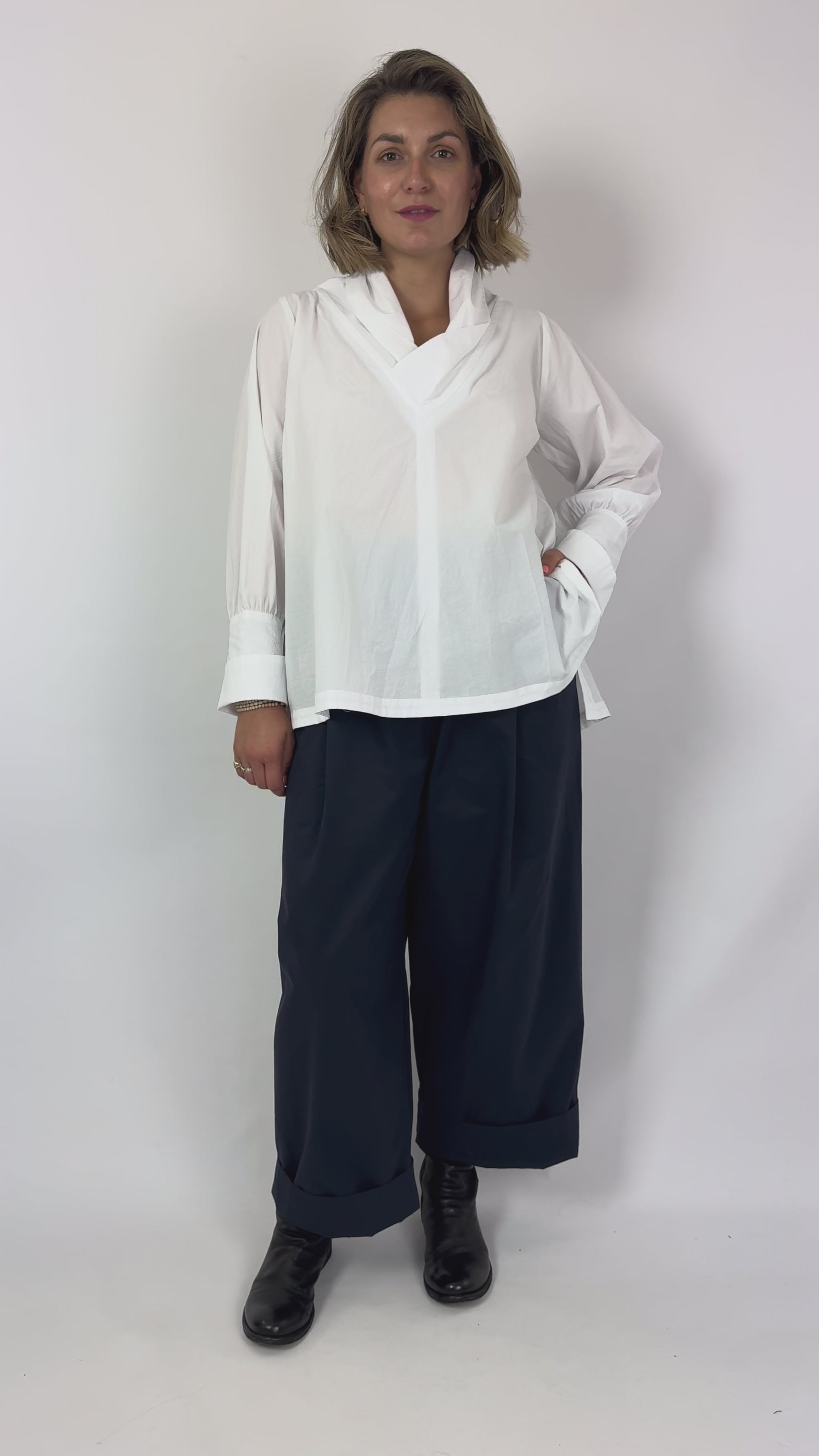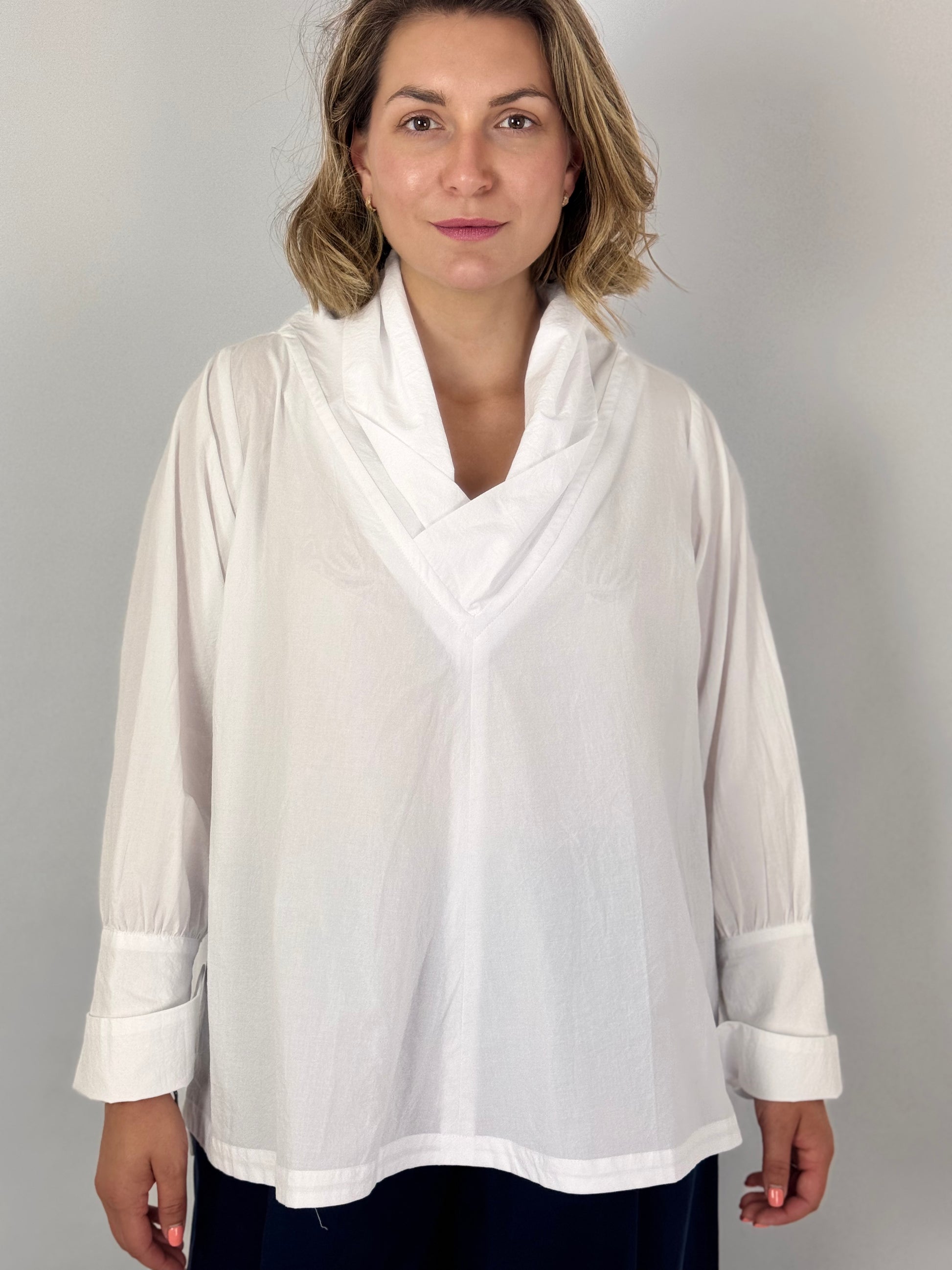 Crafted from soft cotton, the Les Filles d’Ailleurs 843 Top White offers a relaxed oversized fit with a distinctive exaggerated collar and large cuffs. Its loose A-line shape provides effortless comfort and a sophisticated, contemporary silhouette ideal for versatile styling.