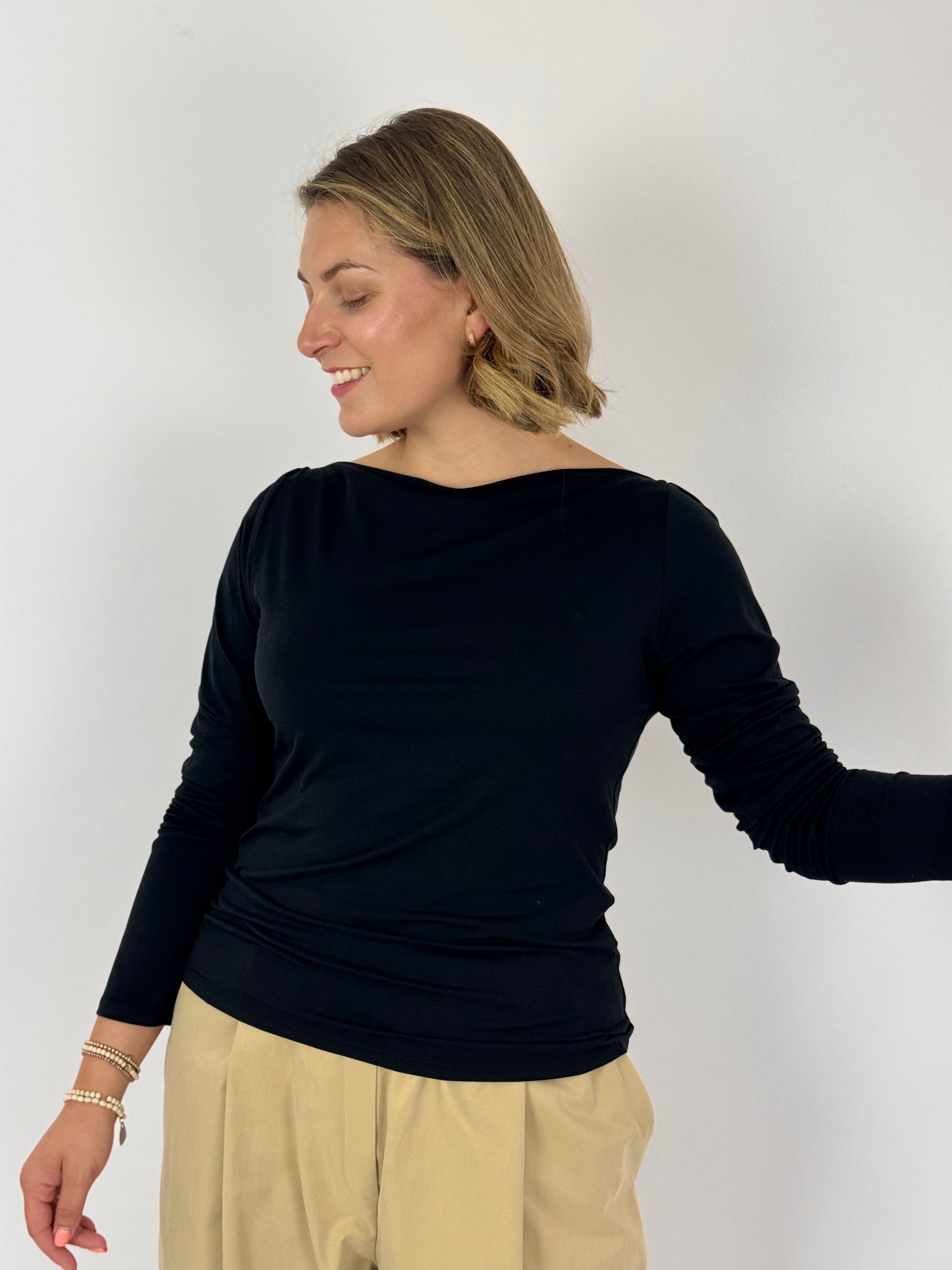Crafted for ultimate comfort, the Les Filles d'Ailleurs 849 Top in Black features a super soft fabric that feels gentle on the skin. Its elegant boat neckline enhances the silhouette with a refined touch, while subtle pleat detailing on the shoulder adds sophistication and visual interest. This top combines timeless style with expert tailoring, making it an excellent choice for both casual and polished looks.
