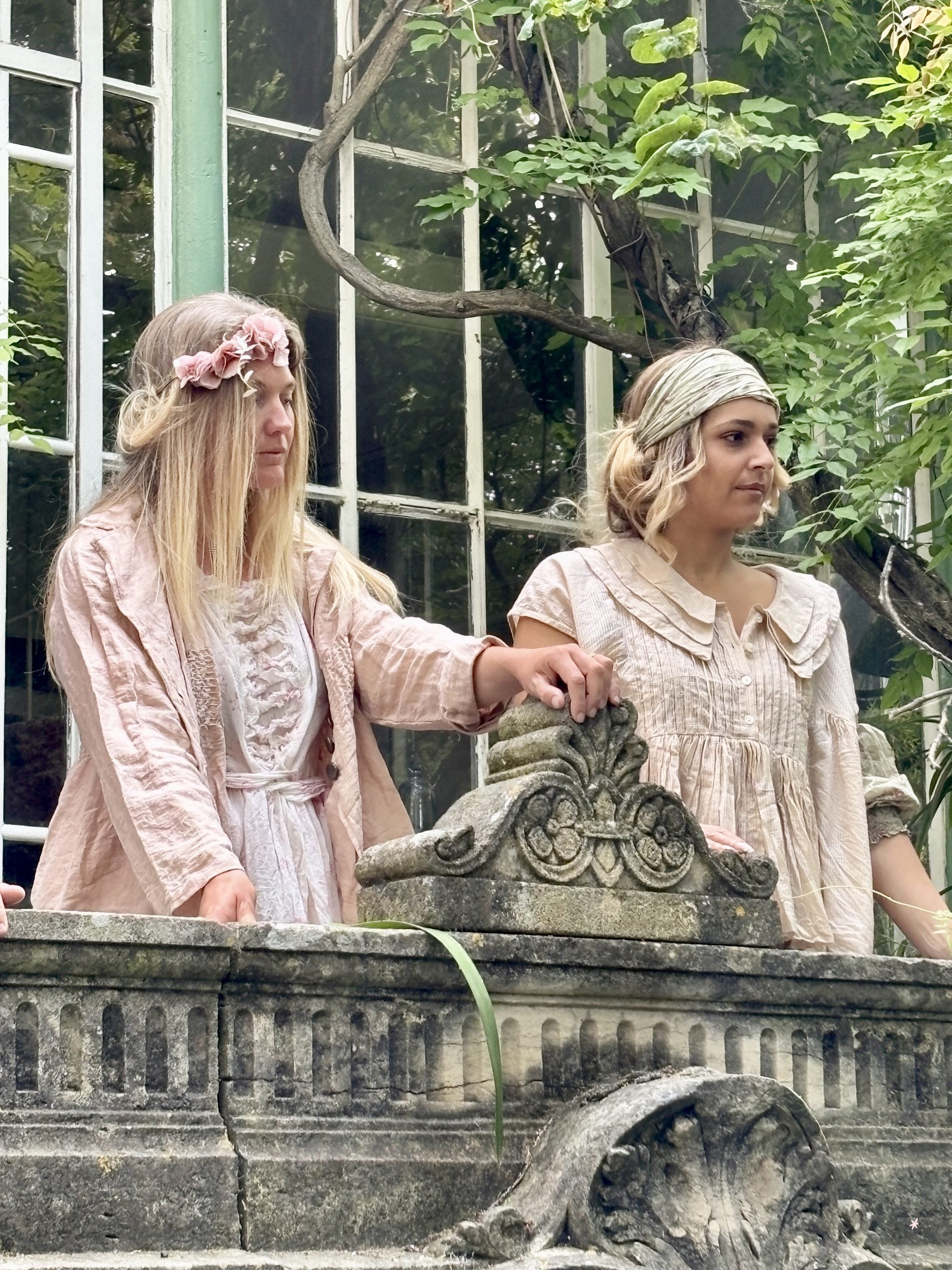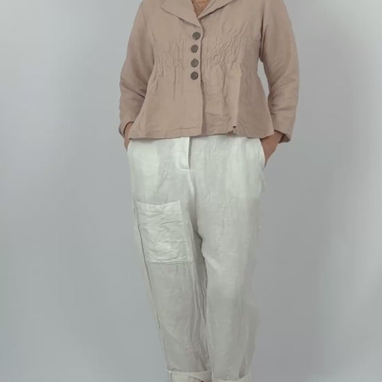 Embrace understated elegance with this bohemian-inspired short jacket. Crafted from a linen and cotton blend in soft, muted pink tone, it features a gently tailored collar and strategic smocking across the front and back for a subtly fitted, feminine silhouette. Three antique metal buttons provide vintage-inspired detailing that complements the fabric's delicate texture. Perfect for layering over dresses or pairing with tailored trousers, this piece effortlessly bridges romantic sensibility with contemporary style.