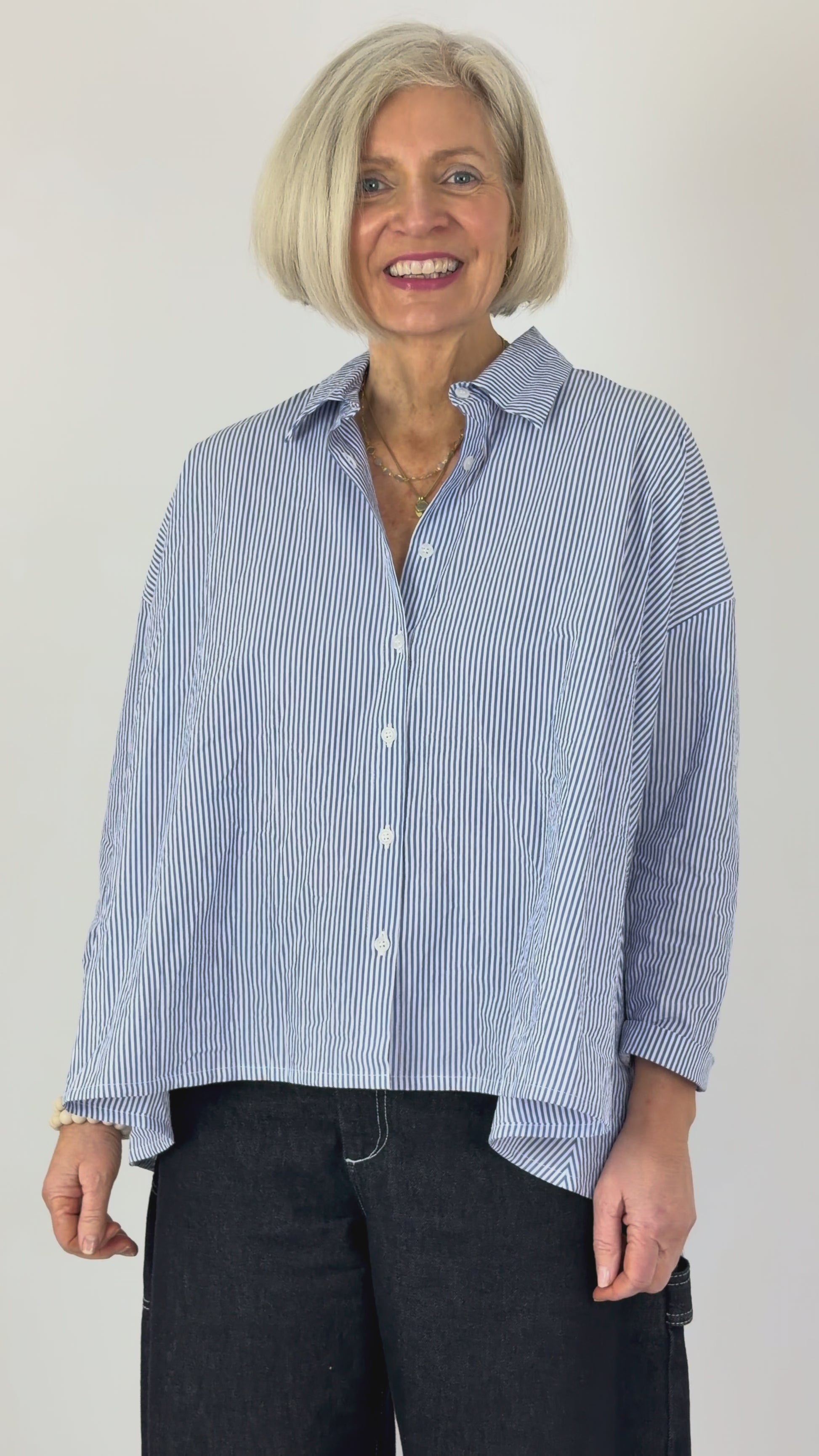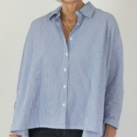 Crafted from crisp cotton, this striped shirt delivers effortless spring style with its distinctive wide silhouette and dropped shoulders. The longer back hem and button front create a relaxed yet refined aesthetic, while the classic blue and white stripes offer versatile appeal. A structured collar completes the polished look—ideal for layering or wearing solo during warmer months.
