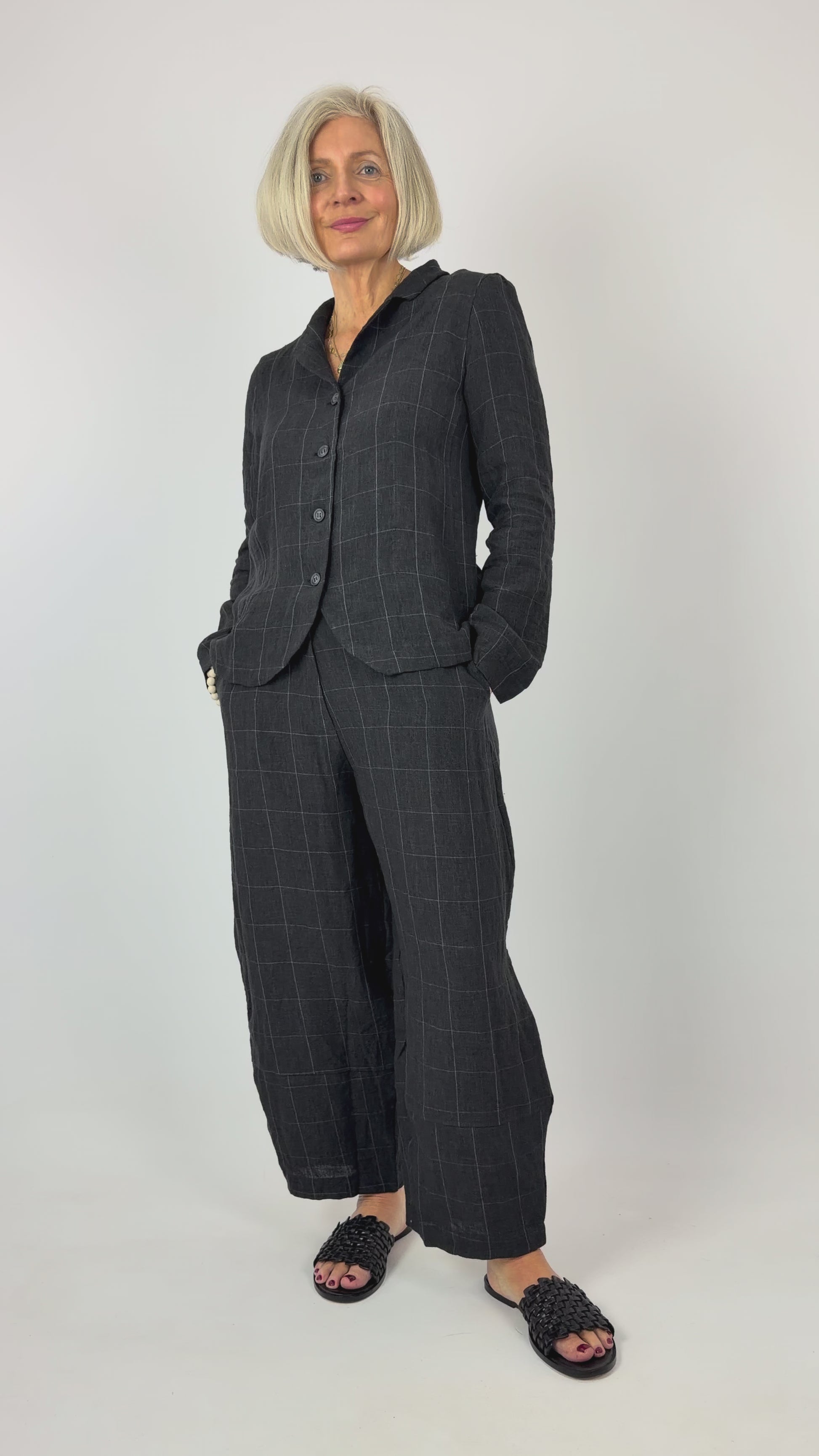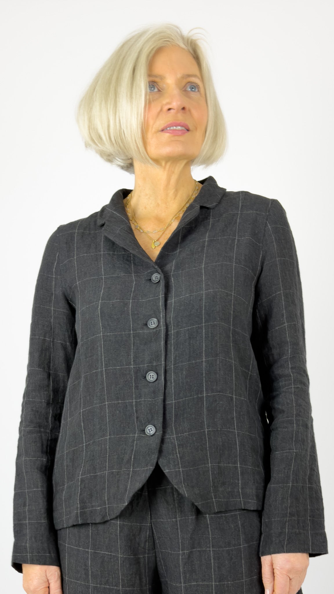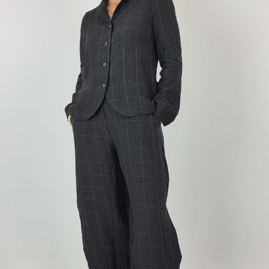 Expertly crafted for the discerning wardrobe, this Mama b Adel jacket combines refined tailoring with understated sophistication. The button-front design and fitted silhouette create a polished, flattering shape, while the subtle pale check pattern adds visual interest to the smart anthracite base. A refined collar completes the look, making this piece equally at home in professional settings or elevated casual occasions. Versatile, timeless, and impeccably constructed.