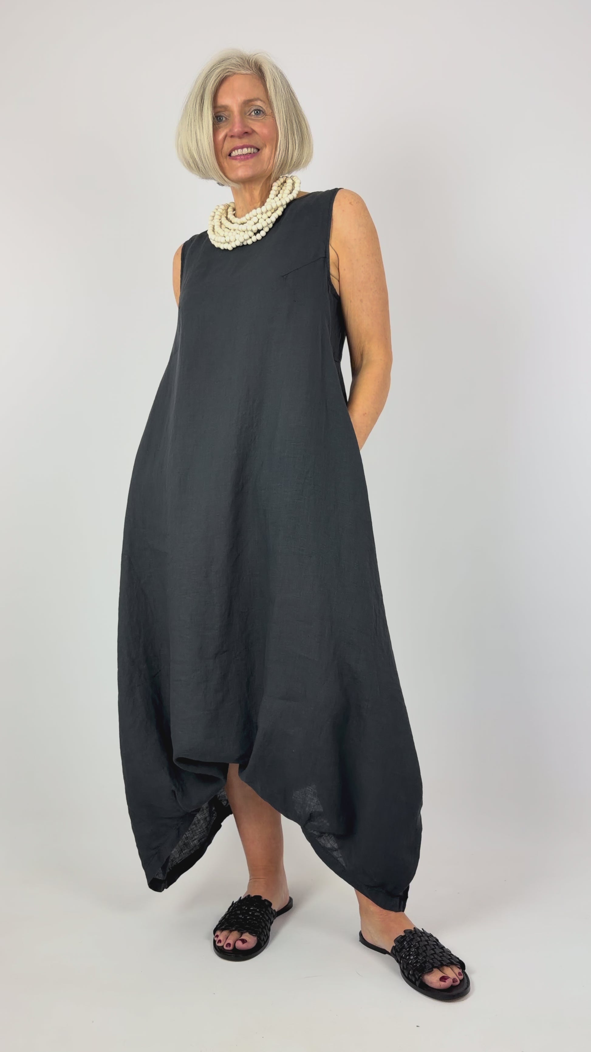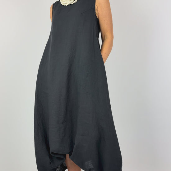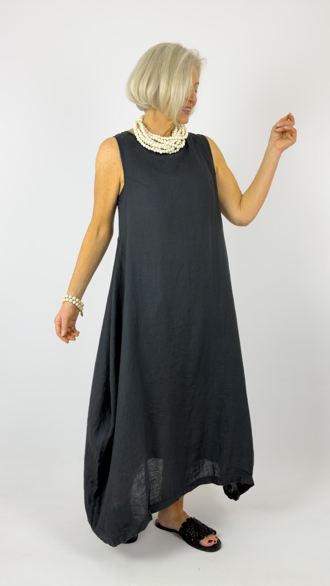 The Mama b Alma L Dress in Anthracite is a refined linen piece designed for effortless elegance. This sleeveless style features a classic round neckline and thoughtfully constructed wide sides that tuck in for a flattering silhouette. The subtle balloon shape skirt creates gentle movement whilst maintaining a sophisticated line. Crafted from lightweight linen, it's ideal for warm weather wear and transitions seamlessly from day to evening. A versatile wardrobe essential that combines comfort with understated style.