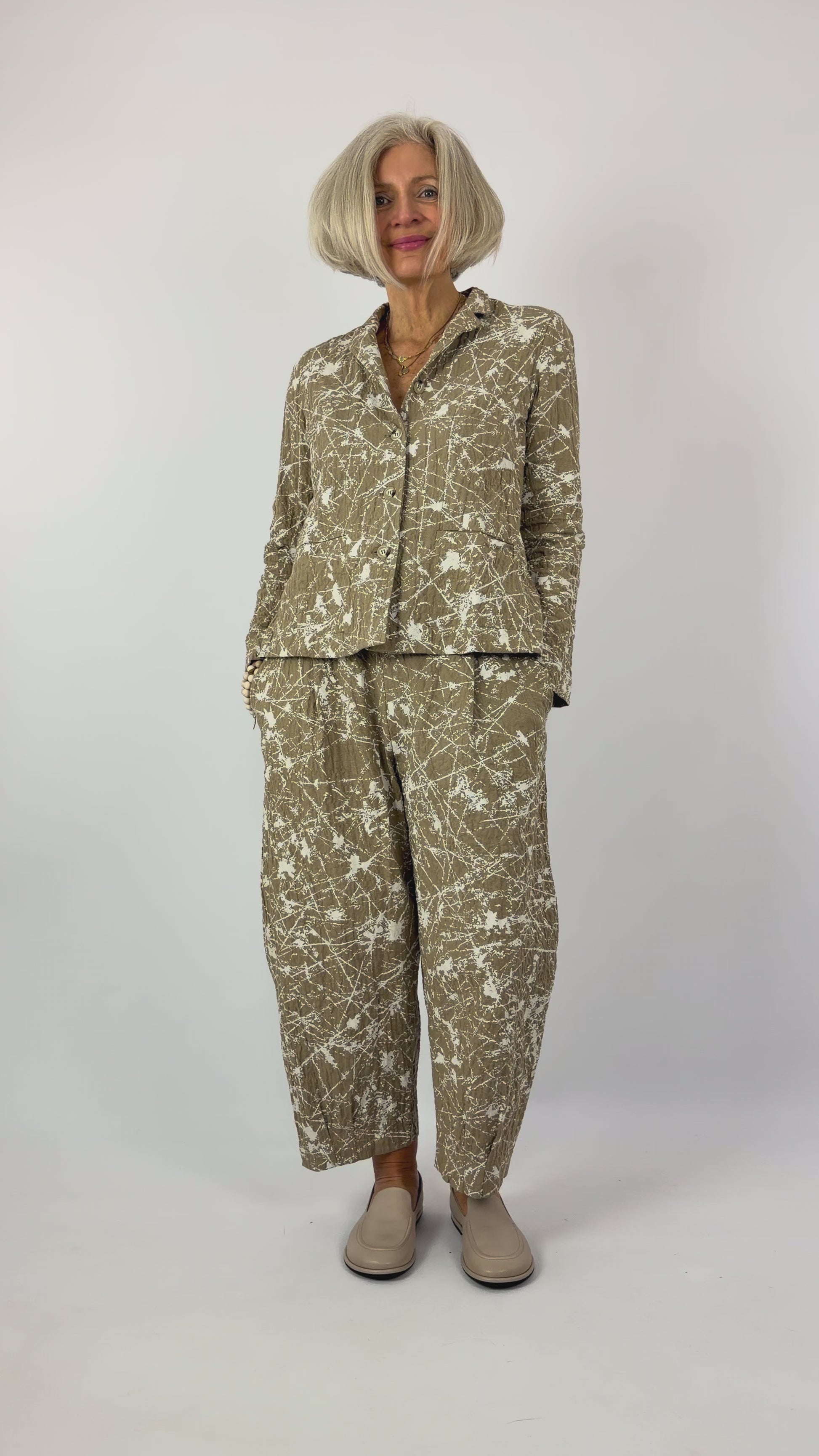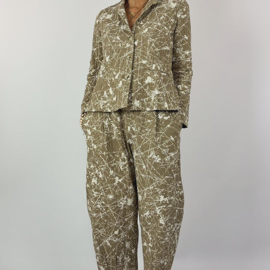 Elevate your wardrobe with this striking tailored jacket, featuring a textured fabric base in warm cumin tones accented by an artistic white paint splatter print throughout. The slim-fit silhouette delivers a refined, contemporary edge, while the structured collar and button front closure ensure polished versatility. Practical two-pocket design completes this statement piece, perfect for layering over essentials or wearing as a standalone focal point for elevated everyday styling.