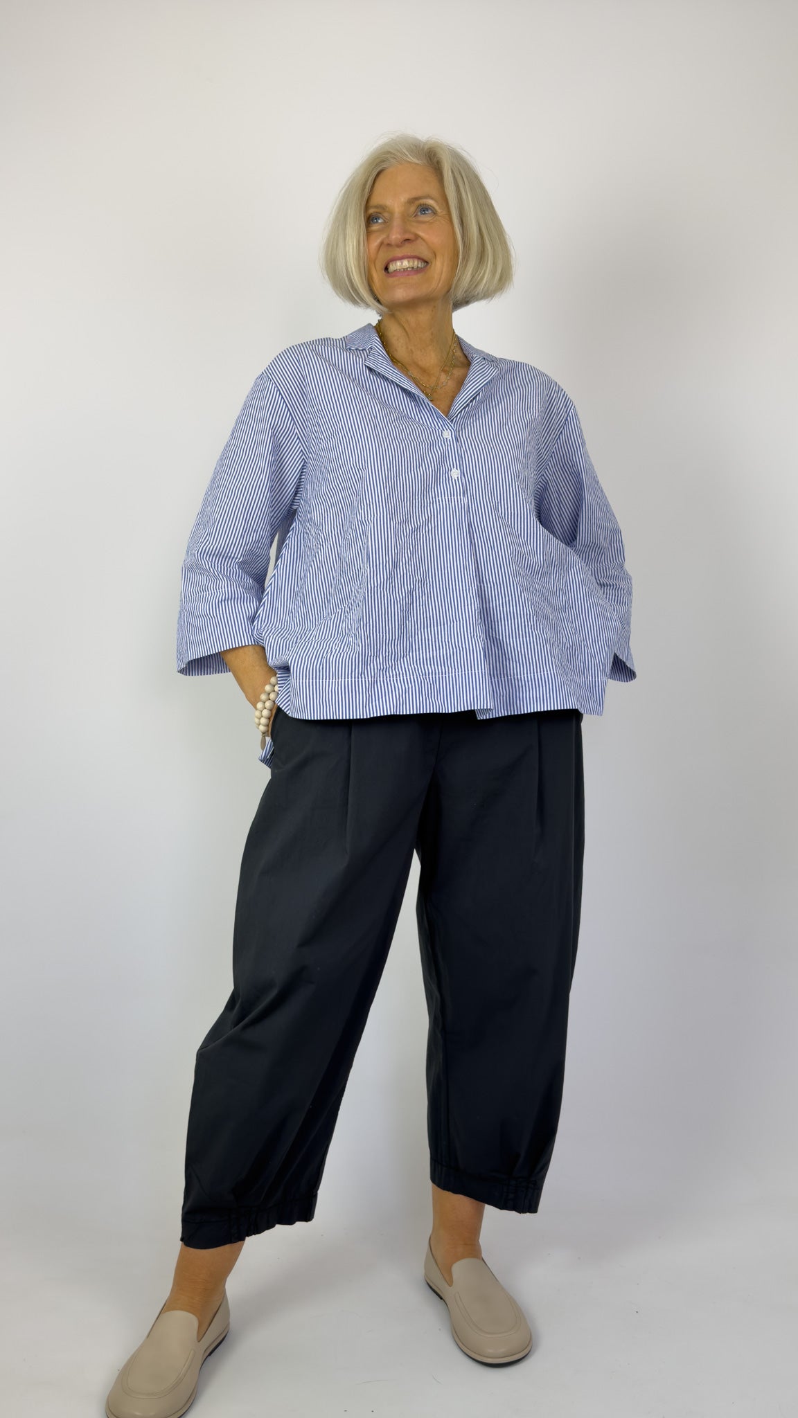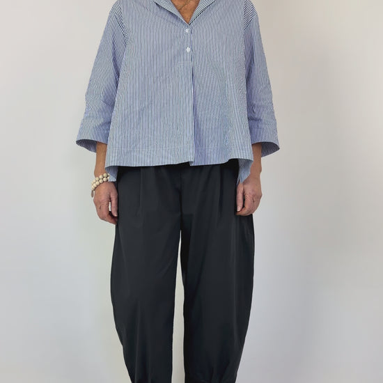 Mama b's bestselling silhouette reimagined in sophisticated anthracite. These trousers feature a subtle balloon shape that skims the body with effortless elegance, defined by inverted pleats and a slightly cropped length. The elasticated waistline ensures comfort throughout the day, while functional side pockets add practicality to the refined design. Crafted from lightweight cotton, they're ideal for layering and transitional dressing.