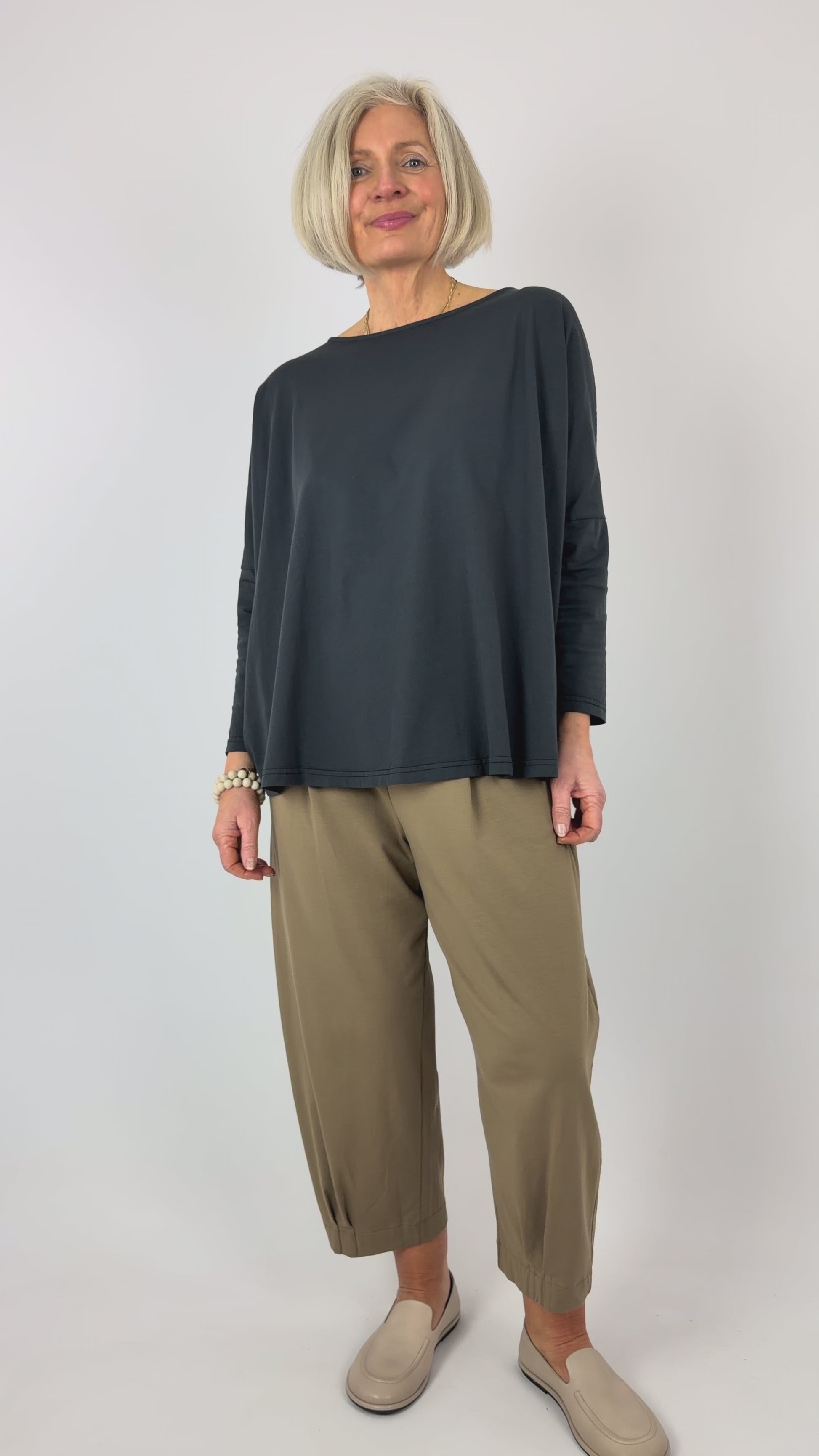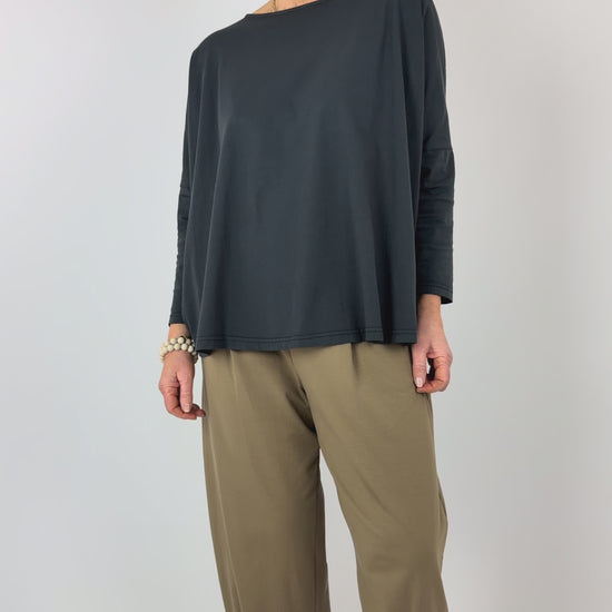 Effortlessly chic and supremely comfortable, the Mama b Domenica T-Shirt in Anthracite features a relaxed, oversized silhouette that moves with you throughout the day. The generous, wide cut and dropped shoulders create an understated elegance, while the round neckline offers timeless appeal. Extended length at the back adds contemporary flair and ensures flattering coverage. Perfect for layering or wearing solo, this versatile piece transitions seamlessly from casual weekends to relaxed workdays.