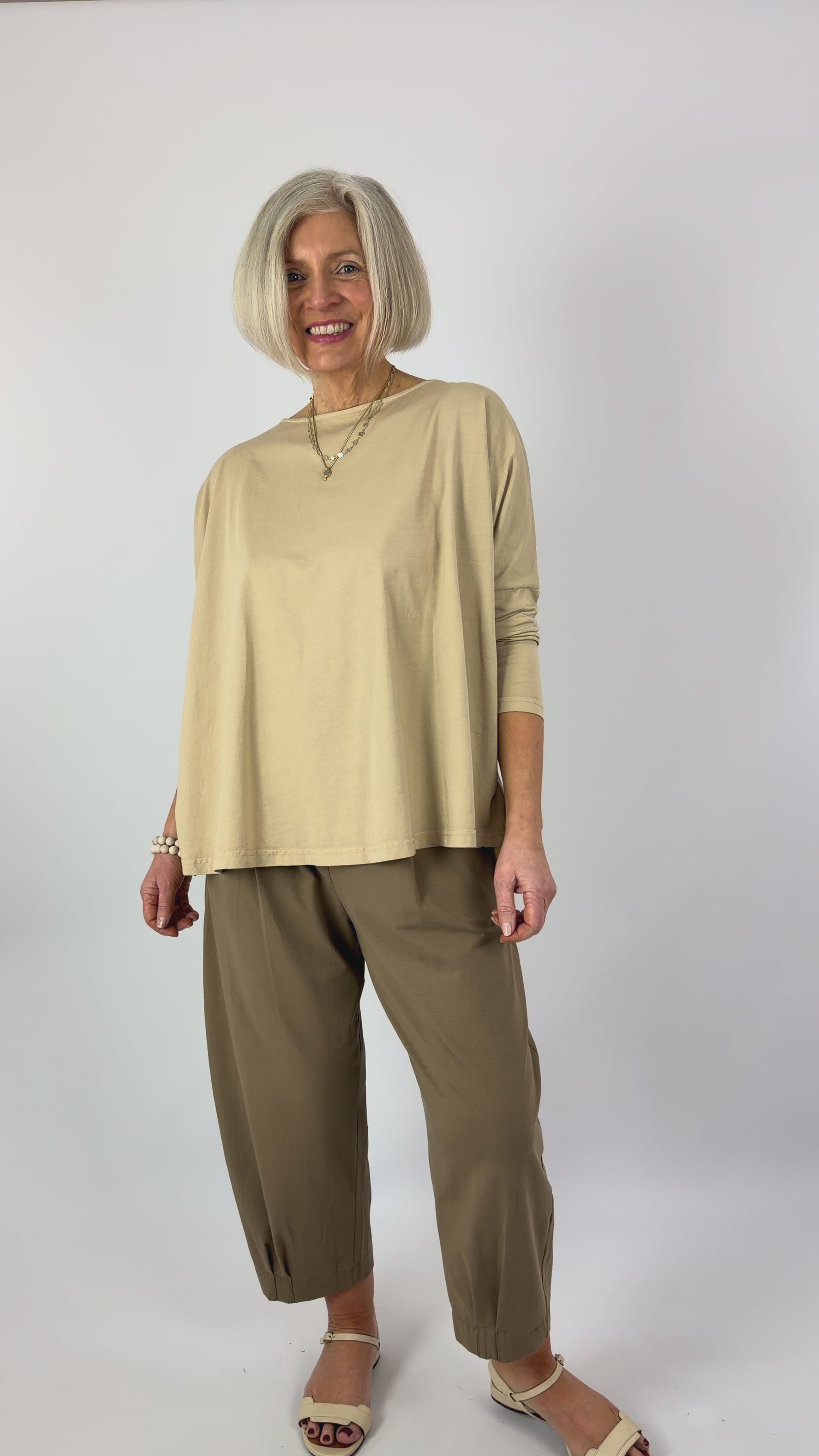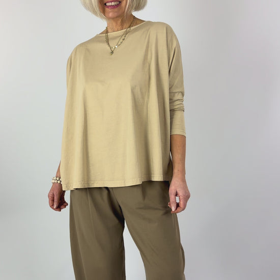 Effortlessly chic and supremely comfortable, the Mama b Domenica T-Shirt in Grano features a relaxed, oversized silhouette that moves with you throughout the day. The generous, wide cut and dropped shoulders create an understated elegance, while the round neckline offers timeless appeal. Extended length at the back adds contemporary flair and ensures flattering coverage. Perfect for layering or wearing solo, this versatile piece transitions seamlessly from casual weekends to relaxed workdays.