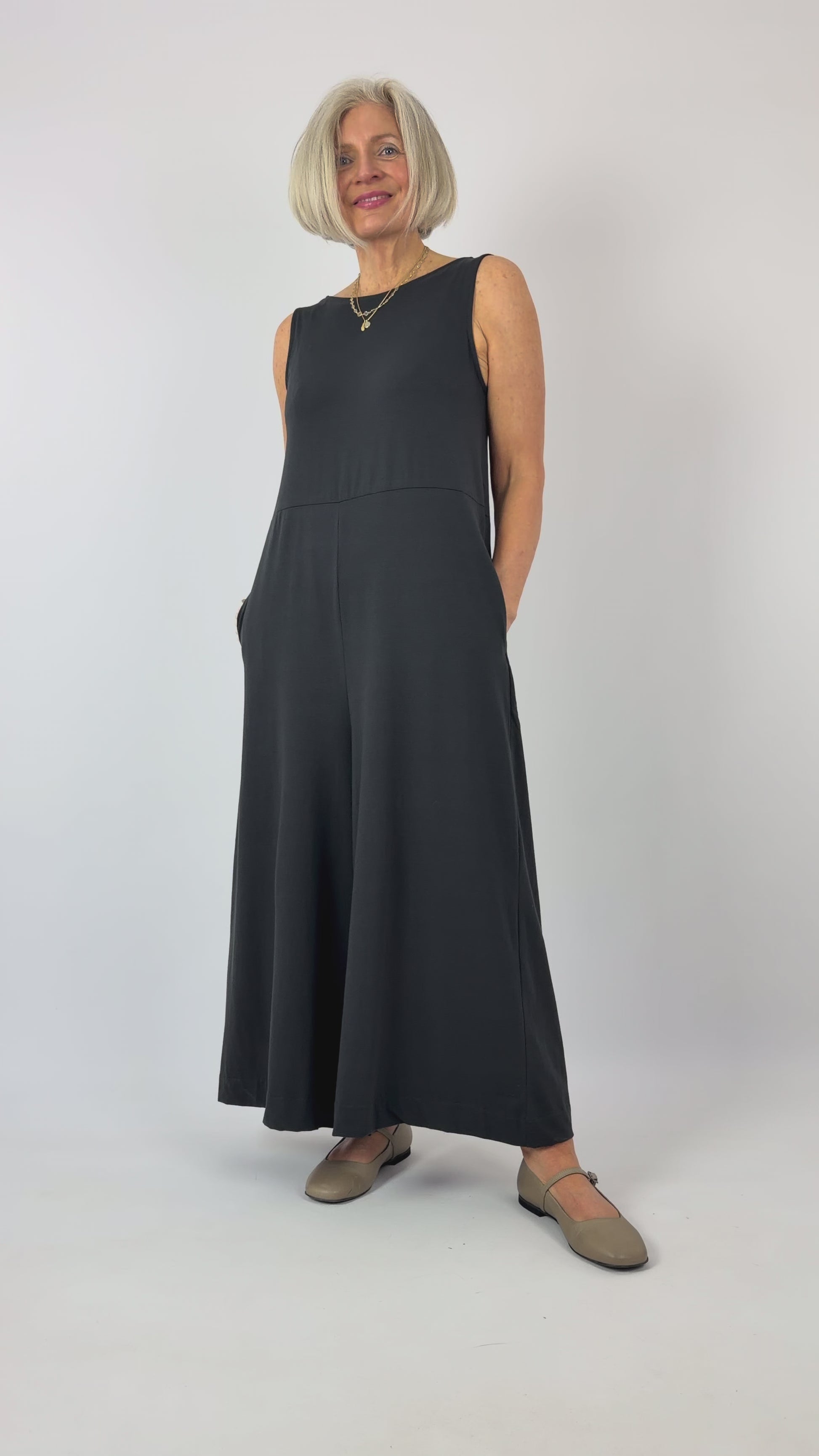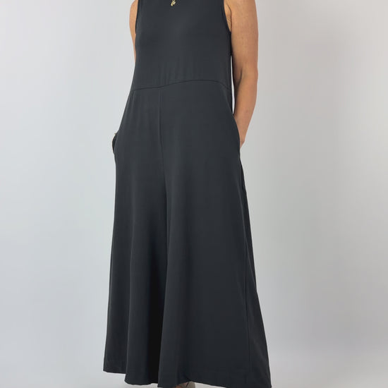 Effortlessly sophisticated, this jumpsuit combines contemporary design with practical comfort. The relaxed silhouette features a rounded neckline at the front that transitions to a flattering V-neckline at the back, creating visual interest without compromising ease of movement. Sleeveless styling keeps it versatile across seasons, while generously flared trousers and side seam pockets deliver functionality. Crafted from stretchy cotton jersey, the fabric moves with you whilst maintaining its shape throughout the day. An understated essential for those who value refined simplicity.