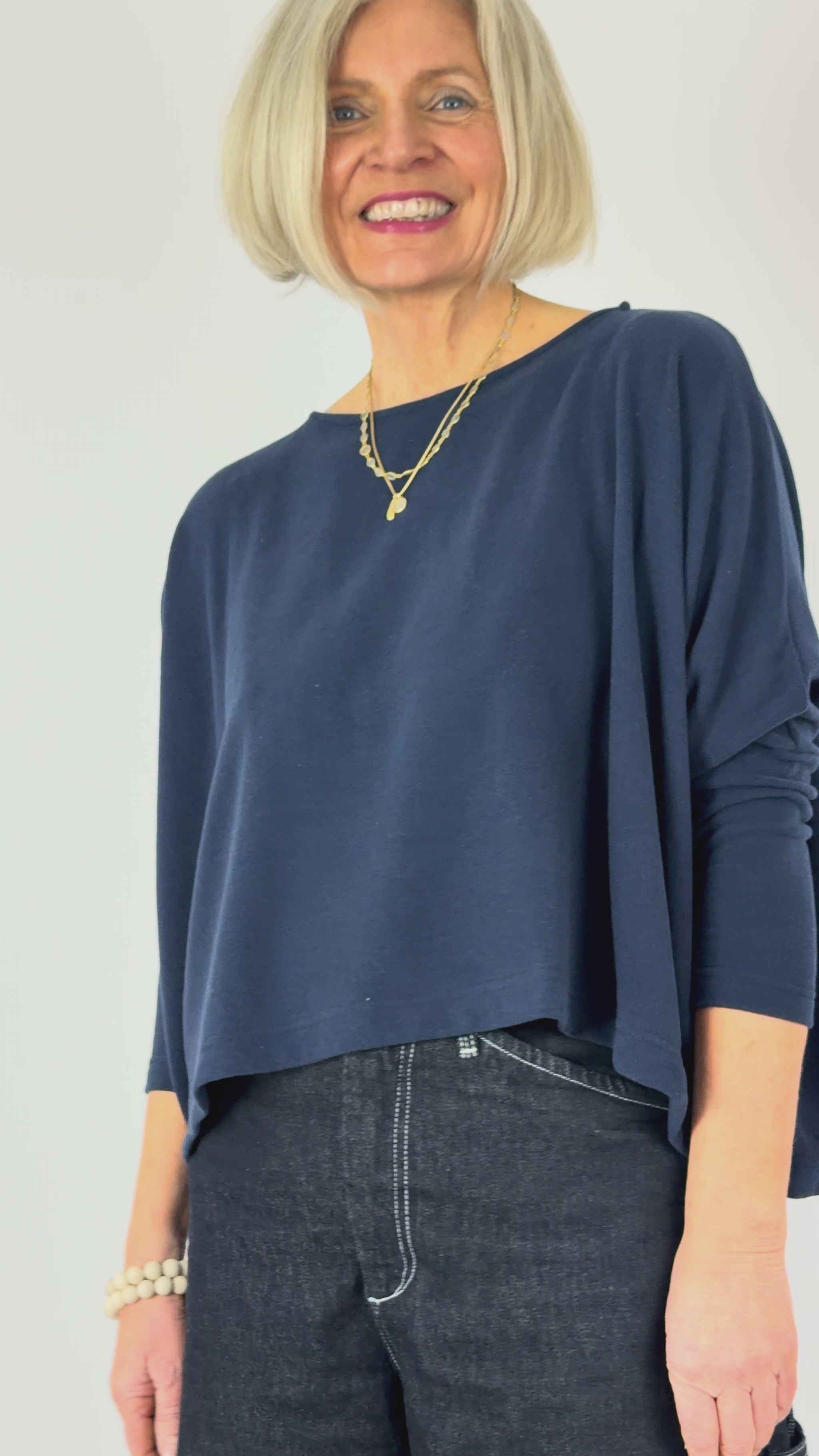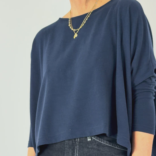 The Mama b Kira Jumper in Blue delivers effortless style with its bestselling silhouette. The boxy, wide cut and dropped shoulders create a relaxed fit that flatters all shapes, while fitted 3/4 length sleeves provide structure and definition. Layer it over tees, shirts, or dresses for versatile everyday wear that transitions seamlessly from casual to smart-casual occasions.