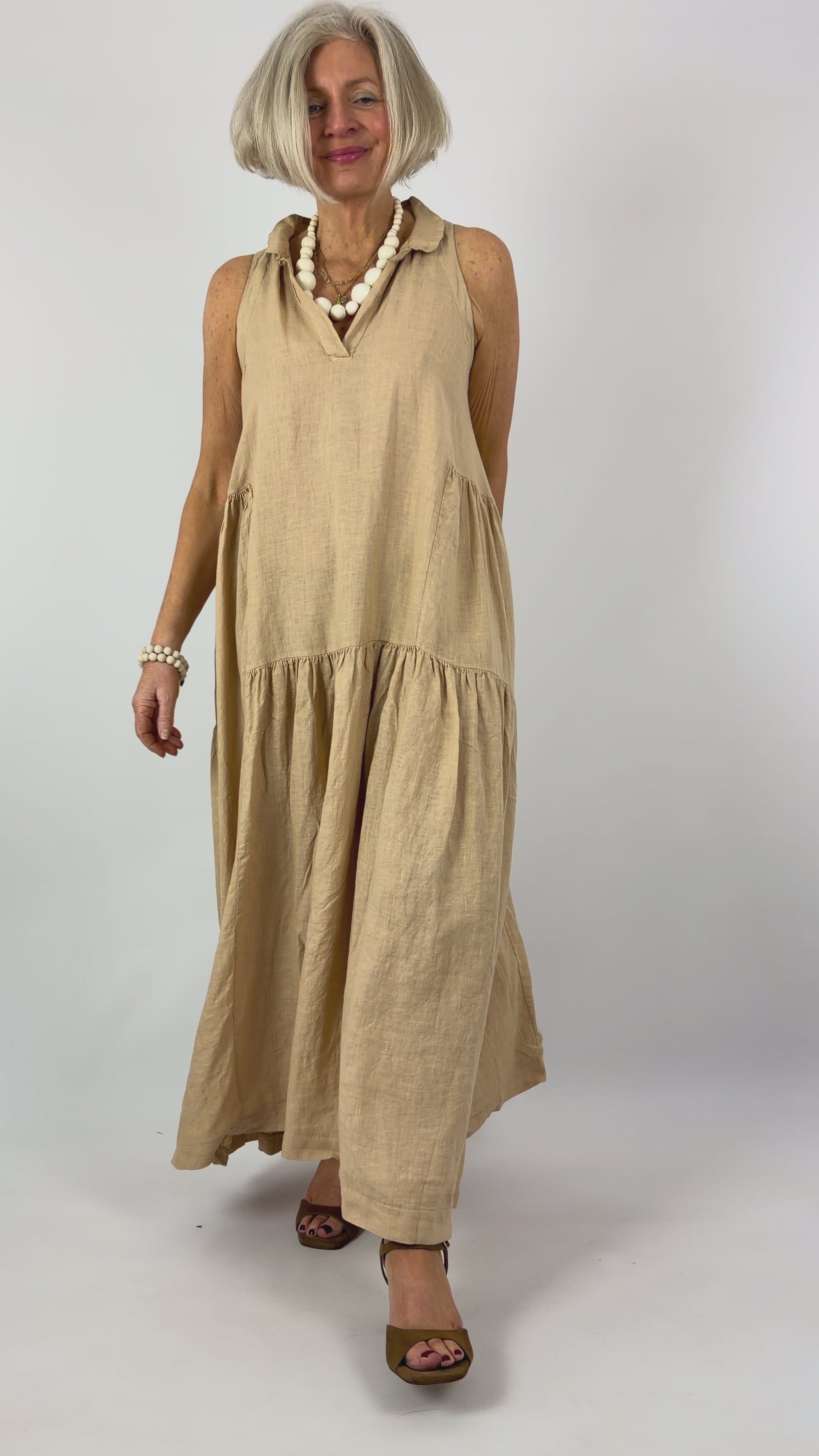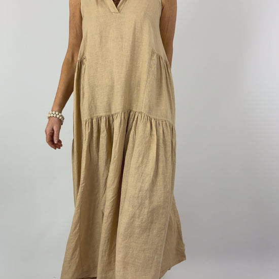 Crafted from premium linen, this sleeveless dress epitomises effortless summer elegance. The flattering V-neckline and small collar design create a refined silhouette, while the gathered dropped waistline defines the frame without restriction. Front pockets offer practical functionality, and the loose, floaty cut ensures breathable comfort through warm weather. A versatile piece that transitions seamlessly from casual daytime wear to relaxed evening occasions.