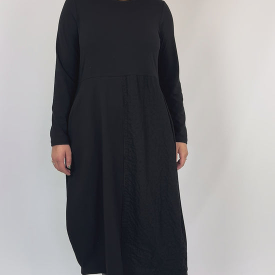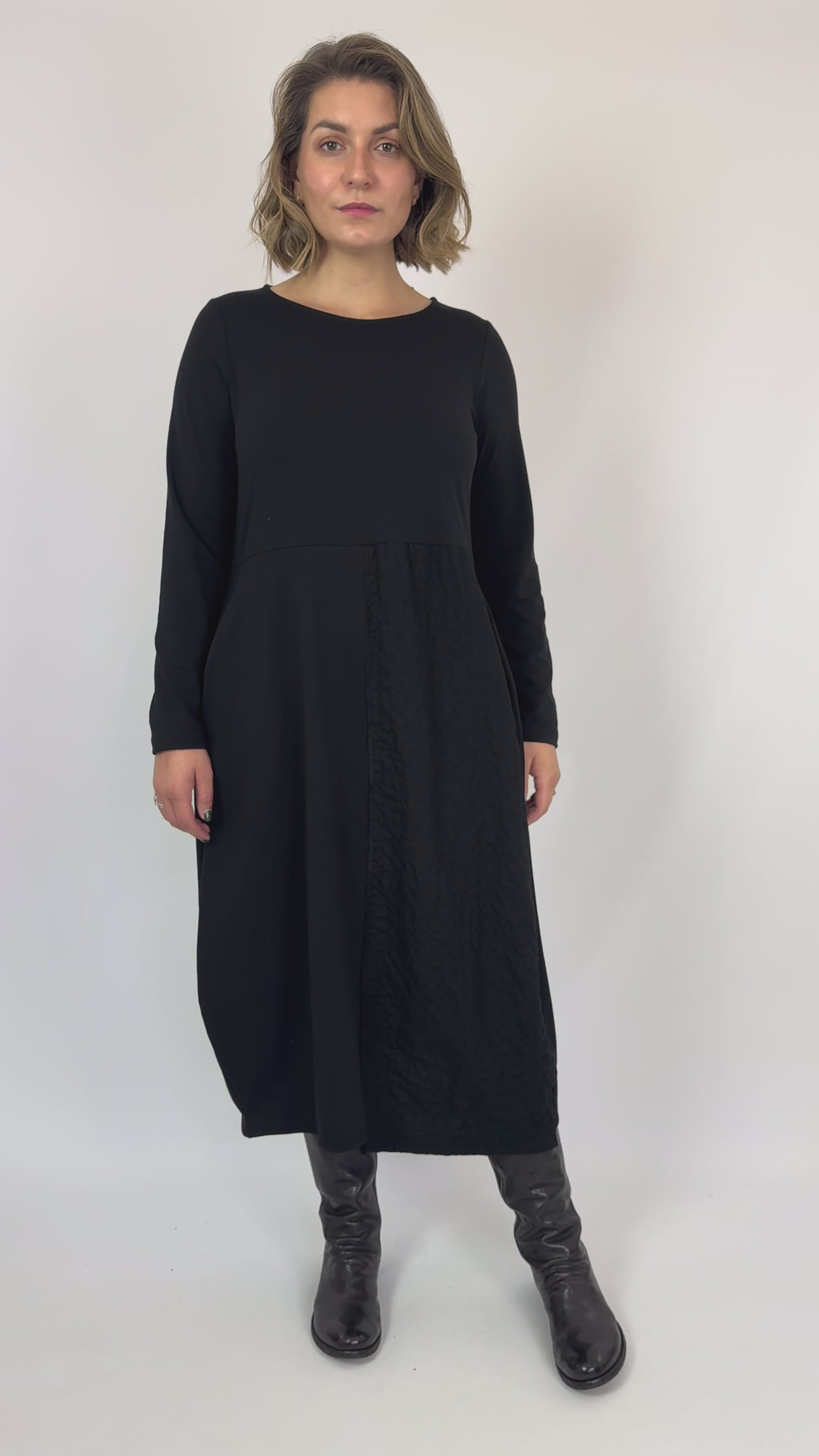 This Mama b Mis Su Dress in Black combines comfort and style with its soft, stretchy jersey top and distinctive black waffle cotton bottom detailing on one side. Featuring a round neckline and long sleeves for a relaxed yet polished look. Ideal for effortless everyday wear, this dress offers a unique blend of textures that enhance both fit and function.