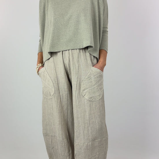 Expertly crafted trousers featuring a graceful wide tulip silhouette that flatters the figure. The pale grey base with delicate white check detailing creates understated sophistication, while angled patch pockets add contemporary visual interest. An elasticated waistline ensures comfort without compromising the polished aesthetic. A versatile piece that transitions effortlessly from casual to refined occasions.