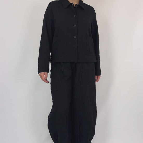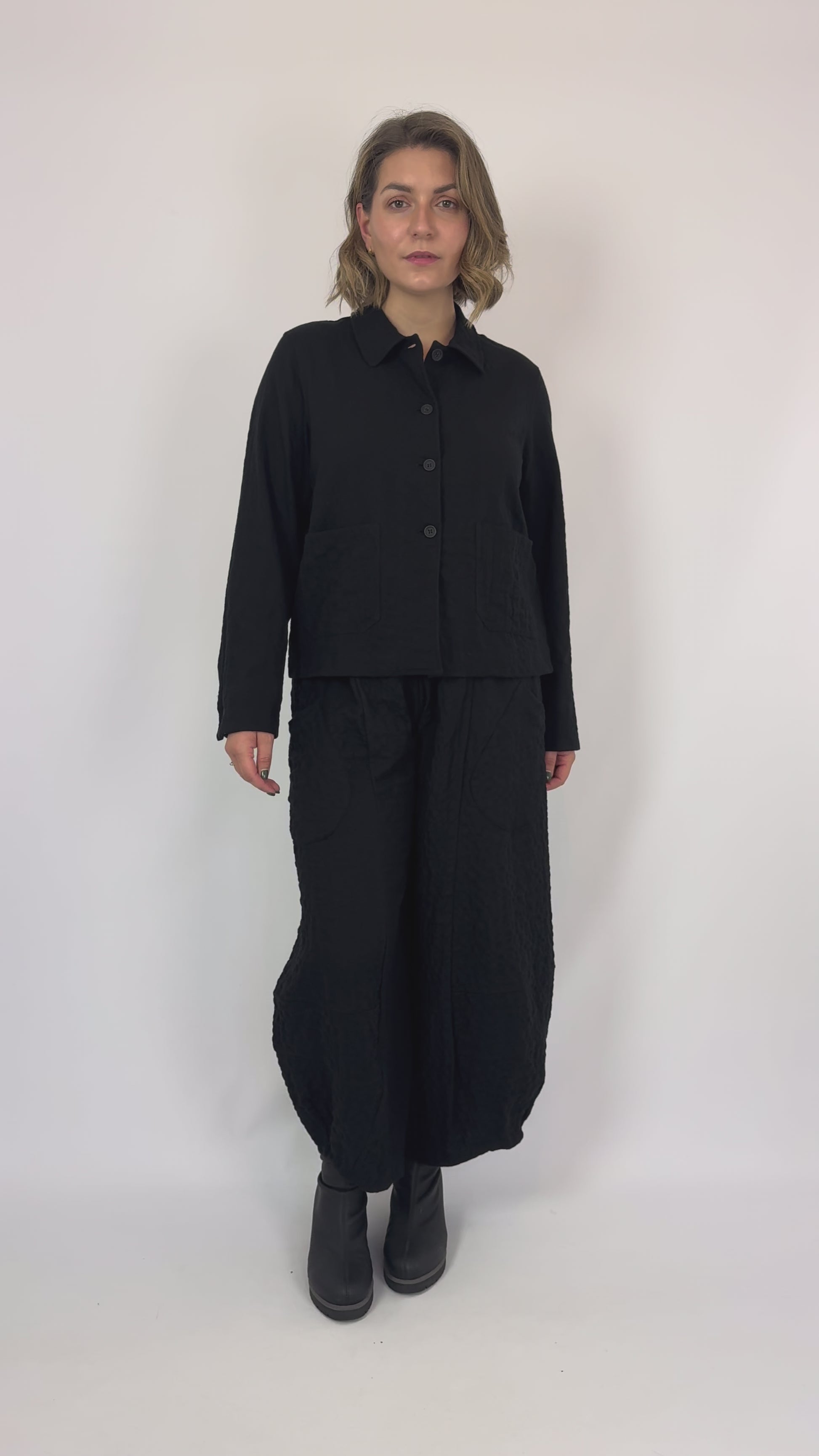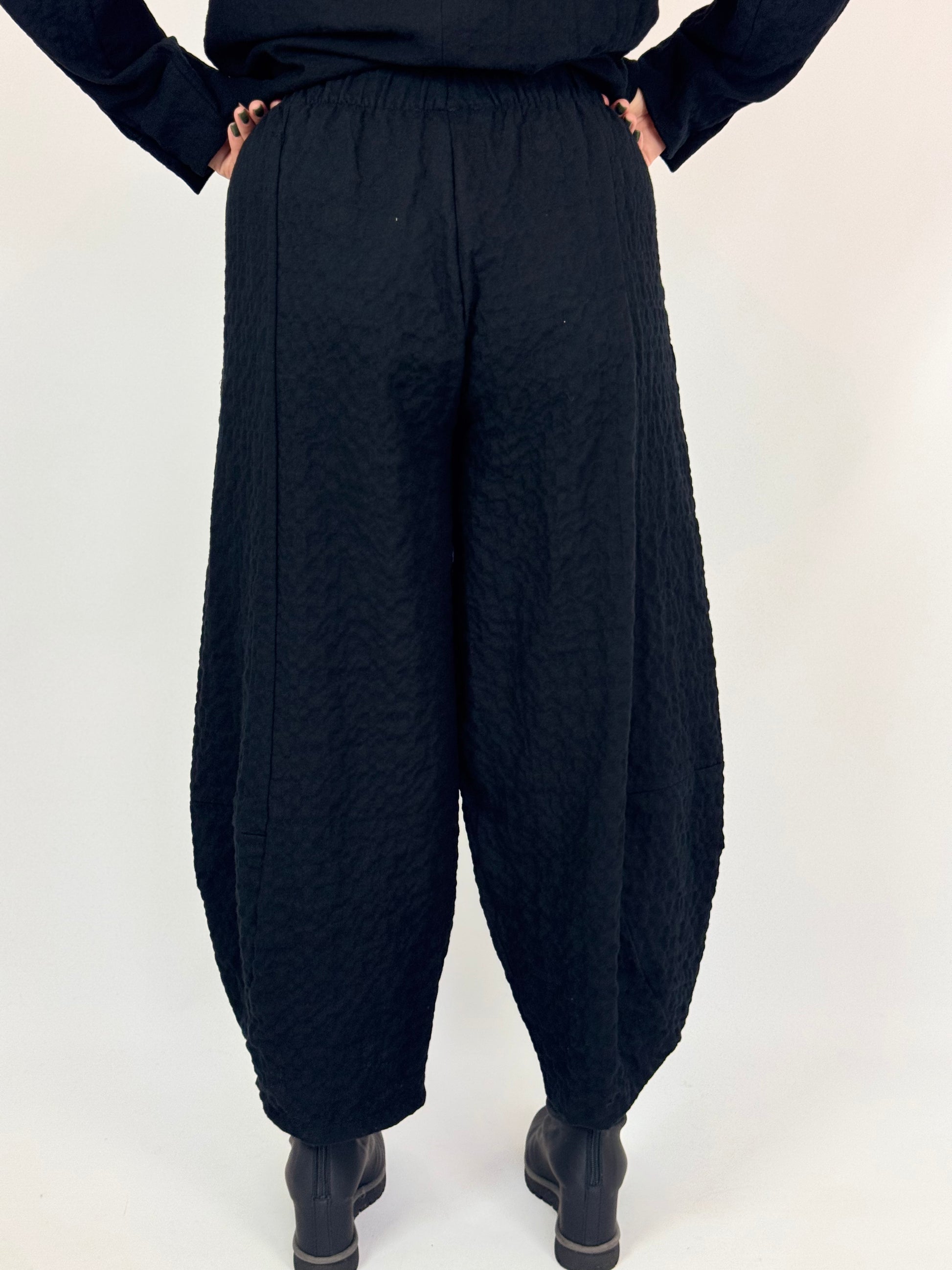 These Mama b Pace Su Trousers in Nero feature a wide balloon silhouette combined with an elasticated waistline for comfortable, adaptable wear. Crafted from waffle cotton, they provide breathable texture and subtle warmth. Angled patch pockets add functional detail while enhancing the relaxed yet structured design, making these trousers a versatile choice for sophisticated casual dressing.