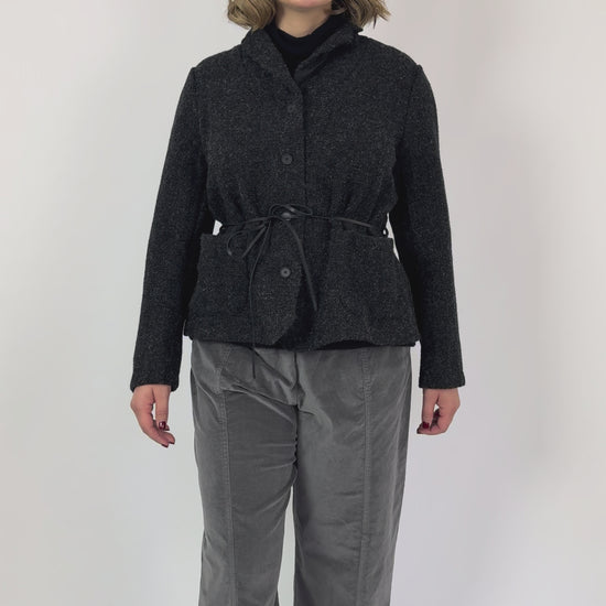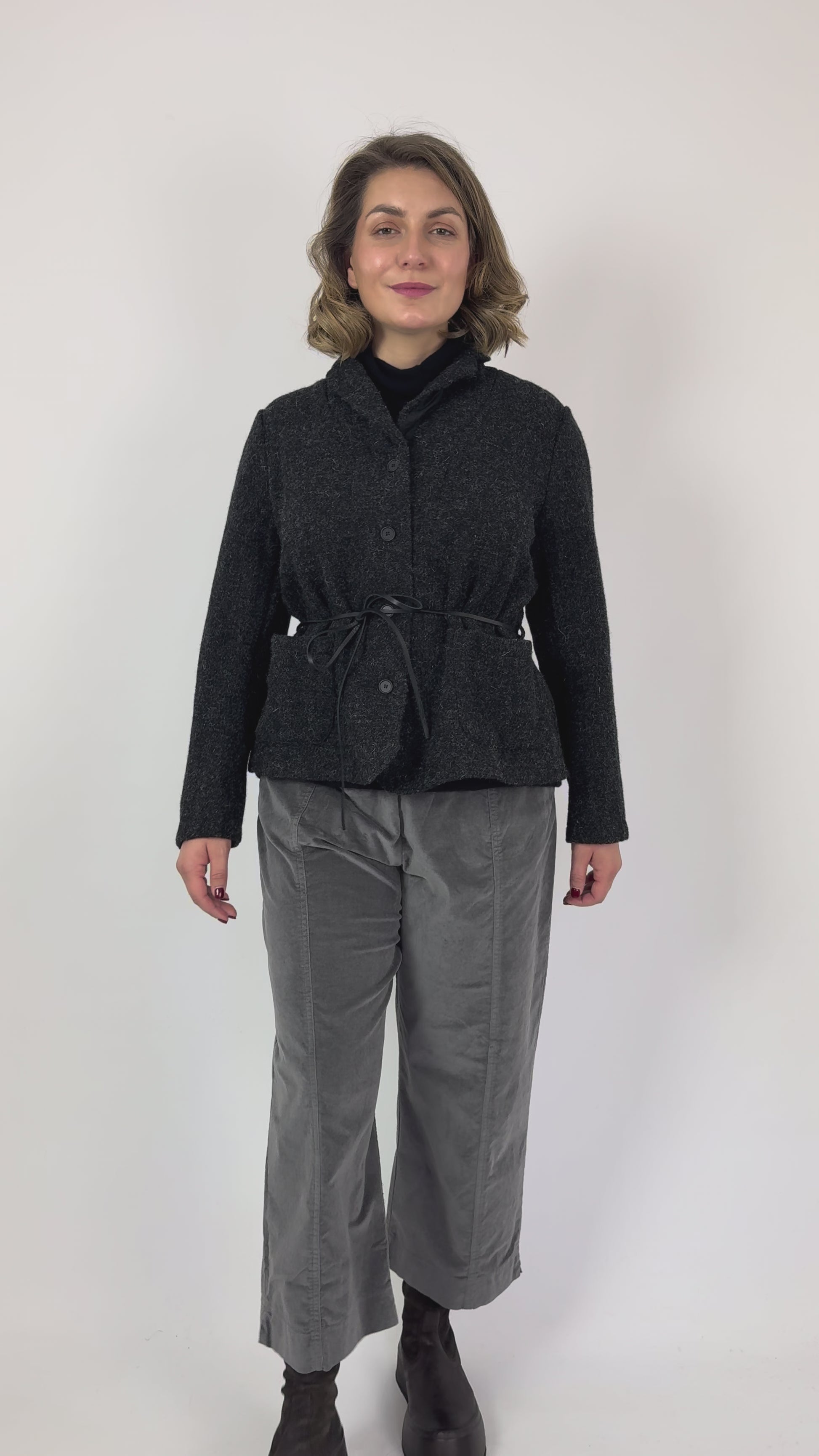 This Manuelle Guibal 6942 Tweedy Jacket in Graphite offers a refined fit with its tailored silhouette and button-front closure. Crafted from classic Harris tweed, it features a collar and two practical front patch pockets. The unlined design enhances comfort and flexibility, while the leather tie at the waist allows for an adjustable, flattering shape. Ideal for layering, this jacket blends traditional craftsmanship with contemporary style.
