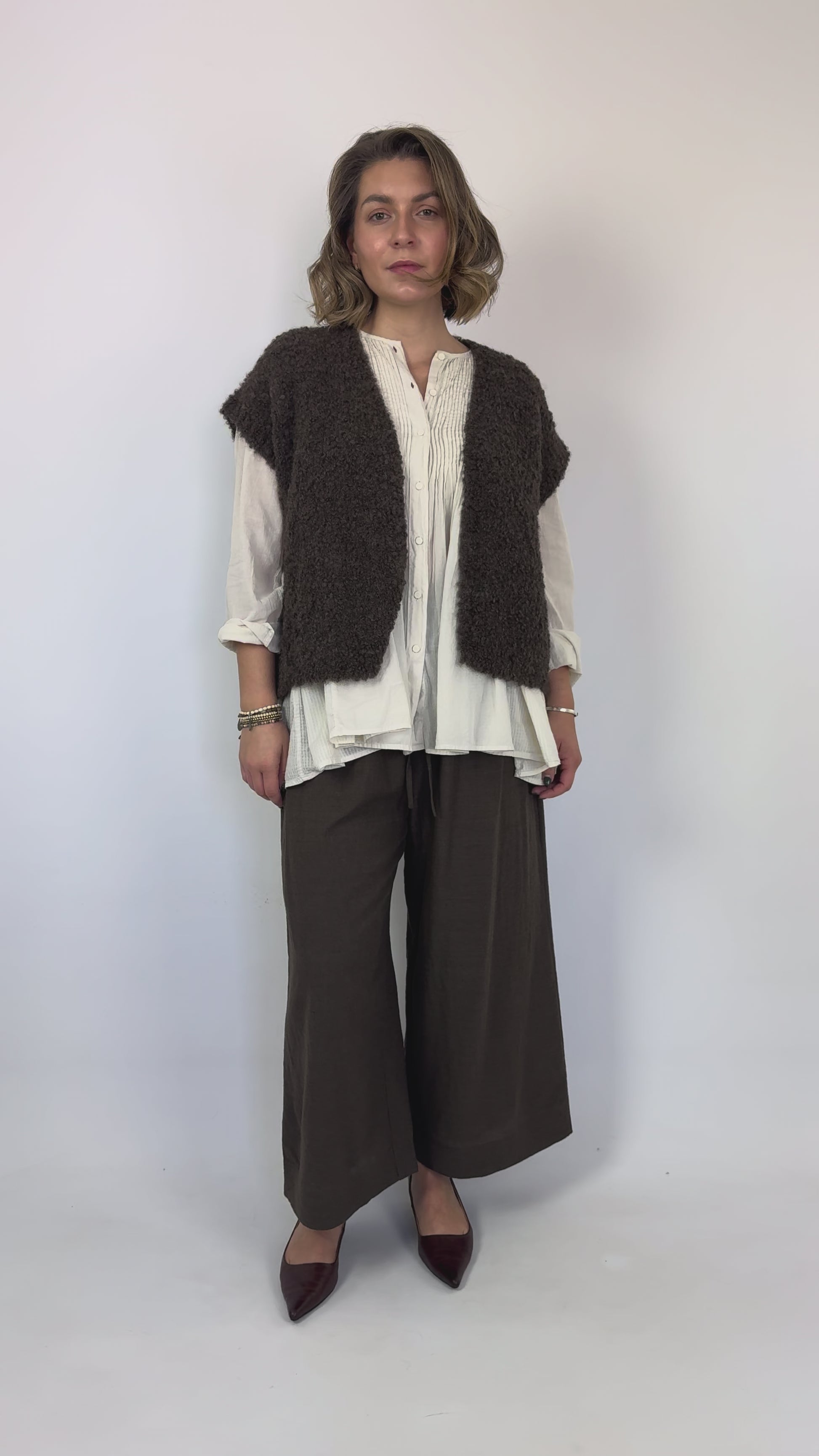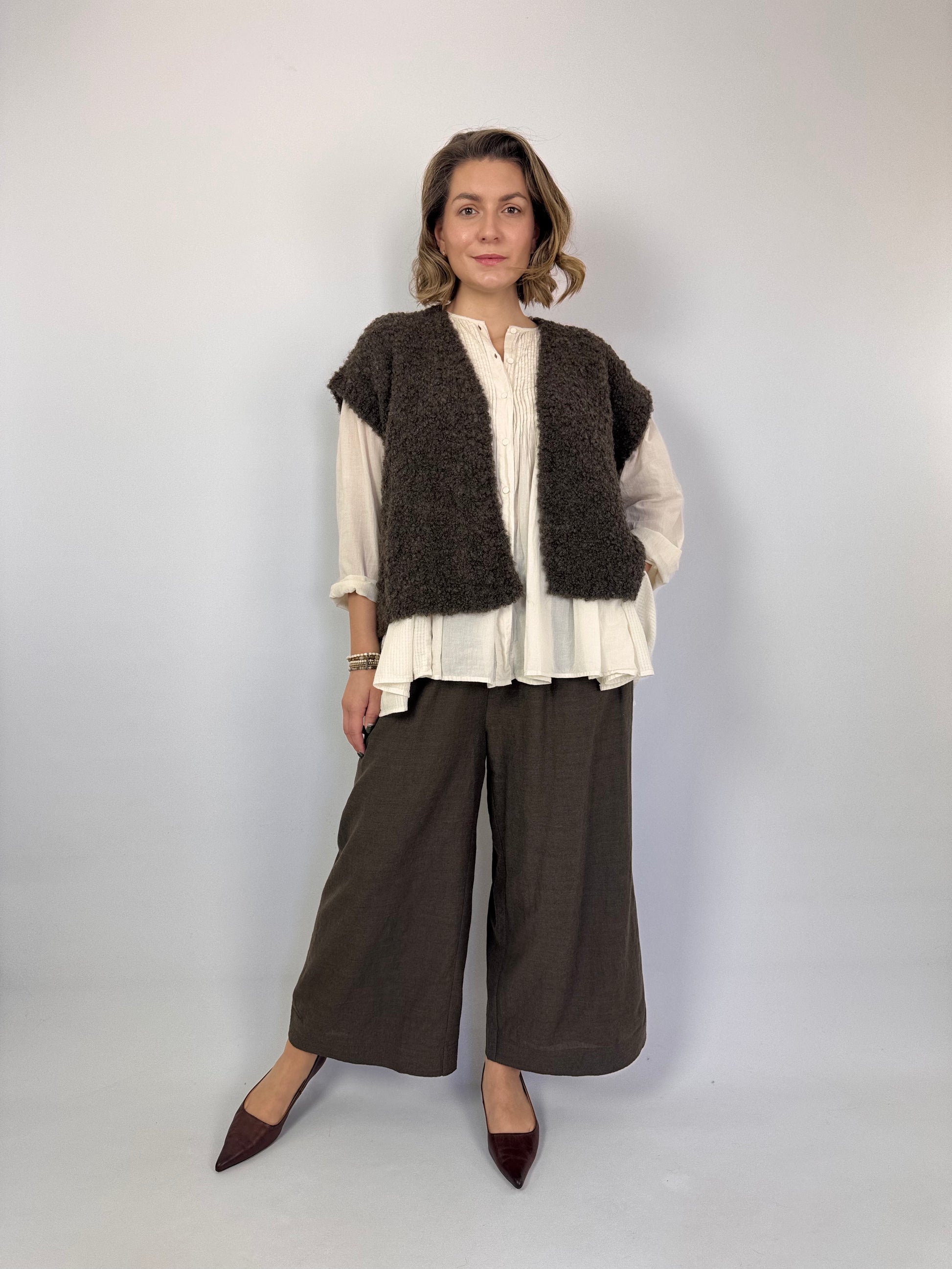 This chunky sleeveless cardigan showcases a short, boxy silhouette crafted from a blend of alpaca and wool, offering exceptional softness and warmth. Its standout feature is a removable oversized safety pin fastening, which adds a distinctive, modern edge while allowing versatile styling options. Ideal for layering, this piece combines comfort with sophisticated design, making it a refined addition to any expert wardrobe.