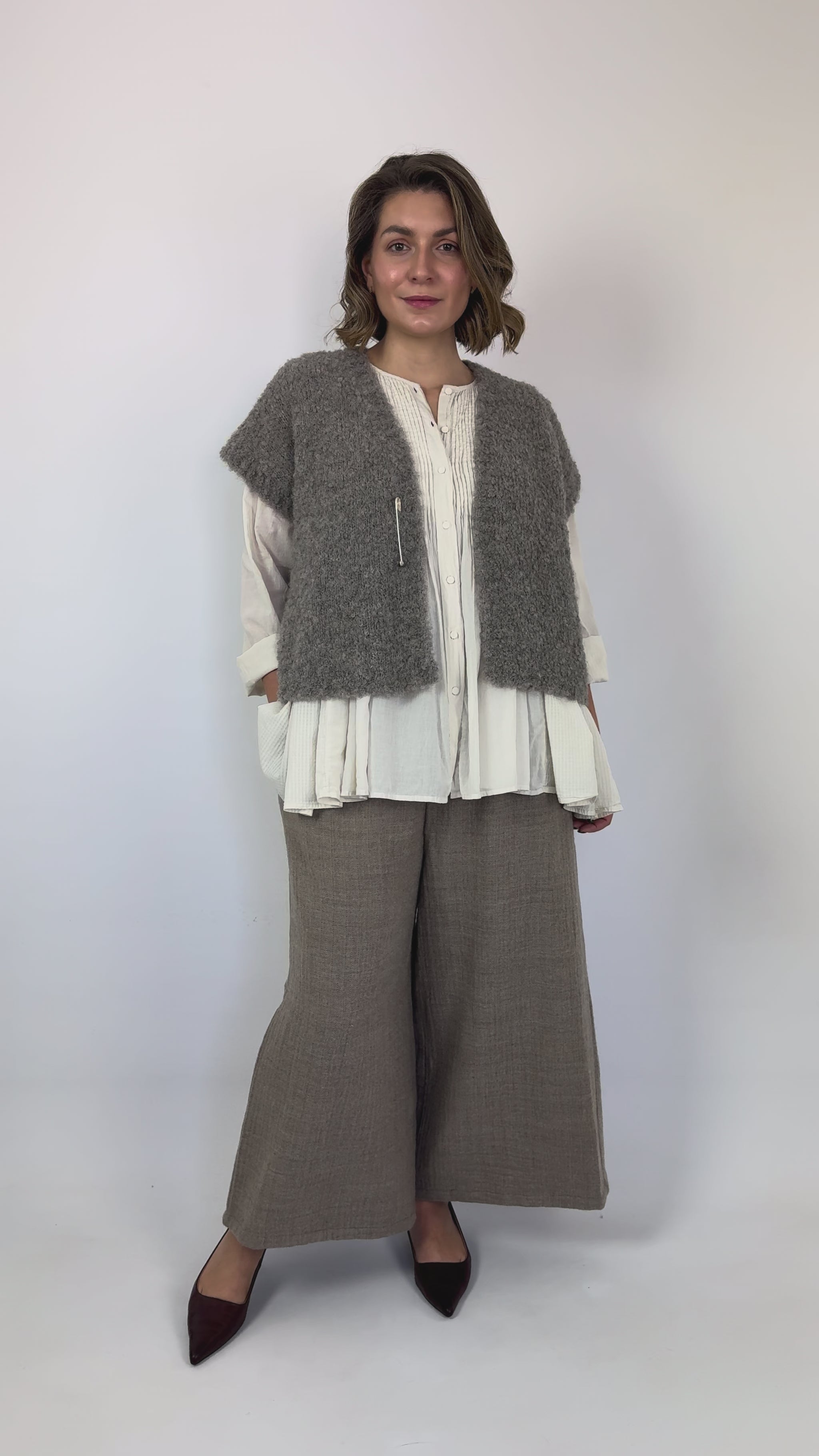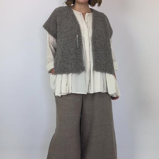 This chunky sleeveless cardigan showcases a short, boxy silhouette crafted from a blend of alpaca and wool, offering exceptional softness and warmth. Its standout feature is a removable oversized safety pin fastening, which adds a distinctive, modern edge while allowing versatile styling options. Ideal for layering, this piece combines comfort with sophisticated design, making it a refined addition to any expert wardrobe.