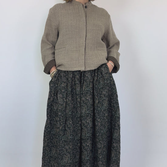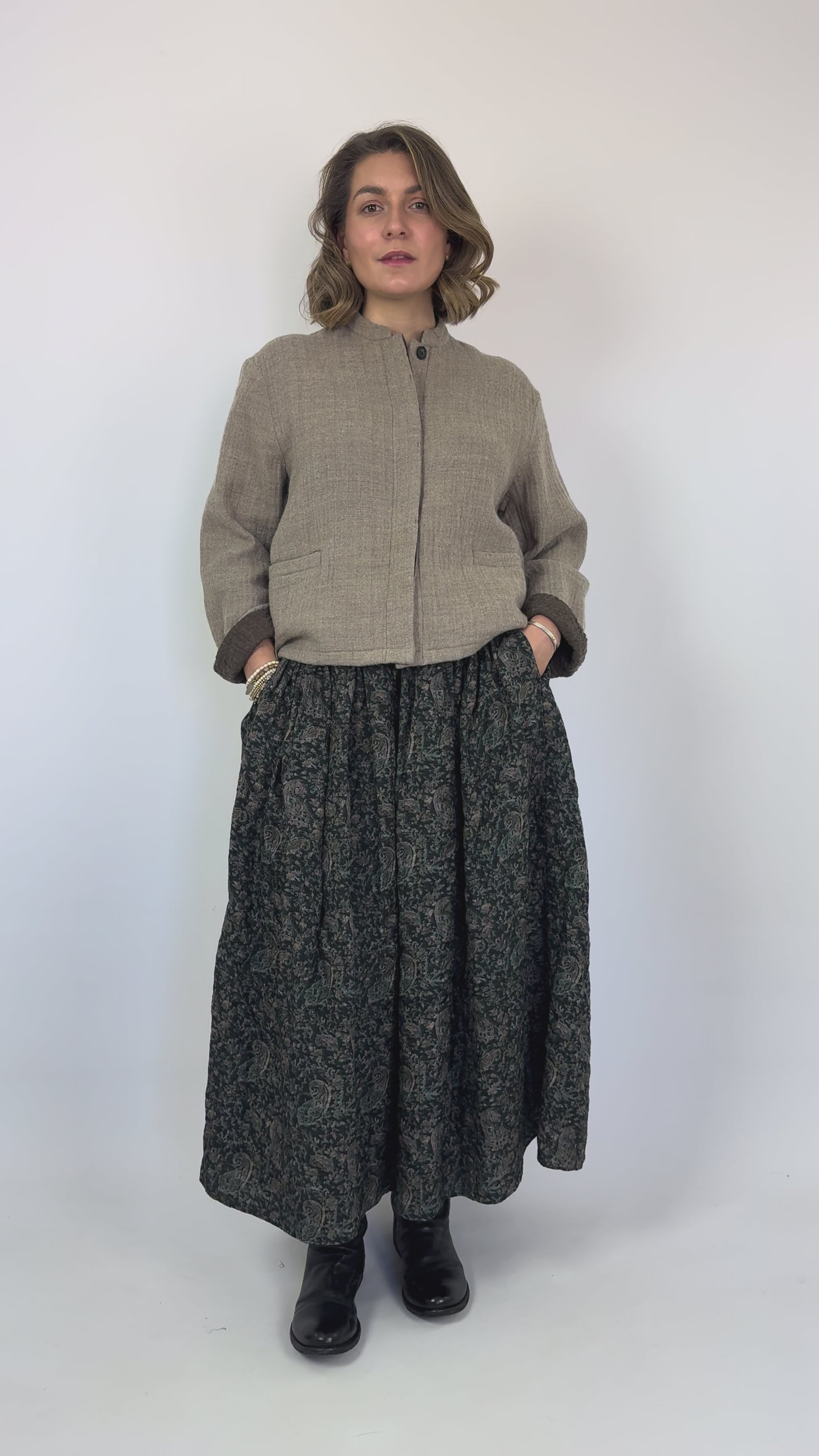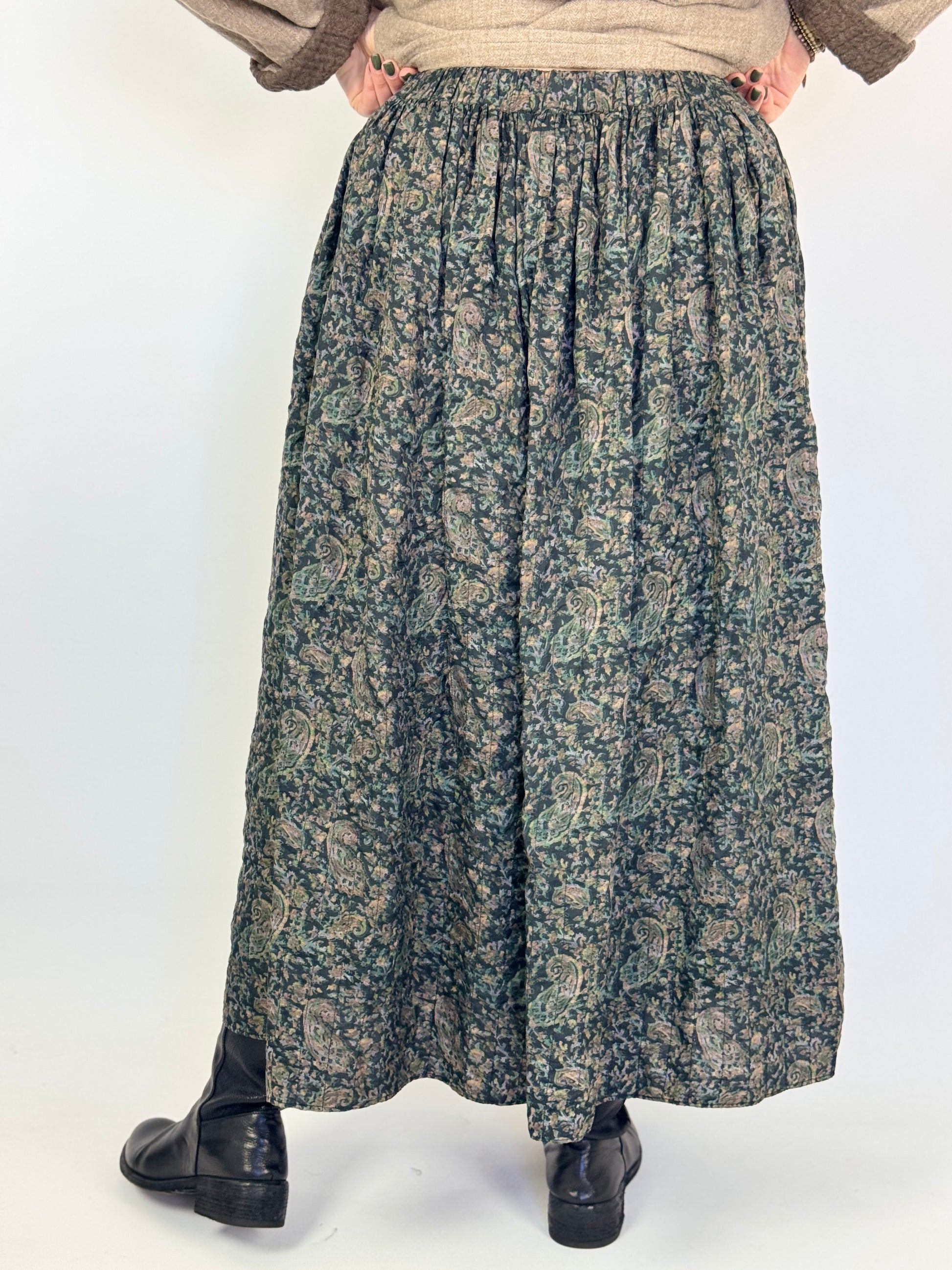Elevate your wardrobe with the Maison de Soil 574 Paisley Skirt in Black, crafted from luxurious silk and lined with soft cotton for added comfort. Featuring a gathered a-line shape and an elasticated waistline, this skirt offers a flattering yet relaxed fit. The intricate paisley print adds an elegant, timeless touch, while practical side pockets enhance functionality. Perfect for dressy occasions, it blends sophisticated style with everyday ease.