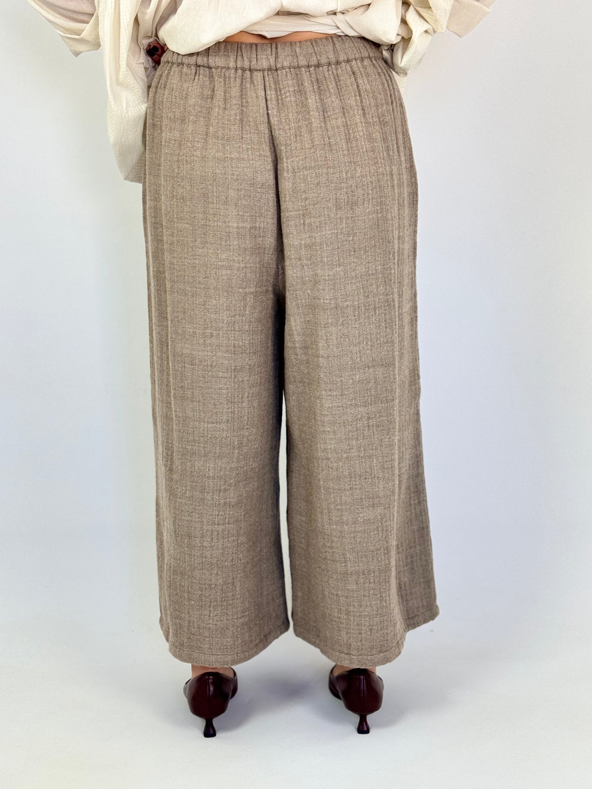 The Maison de Soil 612 Culottes in Camel blend a refined wool and cotton mix to deliver both comfort and durability. Designed with a wide cut and an elasticated waistline, these culottes offer a relaxed yet sophisticated silhouette, ideal for versatile styling. Functional wide pockets add practicality without compromising elegance, making this piece a polished addition to any wardrobe seeking effortless style with expert craftsmanship.