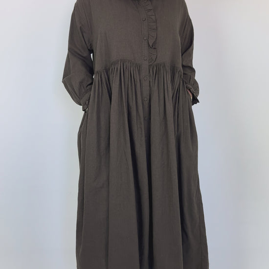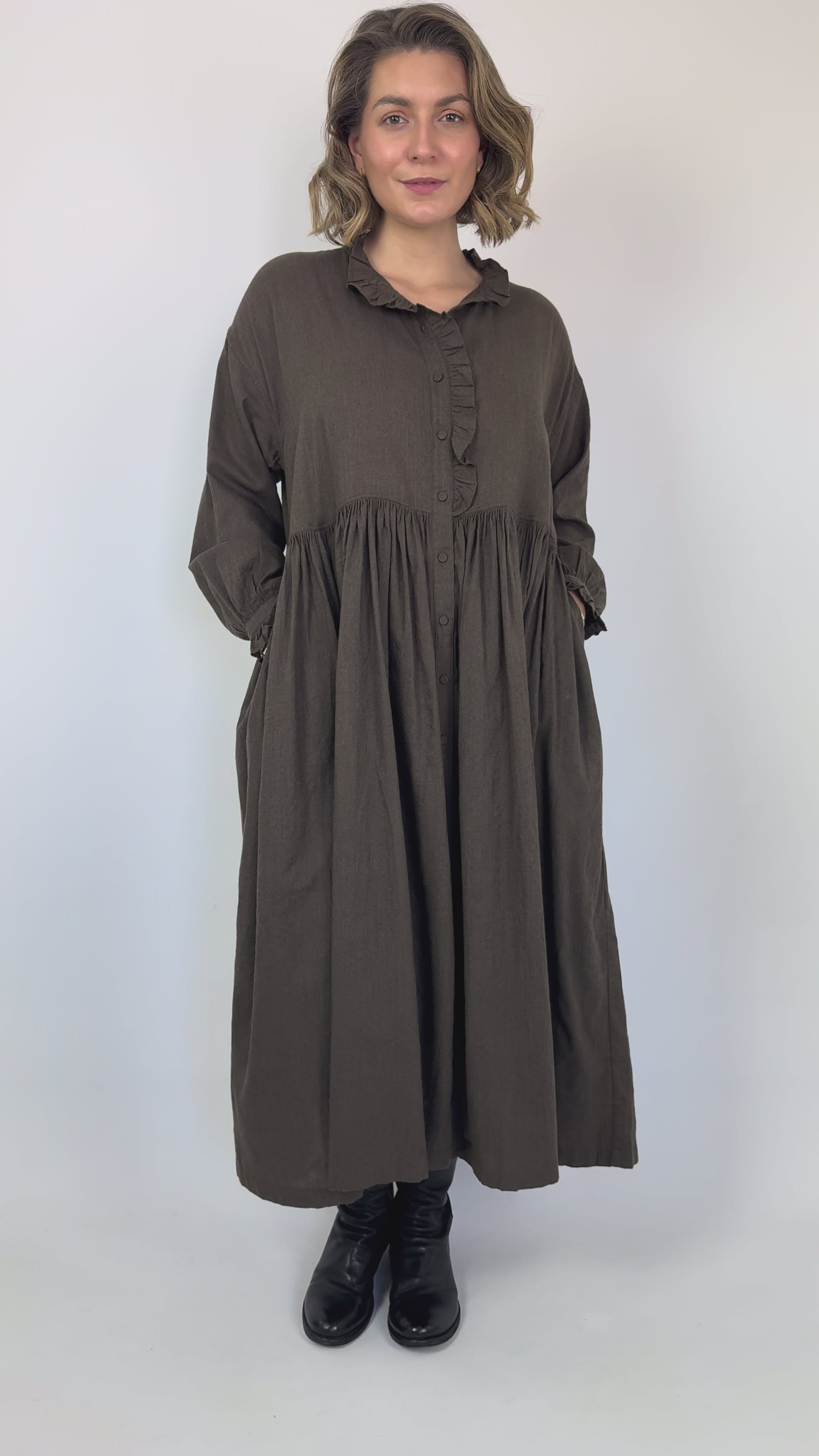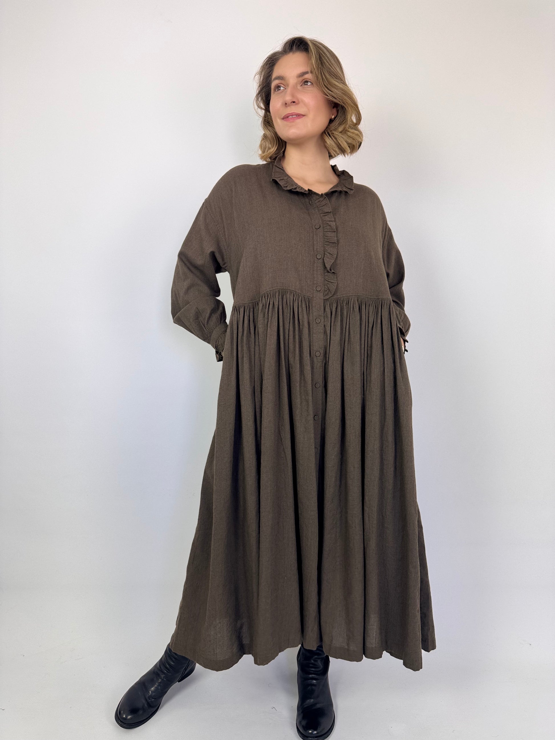Crafted from a refined blend of wool, cotton, and silk, this Maison de Soil 754 Frill Collar Dress in Brown offers a luxurious feel with expert tailoring. Its loose fit ensures comfort, while the button-front design adds timeless versatility. The gathered waistline shapes the silhouette subtly, complemented by delicate frill detailing that frames the neckline and extends along the front button placket to the waist, adding an elegant, feminine touch to this sophisticated dress. Ideal for those seeking effortless style with meticulous attention to fabric and detail.