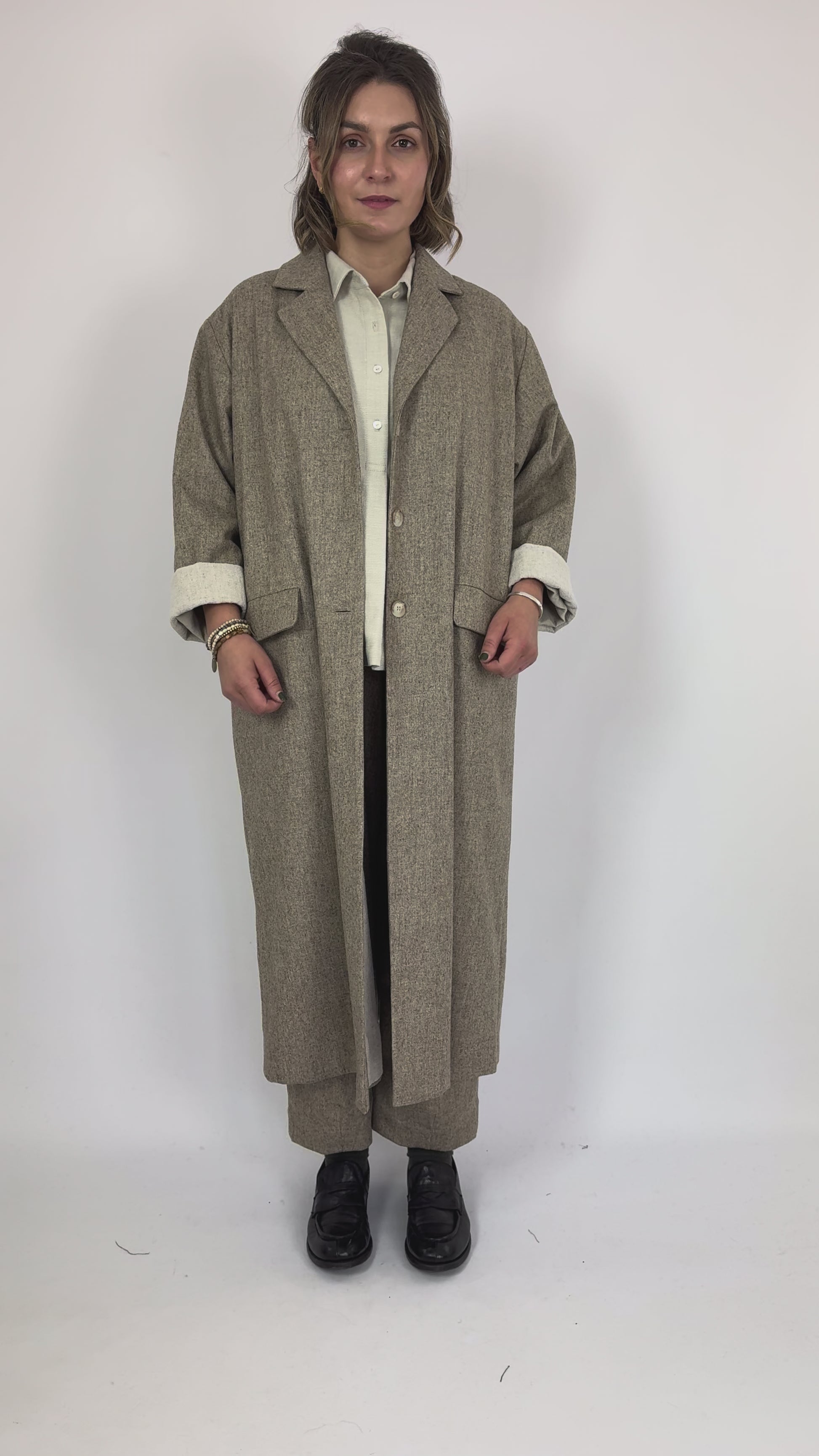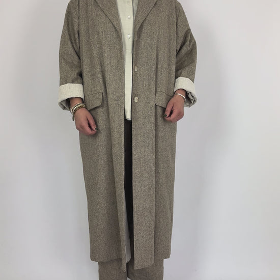 This expertly tailored long coat features a graceful loose silhouette enhanced by a finely crafted collar, front pockets, and a distinctive back split for ease of movement. Its wool blend outer layer ensures warmth and durability, while the linen and cotton lining guarantees breathability and comfort. Perfect for layering, this coat combines timeless elegance with practical design.