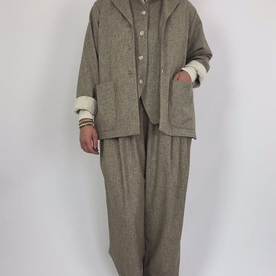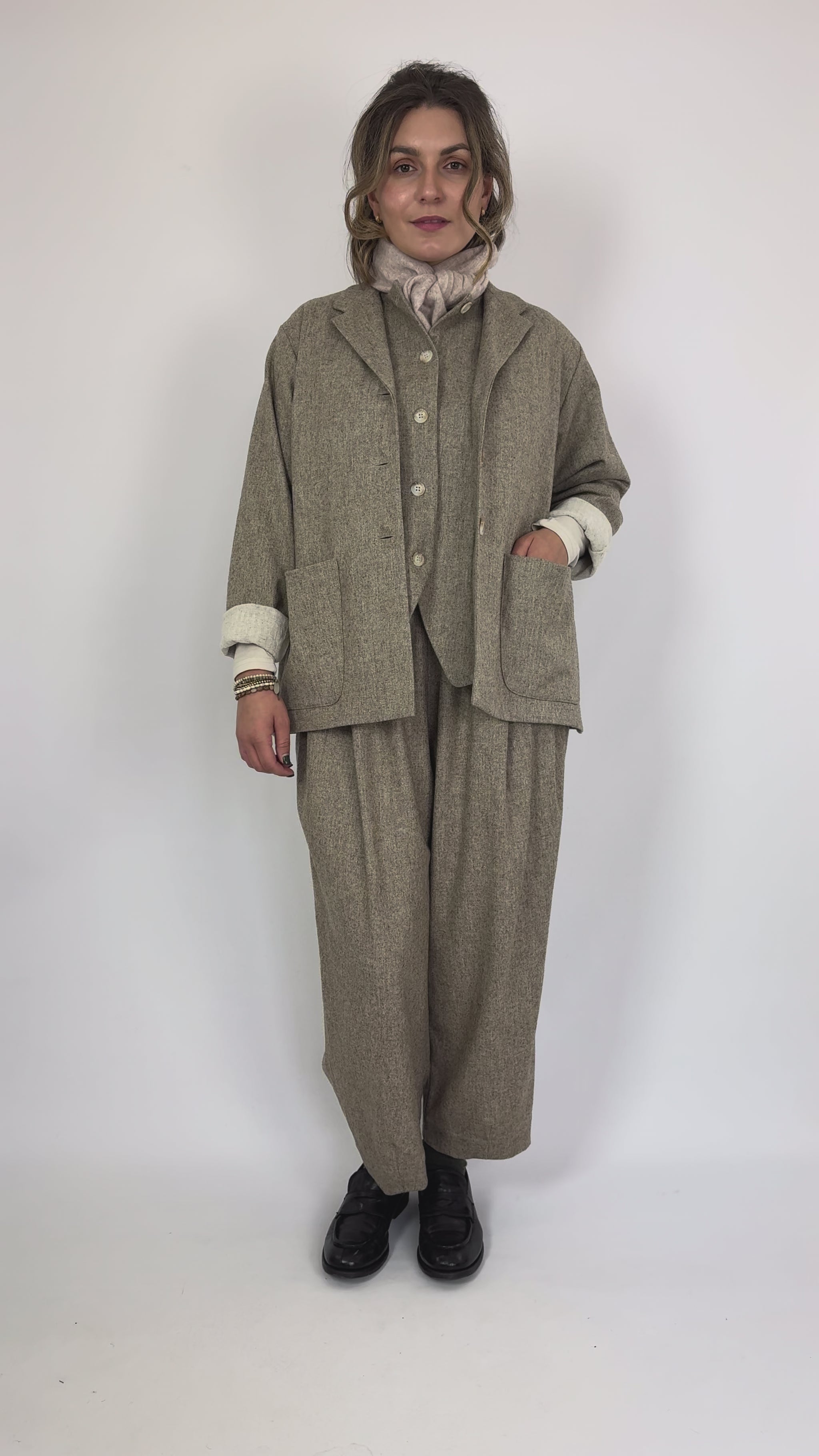 The Muku C1379 Jacket in beige features a beautifully tailored design crafted from a wool blend outer, complemented by a breathable linen and cotton lining for comfort. Its loose silhouette offers effortless style and movement, while the classic button front and two front pockets add timeless functionality. A refined collar completes this versatile jacket, making it a sophisticated addition to any wardrobe.