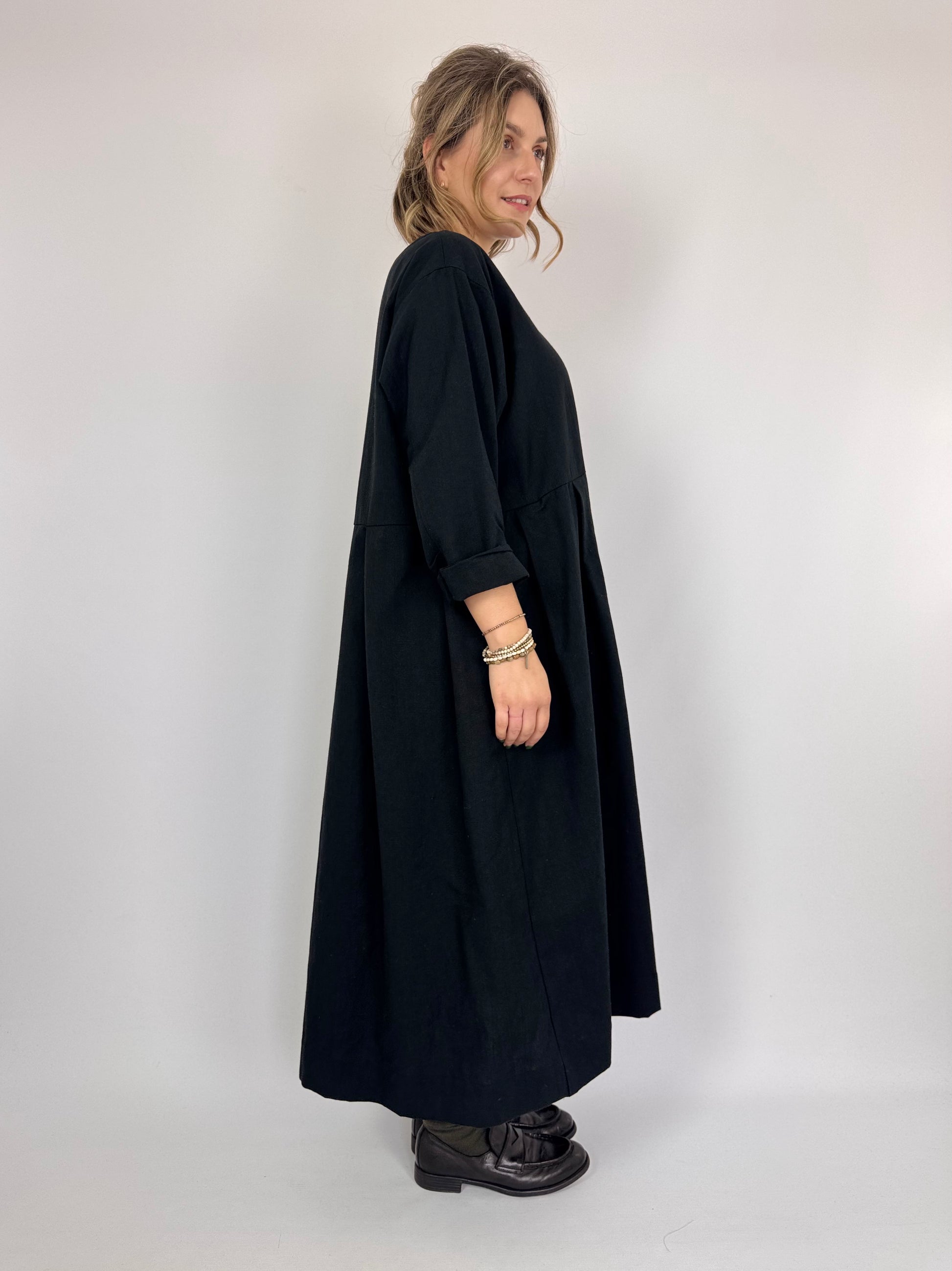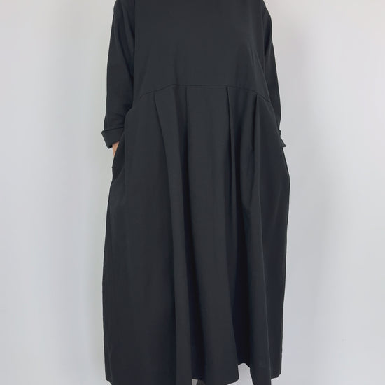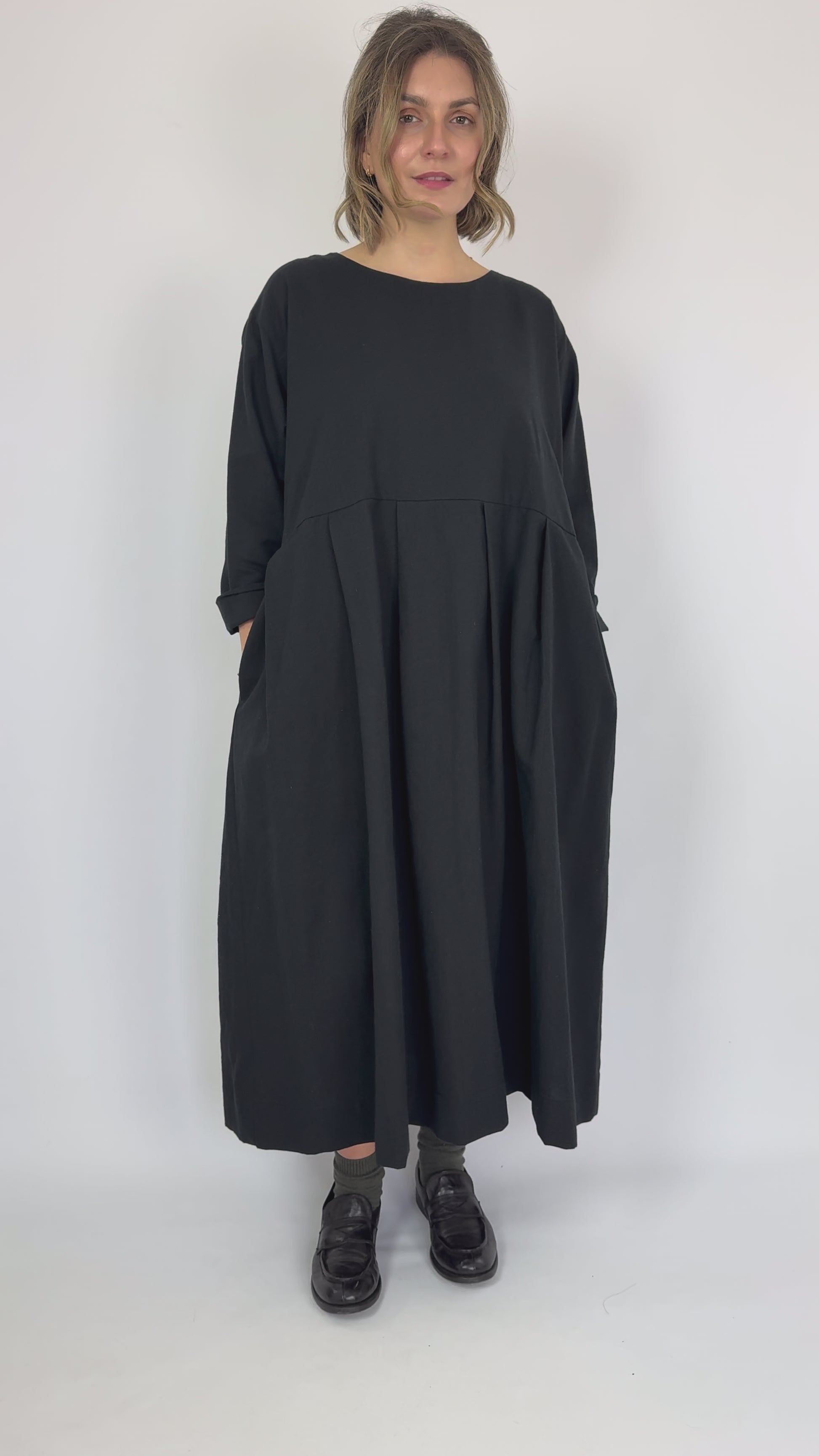 The Muku C1398 Dress in Black combines comfort and sophistication with its loose, oversized silhouette and round neckline. Crafted from a breathable linen, cotton, and wool blend, it features a pleated skirt that adds graceful movement and side seam pockets for practical elegance. Ideal for those seeking a refined yet relaxed wardrobe staple.