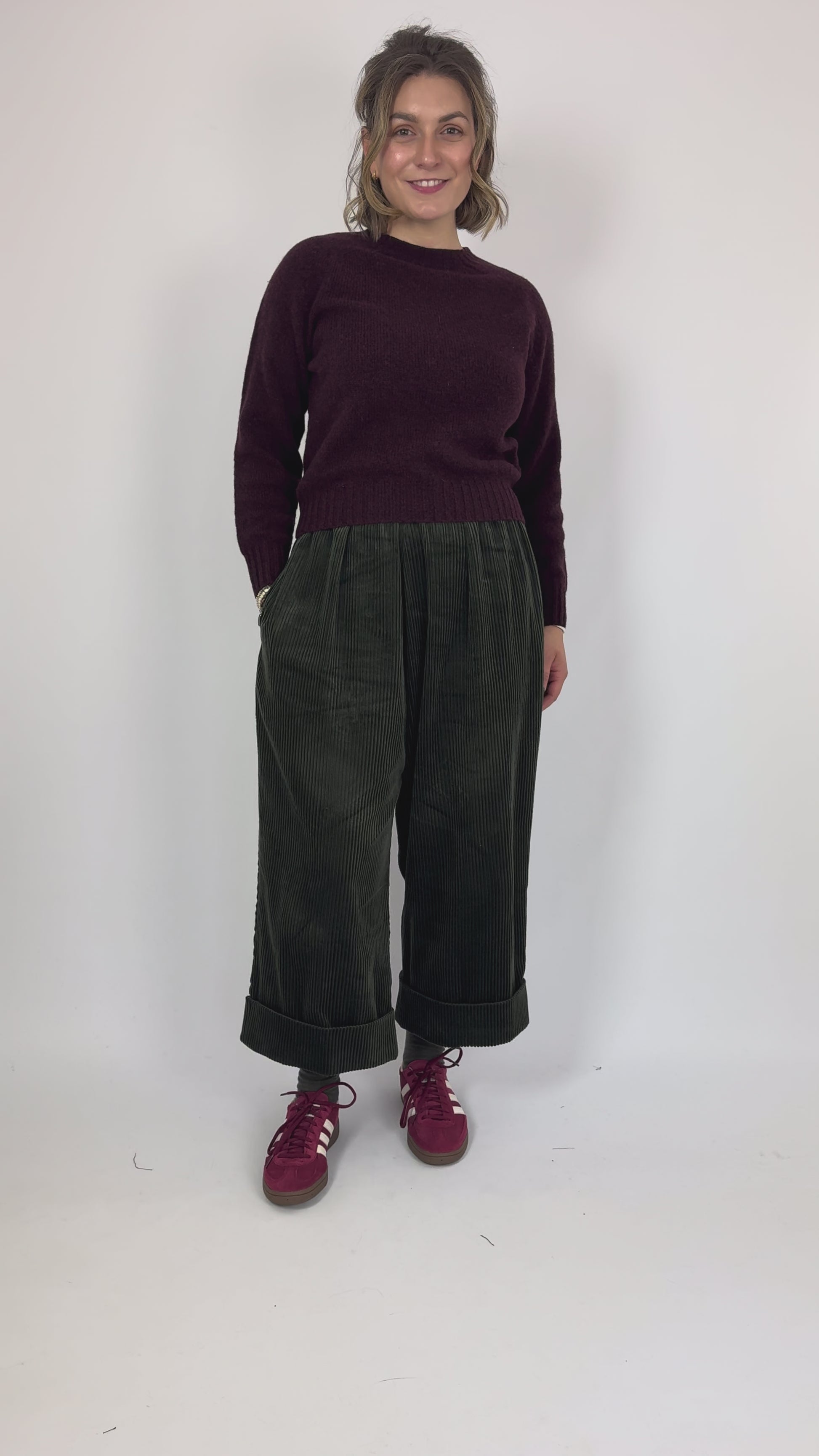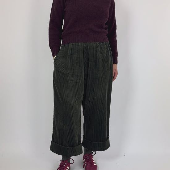 Experience comfort and style with the Muku C1409 Trousers Moss, crafted from soft chunky corduroy fabric. Designed with a wide, loose shape and an elasticated waistline for an easy, relaxed fit, these trousers also feature turned-up hemlines and convenient back pockets, combining practicality with a refined casual look. Ideal for those seeking both comfort and contemporary design in their wardrobe.