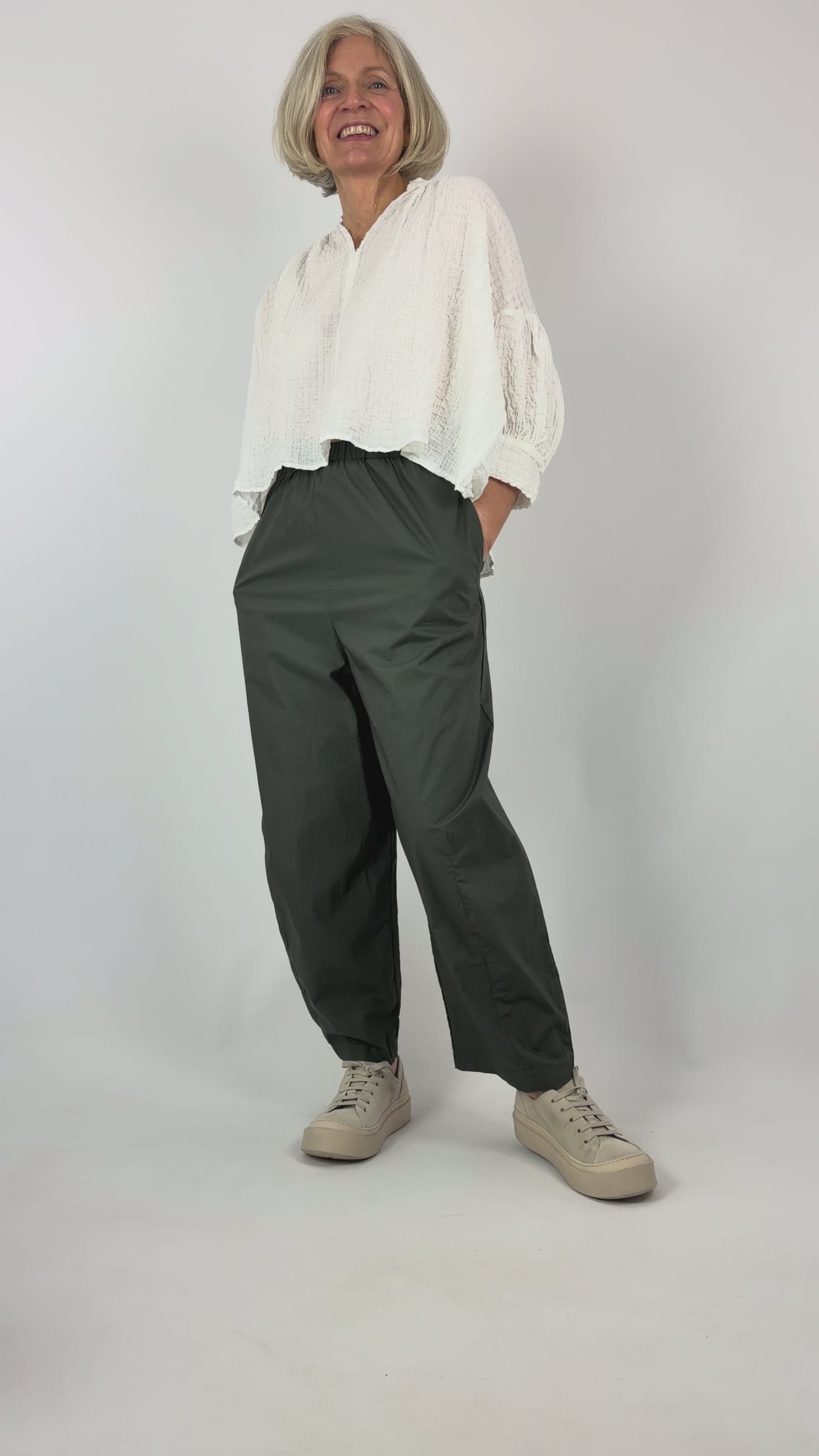 Crafted from crisp cotton, these Neirami trousers feature a distinctive wide balloon silhouette that balances volume with refined tailoring. The elasticated waistline ensures comfortable wear throughout the day, while practical side pockets add functionality. Signature seam detailing elevates the design, creating visual interest and structural definition. A versatile piece that transitions effortlessly from casual to smart-casual settings.