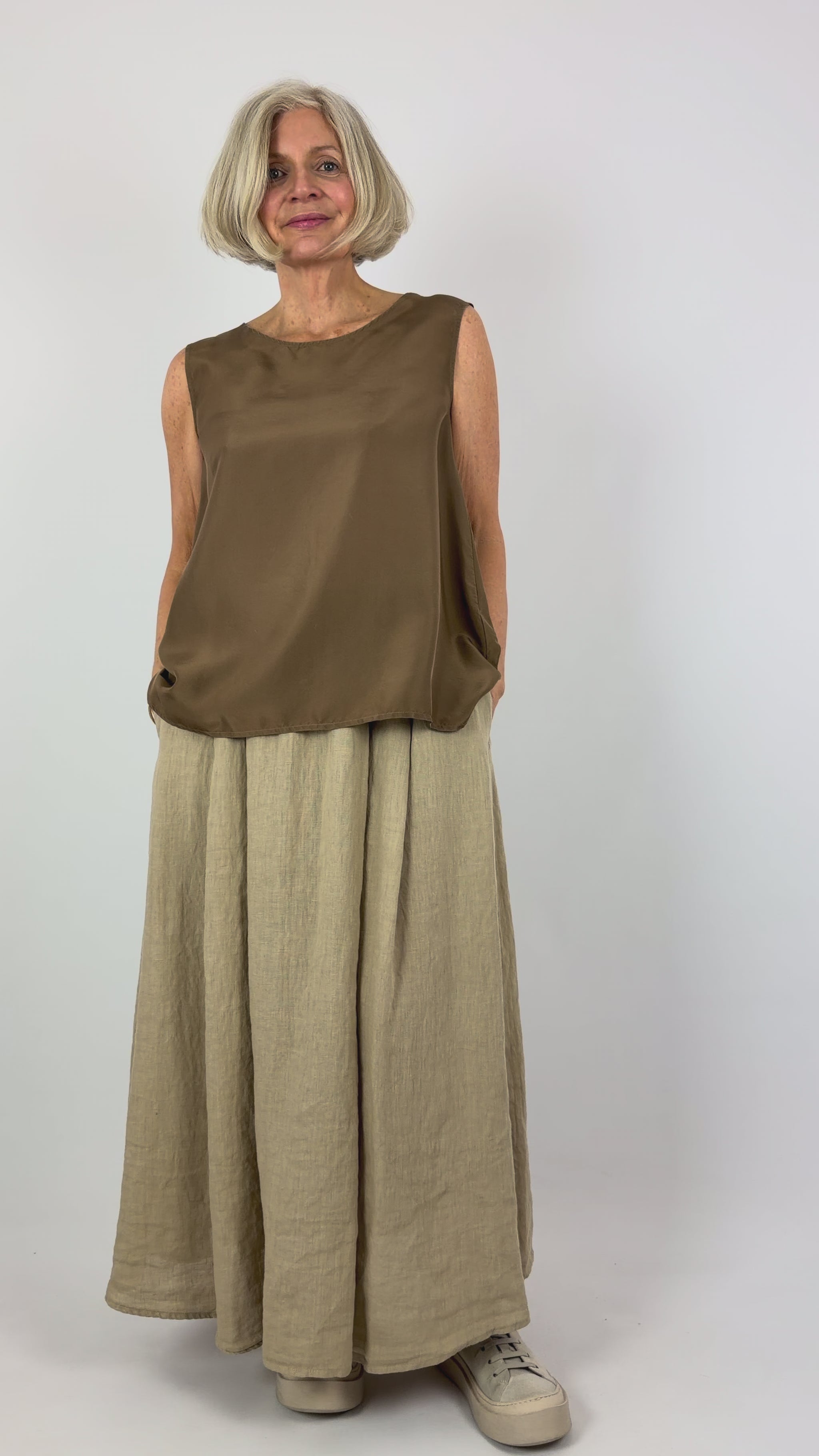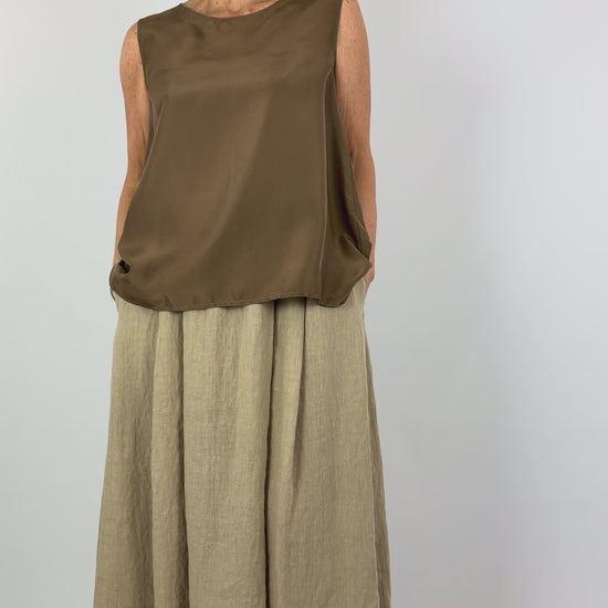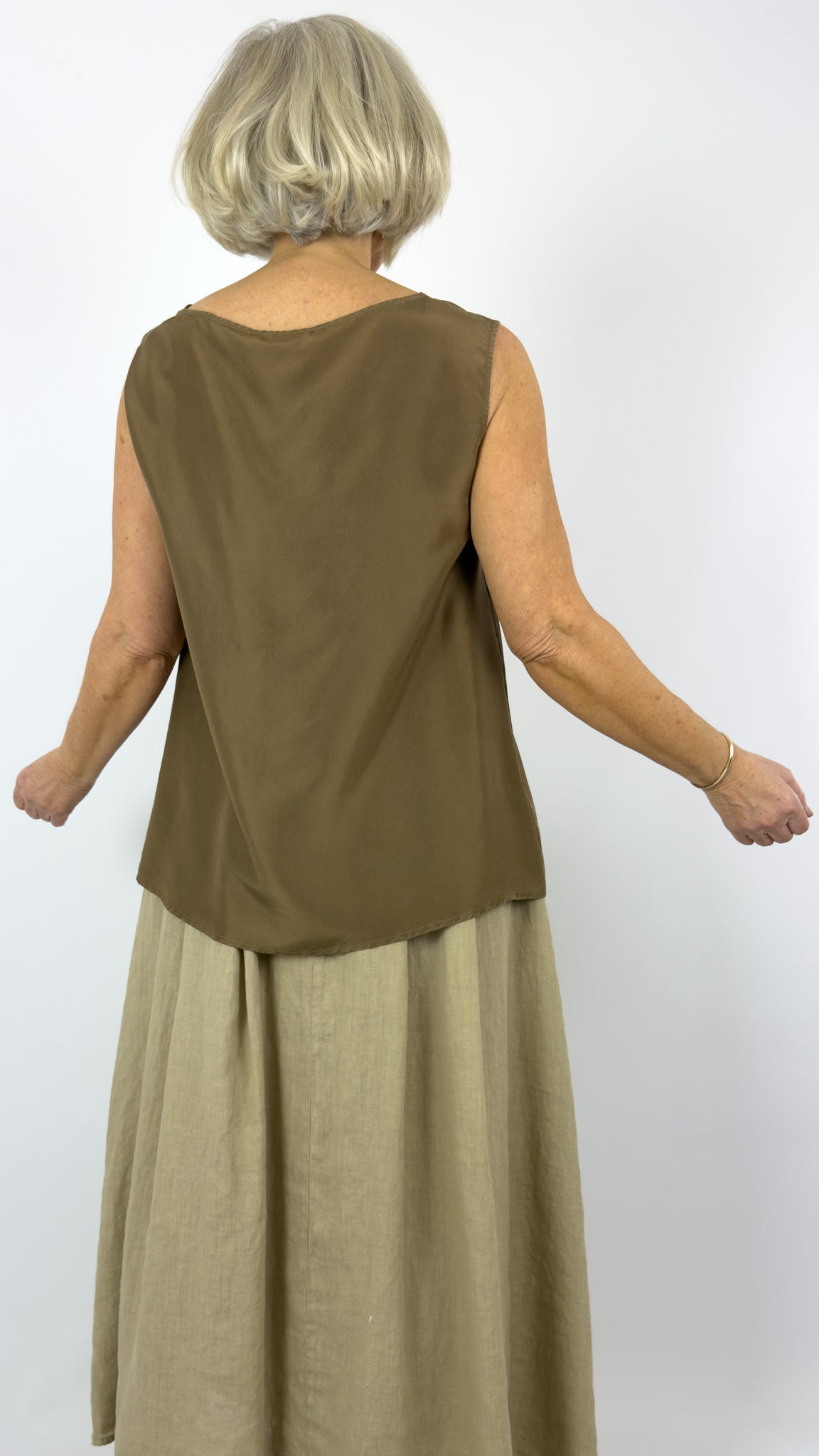 Crafted from luxurious silk, this sleeveless top features a refined round neckline that exudes understated sophistication. Its versatile design transitions effortlessly from standalone elegance to a layering essential, making it an indispensable addition to any discerning wardrobe. The fluid drape and premium fabric ensure a polished appearance whether worn alone or paired with complementary pieces.