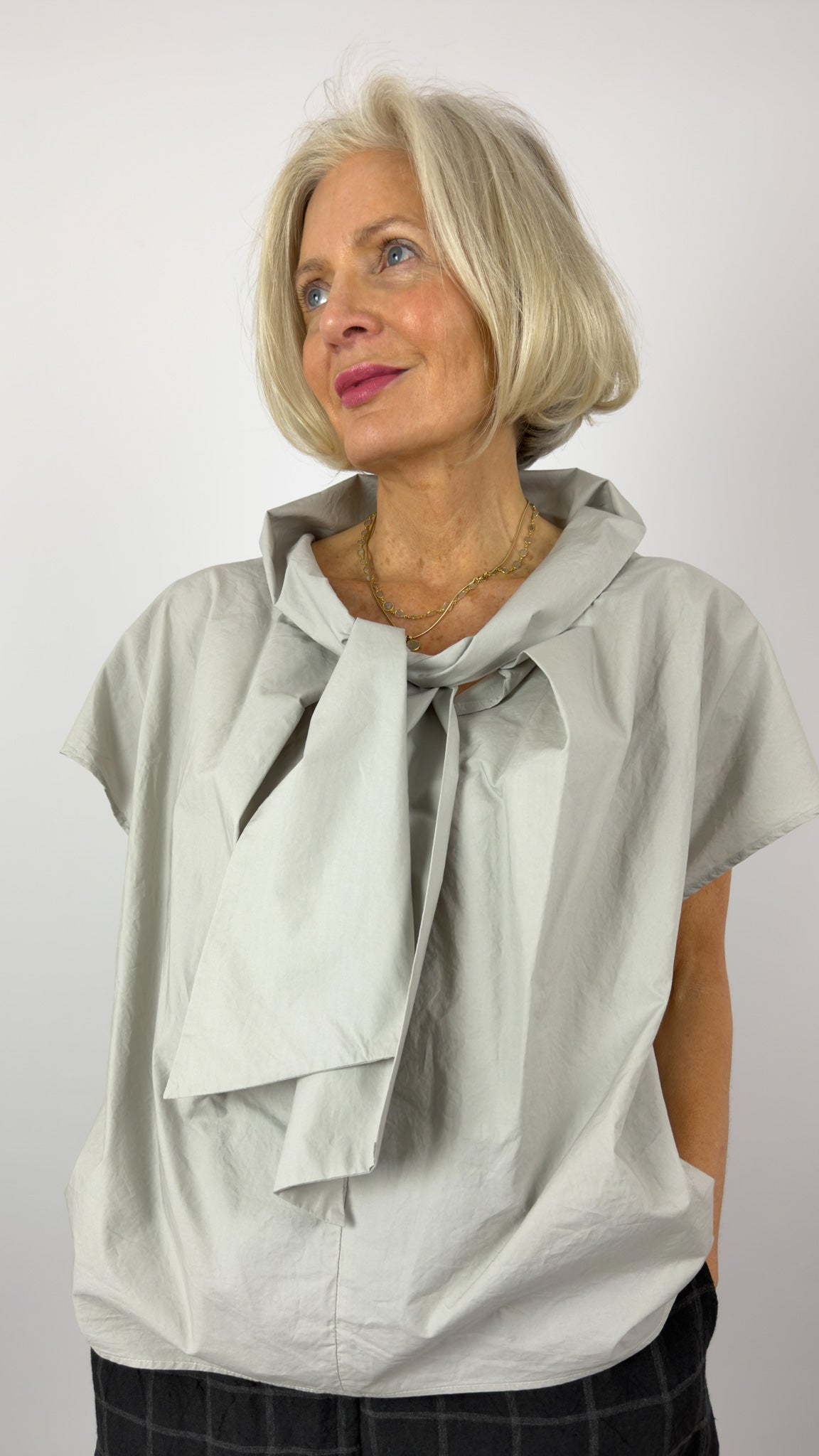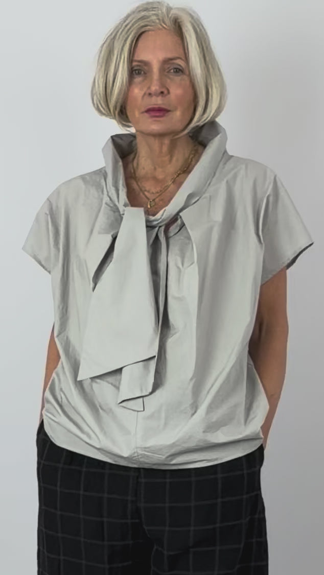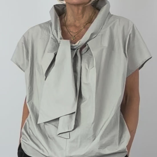 Effortlessly elegant, this crisp cotton blouse features cap sleeves and a relaxed silhouette that moves with you. The defining detail—a generous tie at the V-neckline—adds sophistication and allows you to adjust the fit to your preference. Perfect for layering or wearing solo, this versatile piece transitions seamlessly from office to weekend.