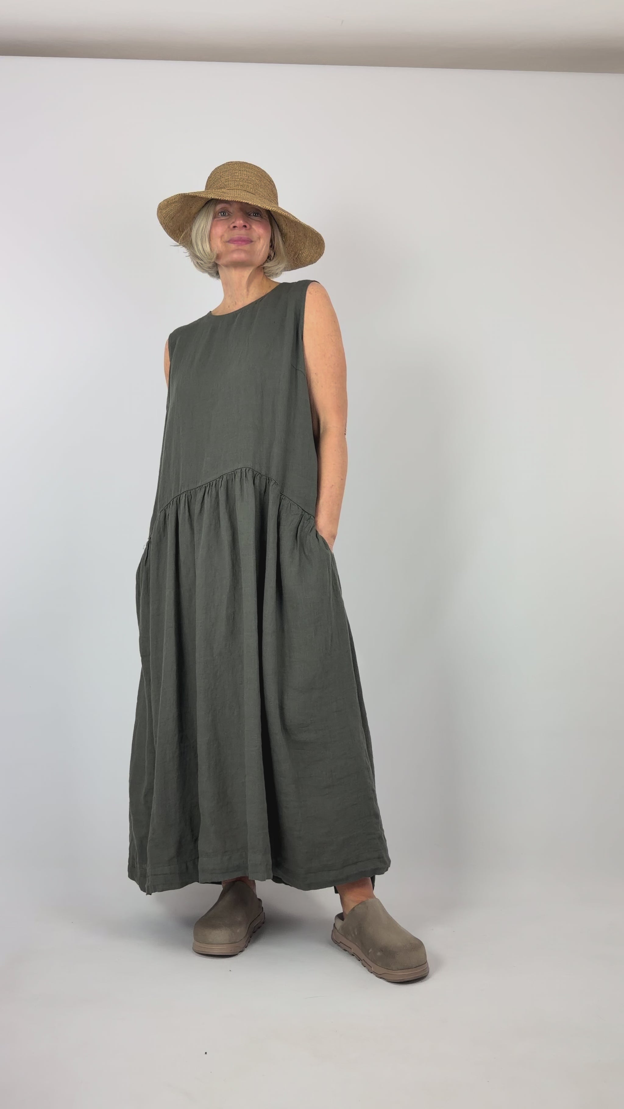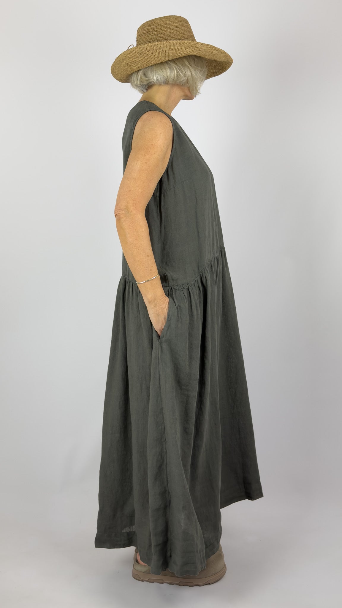 Crafted from premium linen, this full-length dress exemplifies understated elegance with its relaxed silhouette and thoughtful design details. The sleeveless cut and dropped gathered waistline create a flattering, effortless drape that moves with ease. A refined round neckline features a button fastening at the back. Ideal for warm weather occasions, this versatile piece transitions seamlessly from day to evening, offering both comfort and sophisticated style.