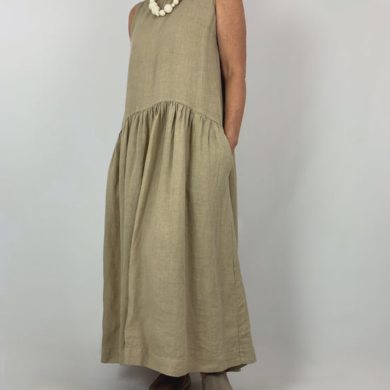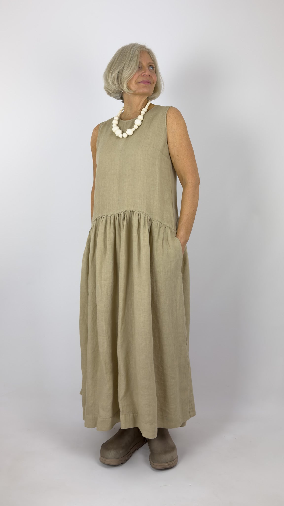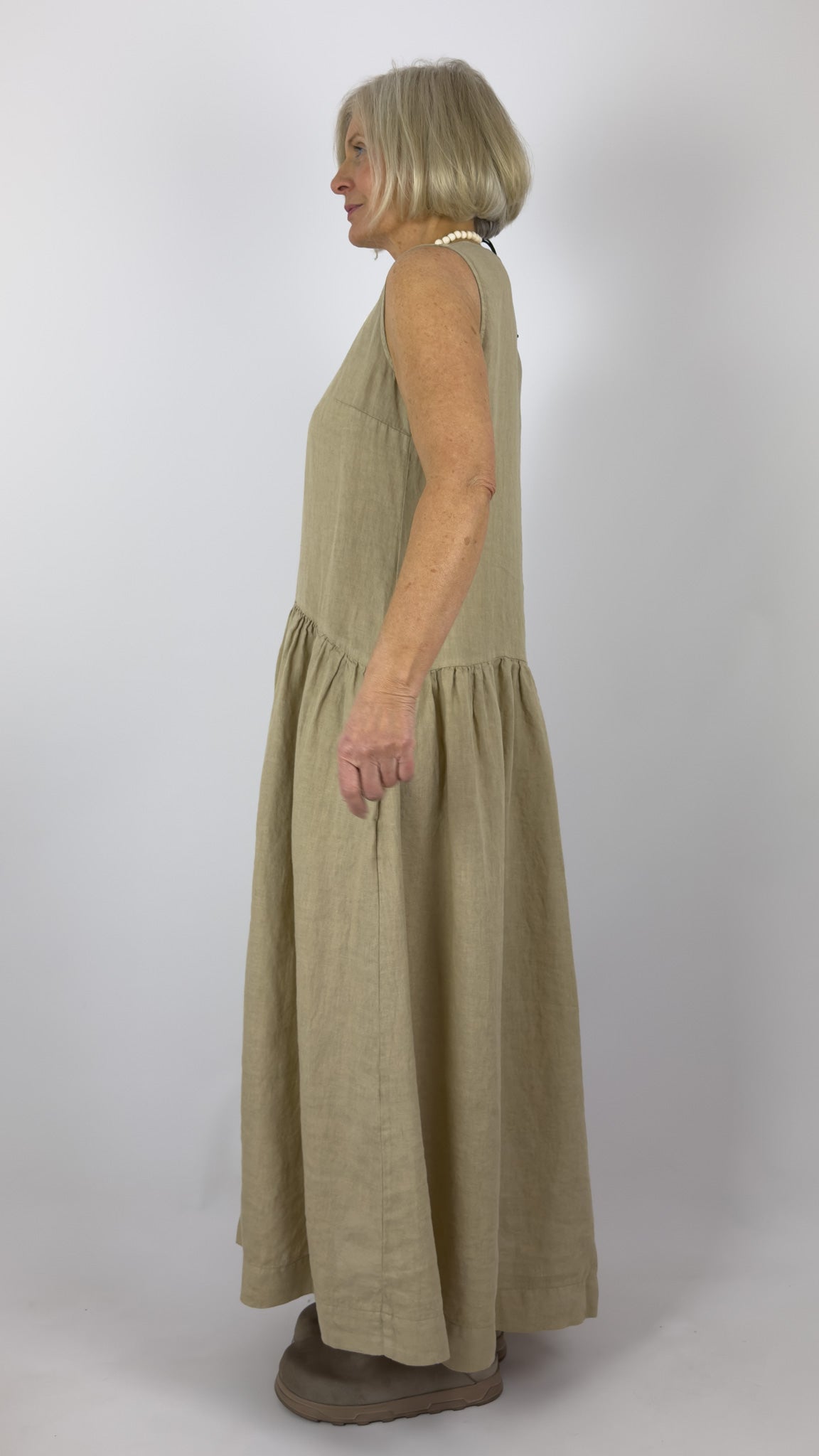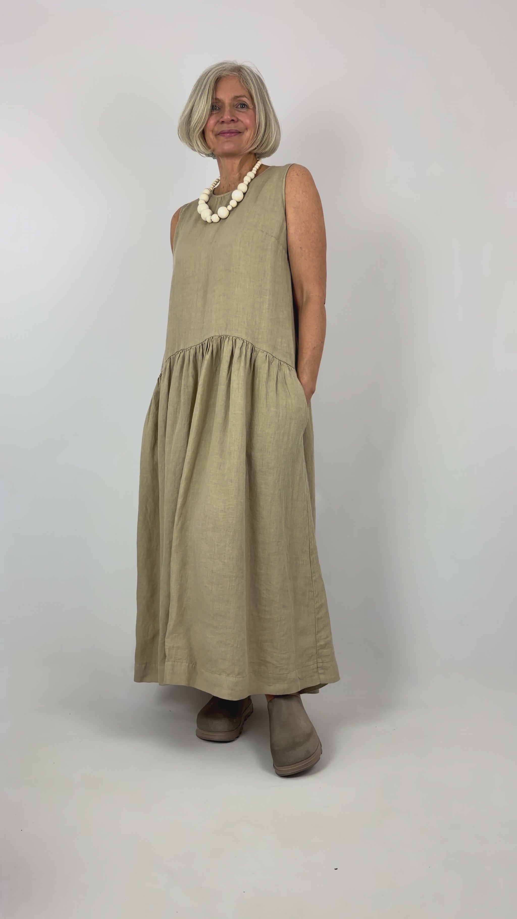Crafted from premium linen, this full-length dress exemplifies understated elegance with its relaxed silhouette and thoughtful design details. The sleeveless cut and dropped gathered waistline create a flattering, effortless drape that moves with ease. A refined round neckline features a button fastening at the back. Ideal for warm weather occasions, this versatile piece transitions seamlessly from day to evening, offering both comfort and sophisticated style.