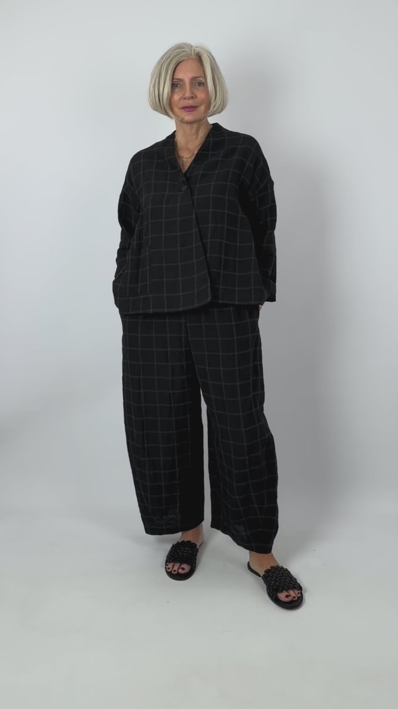 Effortlessly elegant, these Neirami trousers feature a subtle balloon silhouette that moves with you throughout the day. Crafted from breathable linen in a sophisticated black base with delicate light grey check detailing, they offer understated style with practical comfort. The elasticated waistline ensures a relaxed fit, while discreet side seam pockets provide functional convenience. Perfect for those seeking versatile separates that balance ease with refined tailoring.