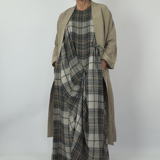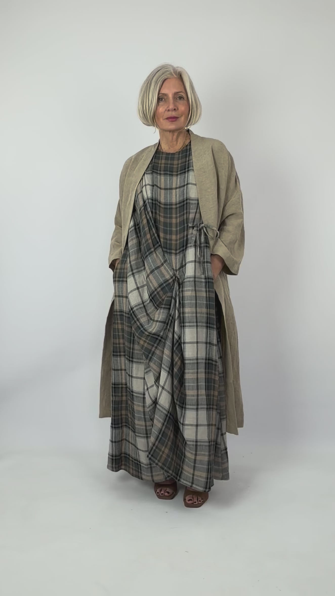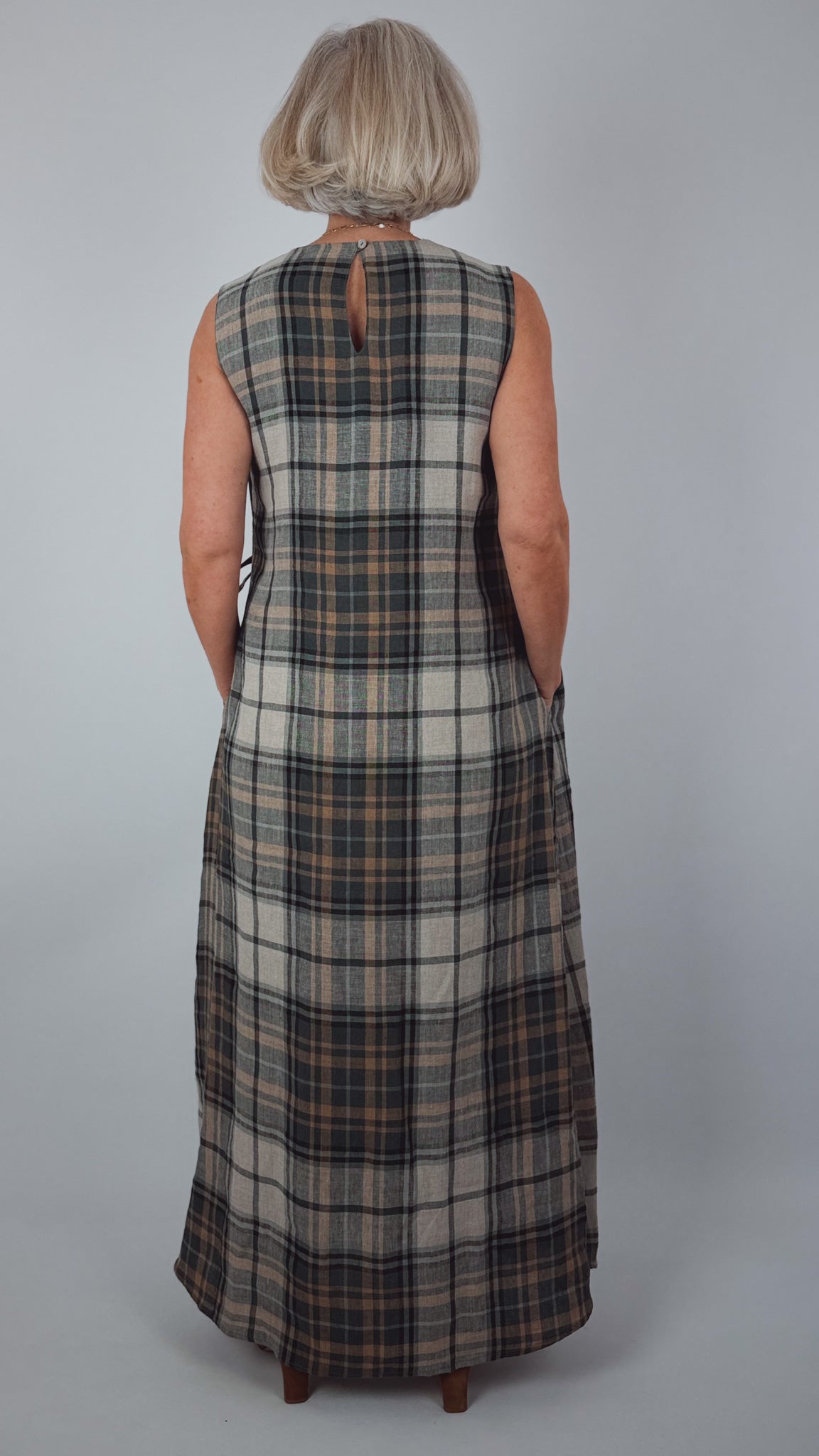 Crafted from breathable lightweight linen, this loose-fitting dress showcases a striking tartan check pattern with timeless appeal. The sleeveless silhouette features a classic round neckline, while carefully gathered and stitched detailing at the front adds sophisticated depth and movement to the design. Perfect for warm weather, this piece combines effortless elegance with thoughtful construction, offering both comfort and visual interest for versatile seasonal styling.
