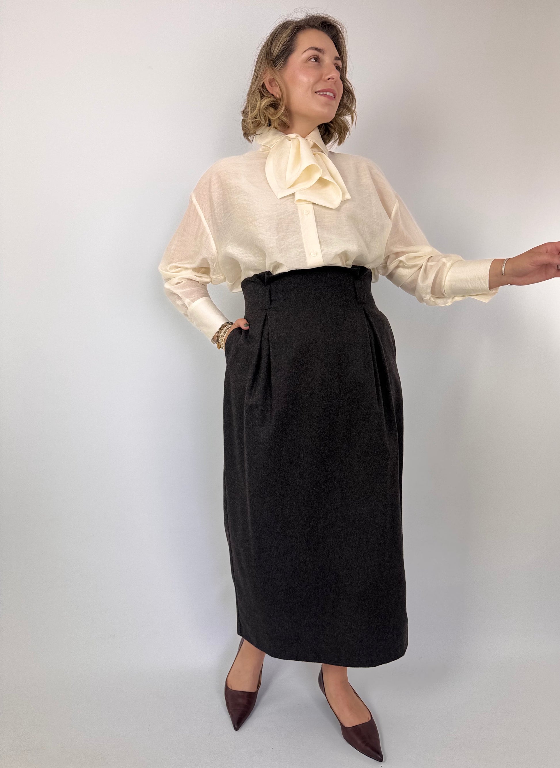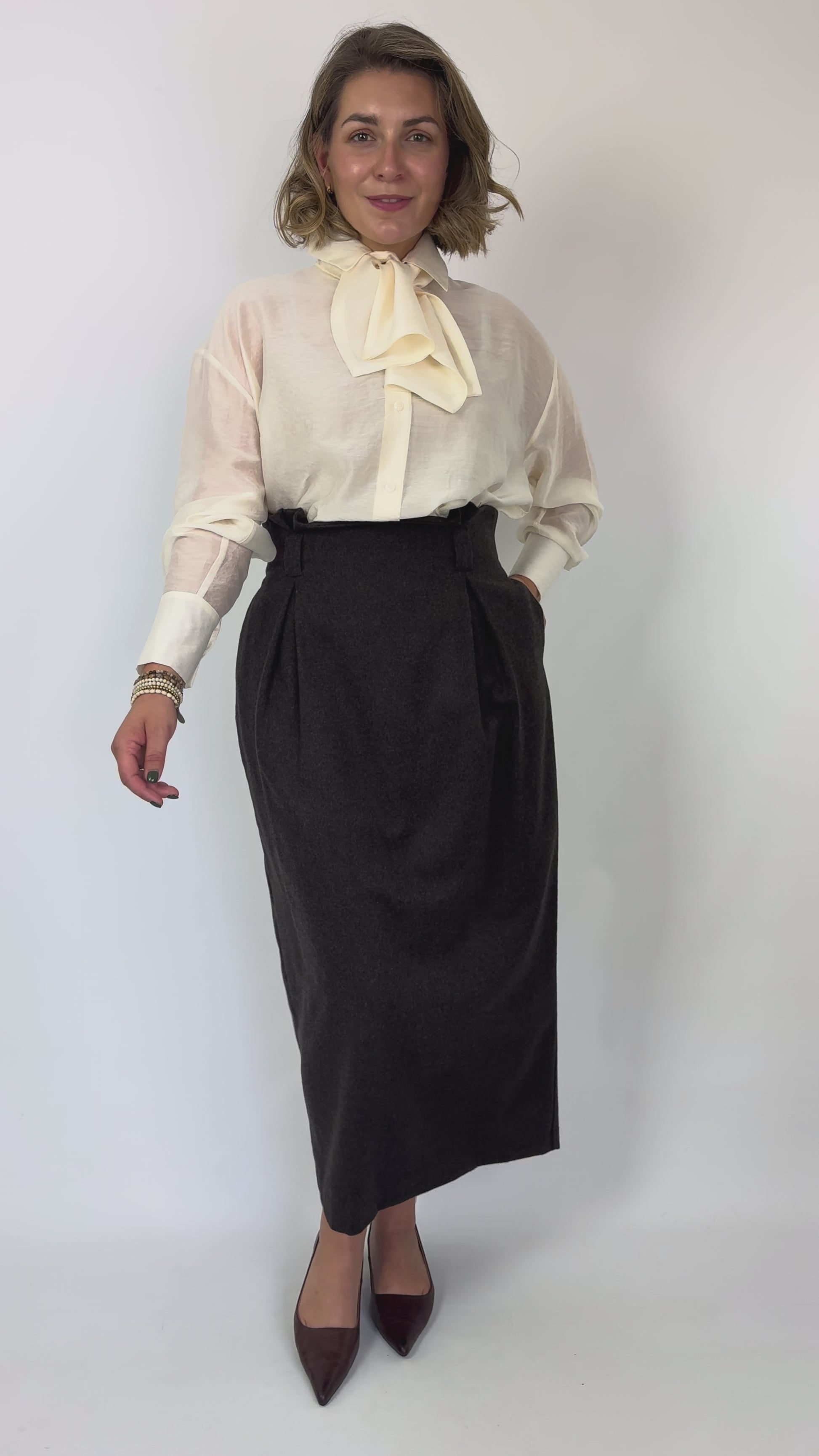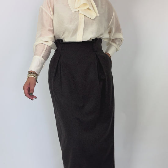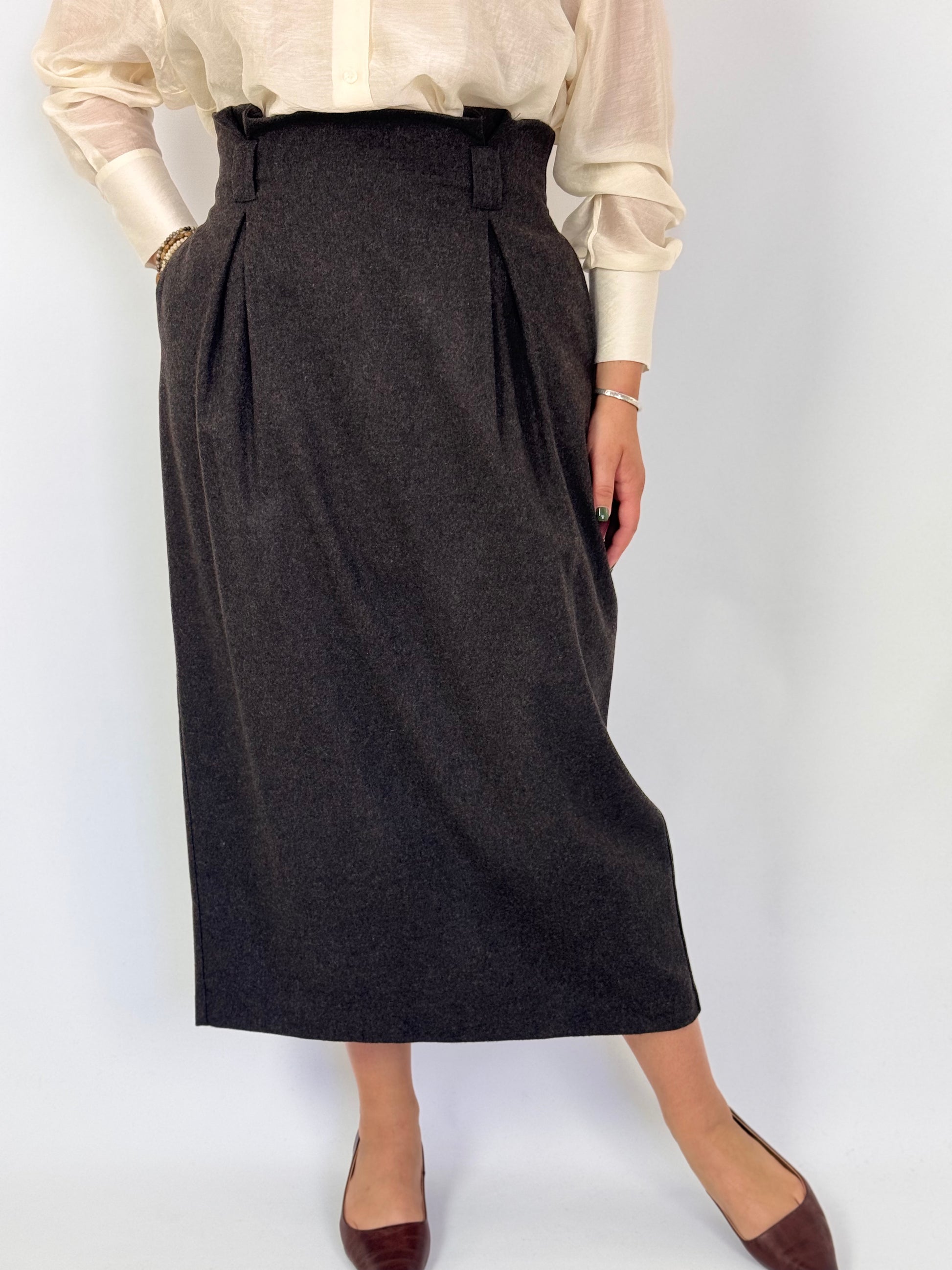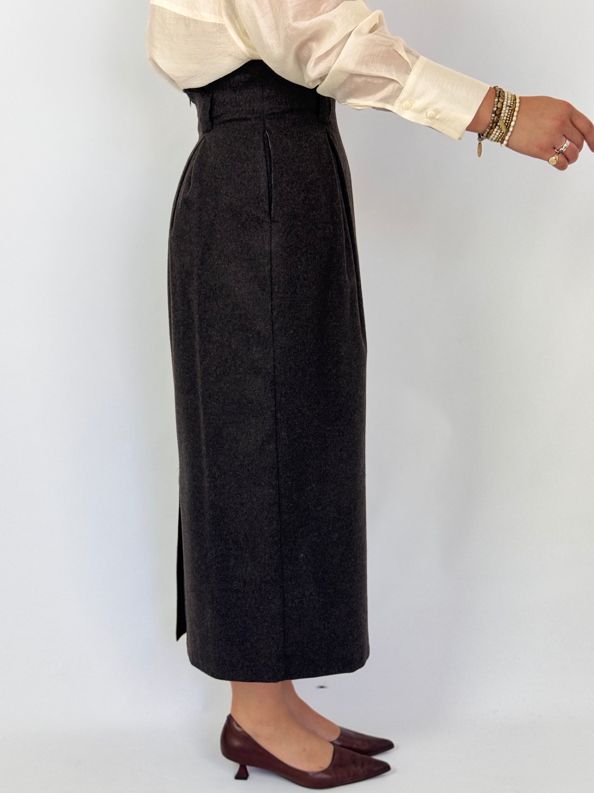 This Opificio 24MI Skirt Fondente features an elegant tulip pencil silhouette crafted from a smart wool blend for refined comfort and durability. It is detailed with subtle pleats at the top and small belt loops, enhancing its tailored look. The skirt includes a discreet zip fastening and a soft lining for smooth wear. Practical side pockets add functionality without compromising style, making it a sophisticated choice for both professional and formal settings.